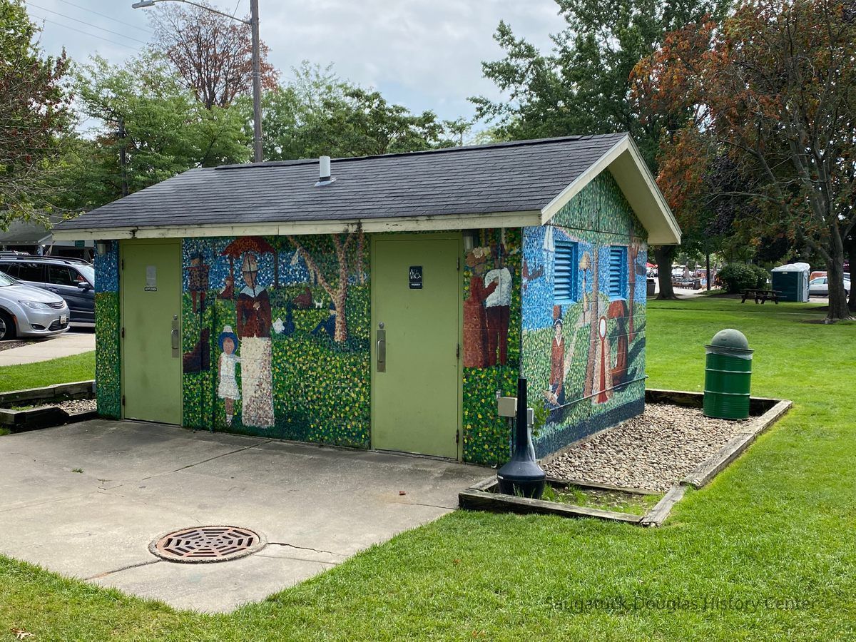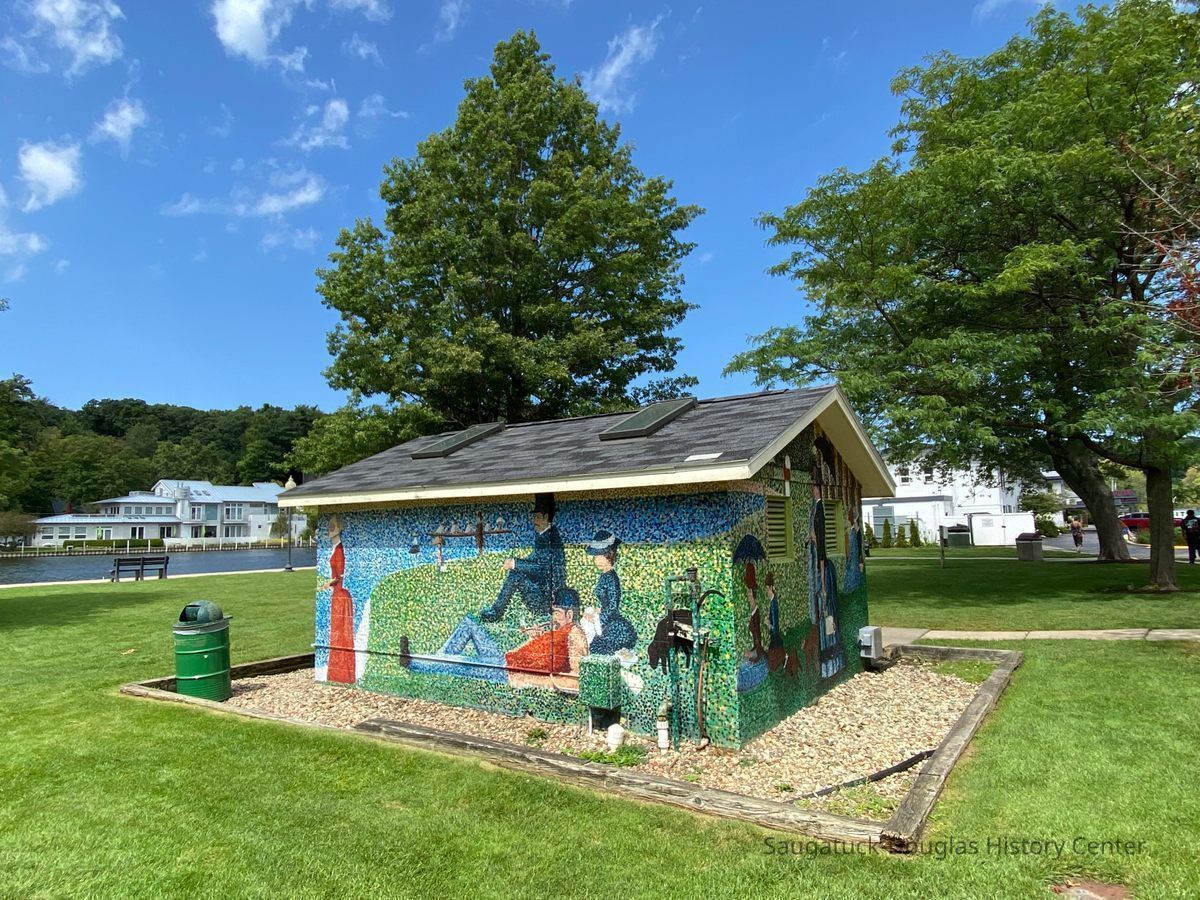 The City of Saugatuck, having constructed new restroom facilities on the Village Square, wanted to demolish the building in the spring of 1999, but responded to public outcry and preserved the painted structure, even remodeling and improving the facilities it contains. The painting was retouched again this spring by the advanced art students of Saugatuck High School under the direction of teacher Christa Wise. The Village of Douglas, not to be outdone, commissioned high school art students Aron Lowe and Ali Jakobson to paint Seurat's "Bathing, Asnieres" on the pump house in the village park on the Kalamazoo River at the foot of Center Street. It was completed in July of 1999.