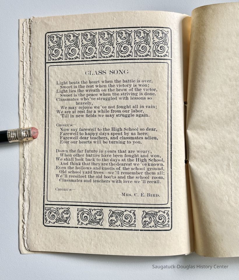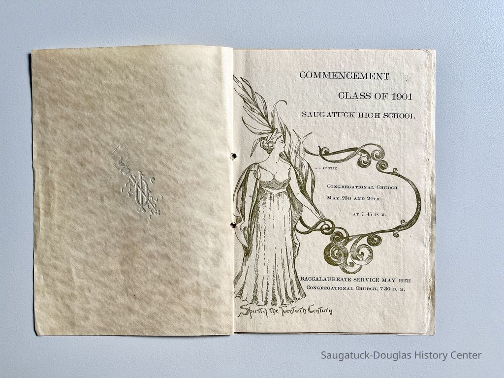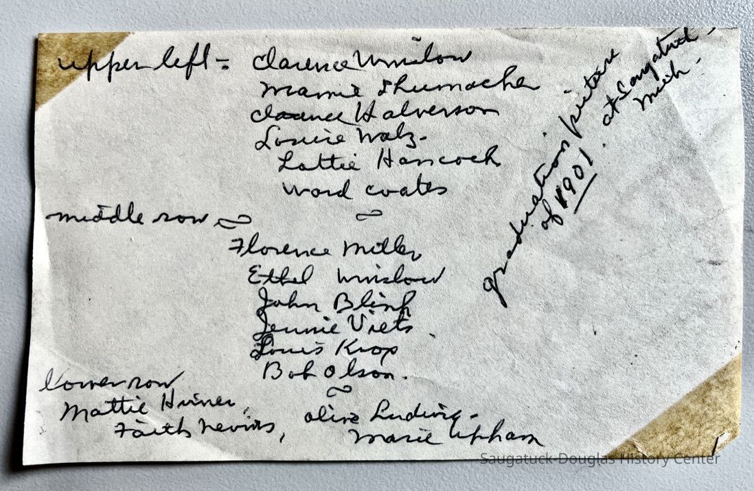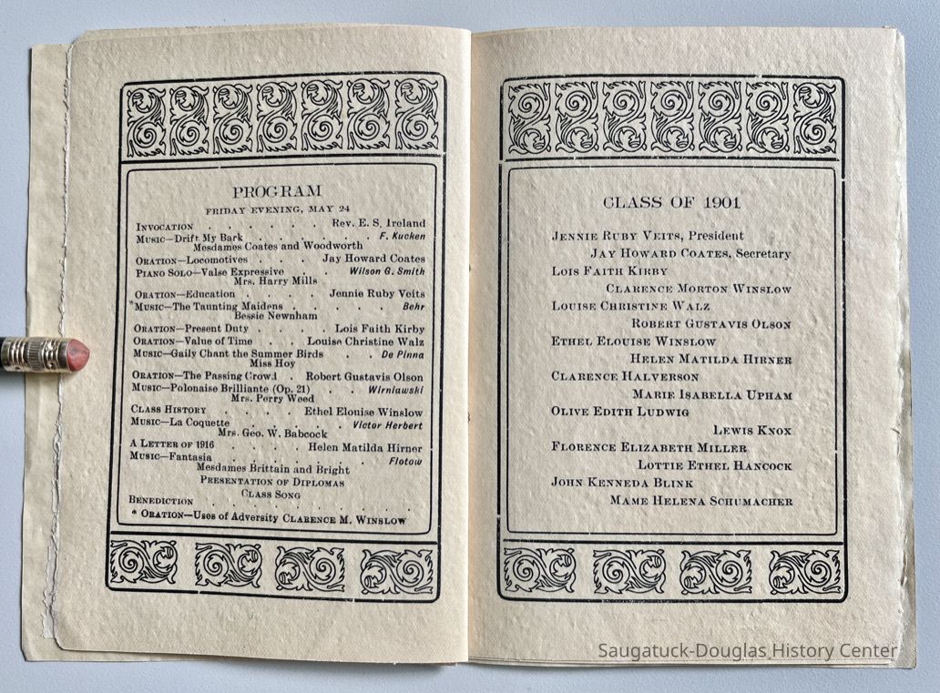 Article about the graduation by Chris Yoder from the May 2016 SDHC newsletter — The graduation exercises for the Saugatuck High School Class of 1901 was held May 24, at the Congregational church atop the hill in Saugatuck. Sixteen graduates were joined by an enthusiastic crowd. Class President Jennie Veits, presented an oration entitled "Education." Class Secretary Howard Coates, gave one on "Locomotives." The other class members were Clarence Halverson, Marie Upham. Olive Ludwig, Lewis Knox, Florence Miller, Lottie Hancock, John Blink, Mame Schumacher, Clarence Winslow, Faith Kirby, Louise Walz, Robert Olson, Ethel Winslow, and Mattie Hirner (many of these Saugatuck surnames are still recognized today). Jennie Veits was to marry James Brown and to become the mother of the late Bee Finch. Clarence Halverson was the son of a Great Lakes pilot. Clarence Winslow was to become the father-in-law of Frank Denison of Broward Marine fame. Faith Kirby Nevins was to turn her family home into the first local hospital (today "The Kirby House"). At least seven of these folk rest in Riverside Cemetery. Two of these are the first and last class members to pass away: Marie Upham, who married John R. Moyer and died at age 37 in 1912 leave two young daughters; Olive Ludwig, who married Ira Koning and lived to the ripe old age of 97, dying in 1981. In an article entitled "Honors Won at Labor's Care," the May 31st issue of THE SAUGATUCK COMMERCIAL reported "Lack of space forbids anything like a detailed account of the program each evening, and as to the orations, all that we will say is that the twentieth century class has added new laurels to our high school and earned for itself well deserved honors. Prof. Latta is not to be blamed for feeling proud of this class. Each theme was handled in a manner that showed careful and well-directed thought. One amusing fact was brought out by the class historian, as follows: The oldest member of the class is Clarence, the youngest, Clarence; the tallest member Clarence; the shortest Clarence; the heaviest member Clarence, and the lightest Clarence. Of course there are two Clarences - Winslow and Halverson." The writer continued with praise for the quality of local education, saying "There is probably no school in Western Michigan that graduates a larger per cent of its students, and we doubt if there is another that has turned out the same proportion of successful teachers. While this is due in a large measure to the earnest work of Prof. Latta, we must not forget that the education of the pupil begins in the primary department, and if the work in that and each of the succeeding departments was not faithfully done such good results could not come from the High school."