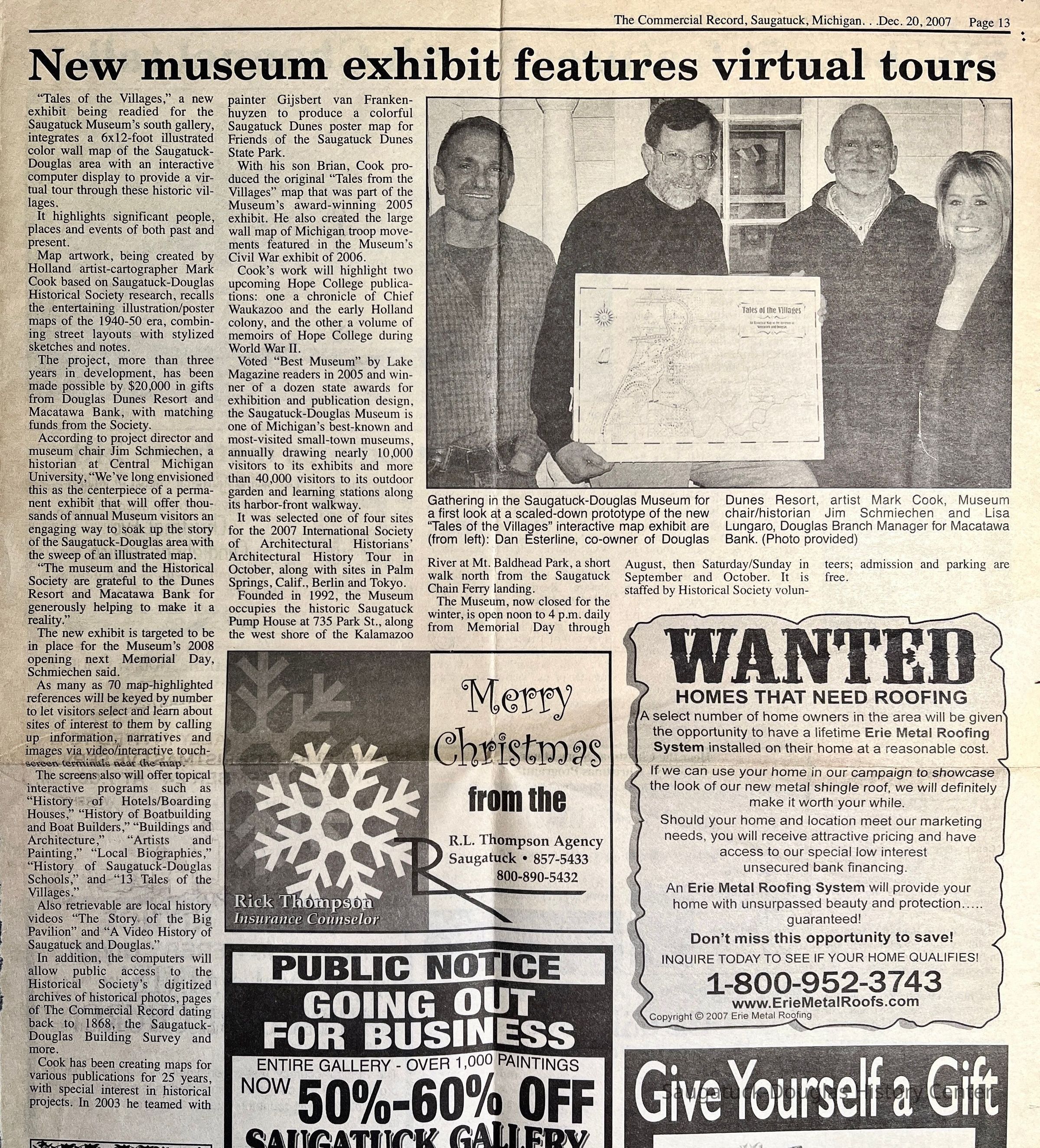 From https://mysdhistory.org/history/projects/supermap/ “SuperMap” is a 6-foot high, 12-foot wide illustrated color wall map of the Saugatuck-Douglas area integrated with a computer display to provide a virtual tour through the historic villages, highlighting significant people and places, past and present. Map artwork, created by Holland artist-cartographer Mark Cook based on History Center research, recalls the entertaining illustration/poster maps of the 1940-50 era, combining street layouts with stylized sketches and notes. More than three years in development, this project was made possible by gifts from Douglas Dunes Resort and Macatawa Bank totaling $20,000, with matching funds raised by History Center members and friends. Over 100 map-highlighted references are keyed by number to let visitors select and learn about sites of interest to them by calling up information, narratives, and historical photographs on an interactive computer terminal near the map. The original map is in the South Gallery at the History Museum. There is a copy in the Map Room at the History Center. Project credits Concept and text: James Schmiechen, with Kit Lane Data Input and Research: Dick Haight and Jack Sheridan Map Design & Illustration: Mark Cook, with Brian Cook Digital Production: John Capatosto for Agio Imaging, Inc. Corporate Underwriters: Dunes Resort and Macatawa Bank