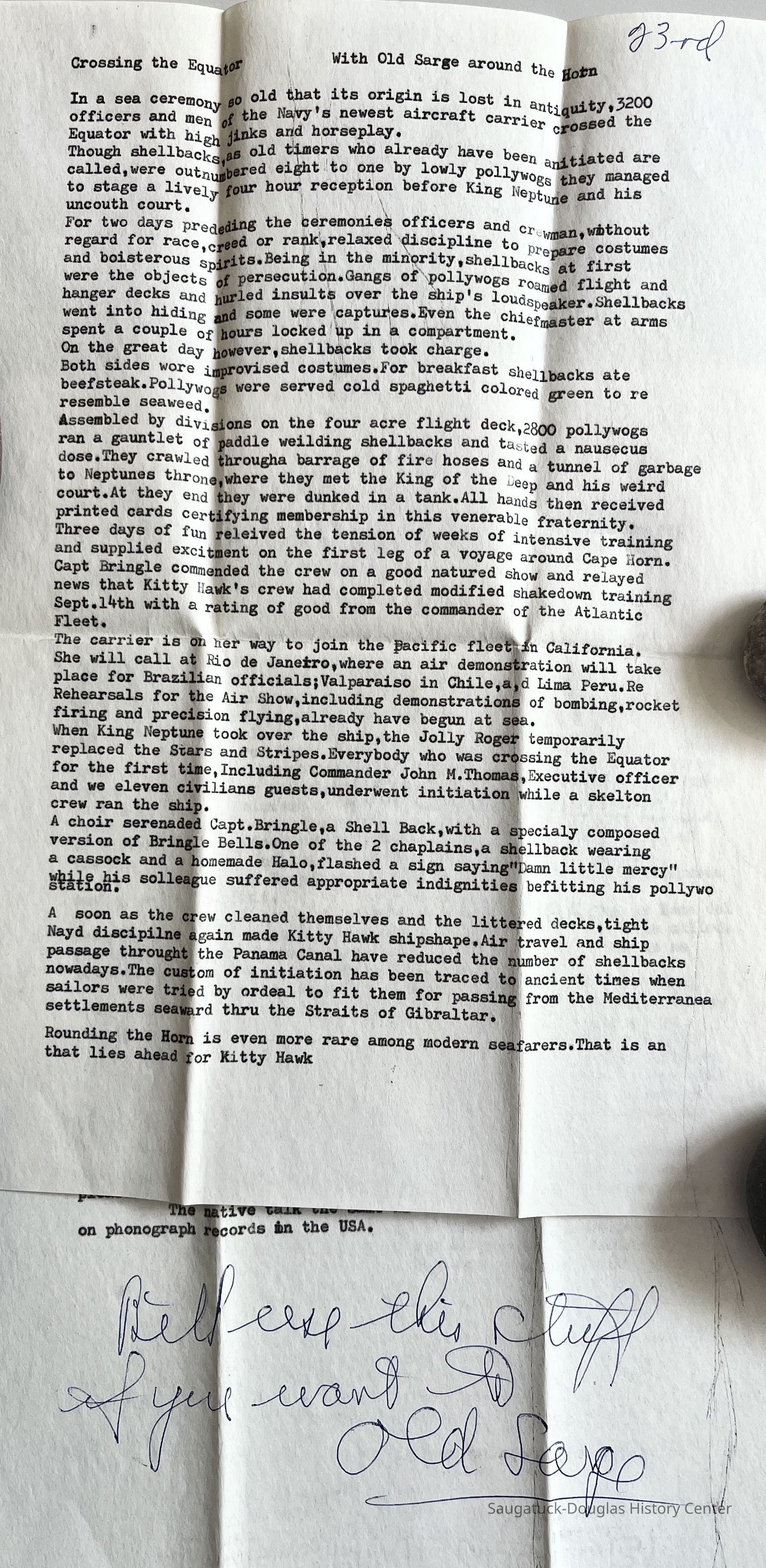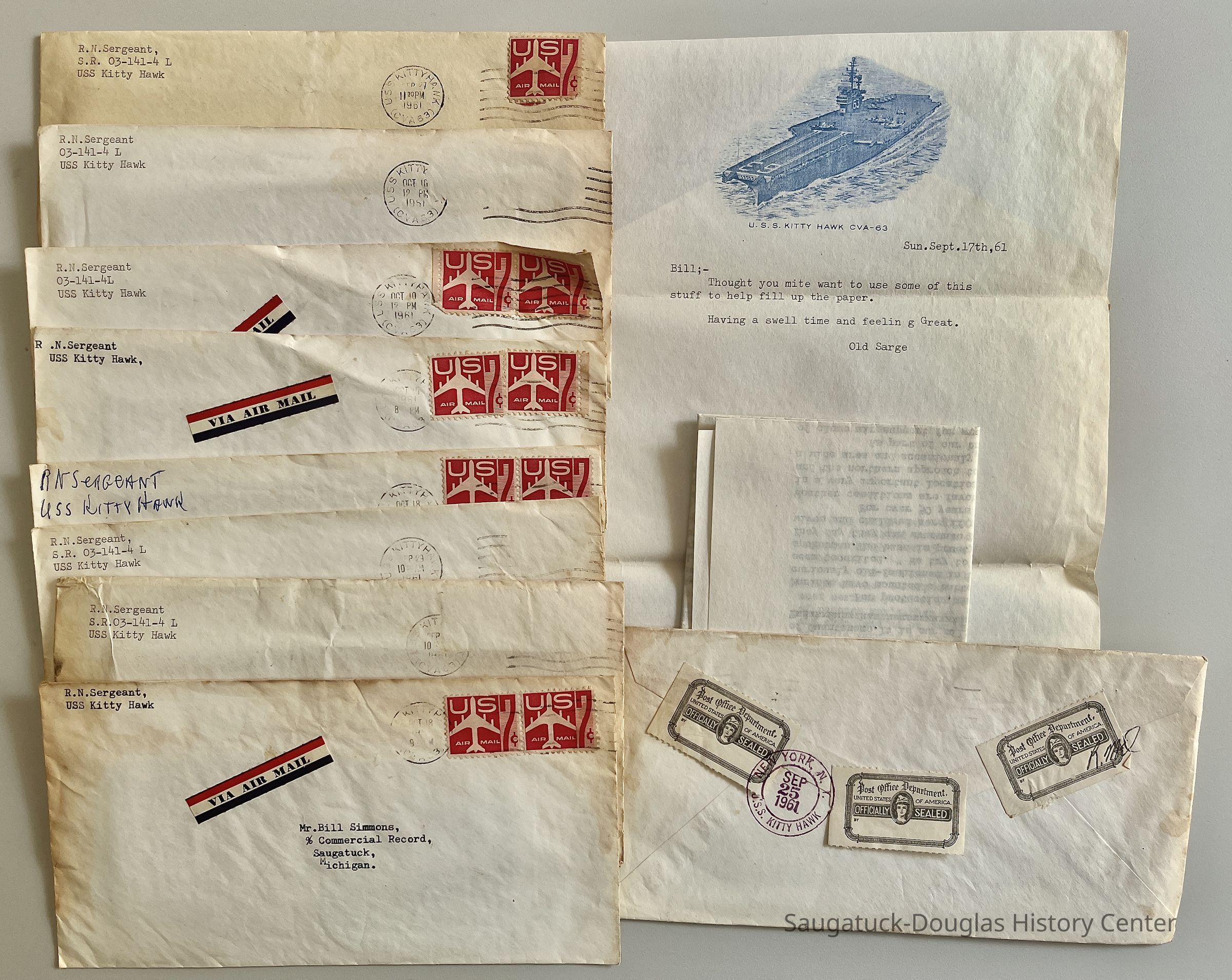 Ten envelopes and letters to Bill Simmons from "Old Sarge" aka R.N. Sergeant, mailed from the U.S. Navy USS Kitty Hawk in 1961