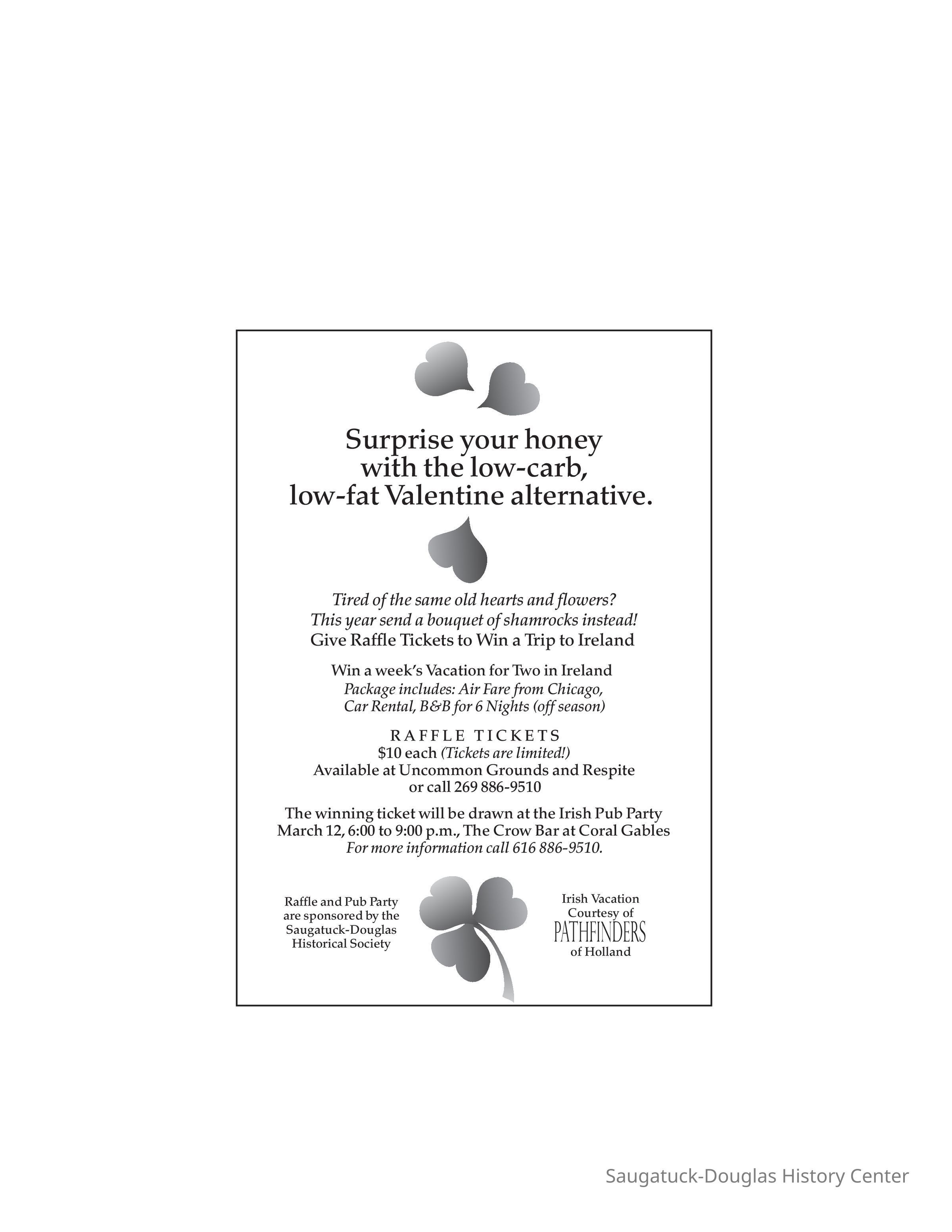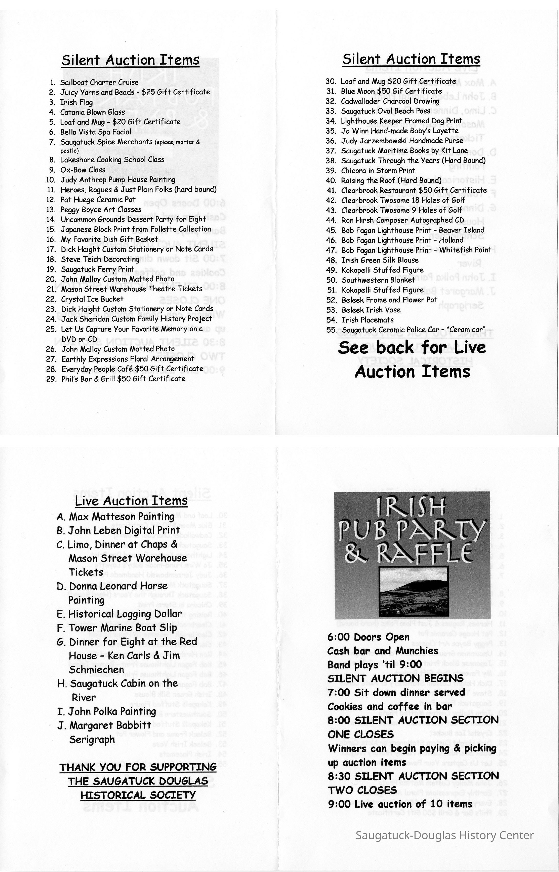 Earthly Expressions.jpg 2004 St Pats poster.jpg Auction Items A copy.psd Auction Items A.jpg Auction Items B.jpg Auction items insert.jpg Auction items text.jpg AUCTION text.doc auction.jpg band.jpg barFlies.jpg Blue Moon.jpg buffet1.jpg buffet2.jpg Cadwallader.jpg Ceramic car auction item.jpg Clearbrook.jpg Douglas heat bill.jpg Everyday People Cafe.jpg JudyGrp.jpg Juicy Yarns.jpg Lakeshore cooking school.jpg Loaf and Mug.jpg Mason St Warehouse.jpg My Favorite Dish.jpg Oval Beach Pass 2004.jpg Oxbow.jpg Pat'sPubPty_2x6ad.jpg Pat'sPubPty_2x6ad.pdf Pat'sVD_2x6ad.jpg Pat'sVD_2x6ad.pdf Phils.jpg Pub Party 04 program.jpg Pub party auction placard.jpg Pub party book images.jpg Pub Party poster 3-4-04.jpg Raffle Irish Tour.jpg Richardson.jpg SDHS April 2003 Brd Minutes.jpg SDHS Articles & ByLaws.doc Sweet Water Charters.jpg Tower Marine.jpg Uncommon Grounds.jpg Wrights pavilion 1937.jpg