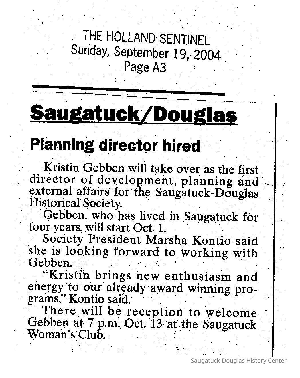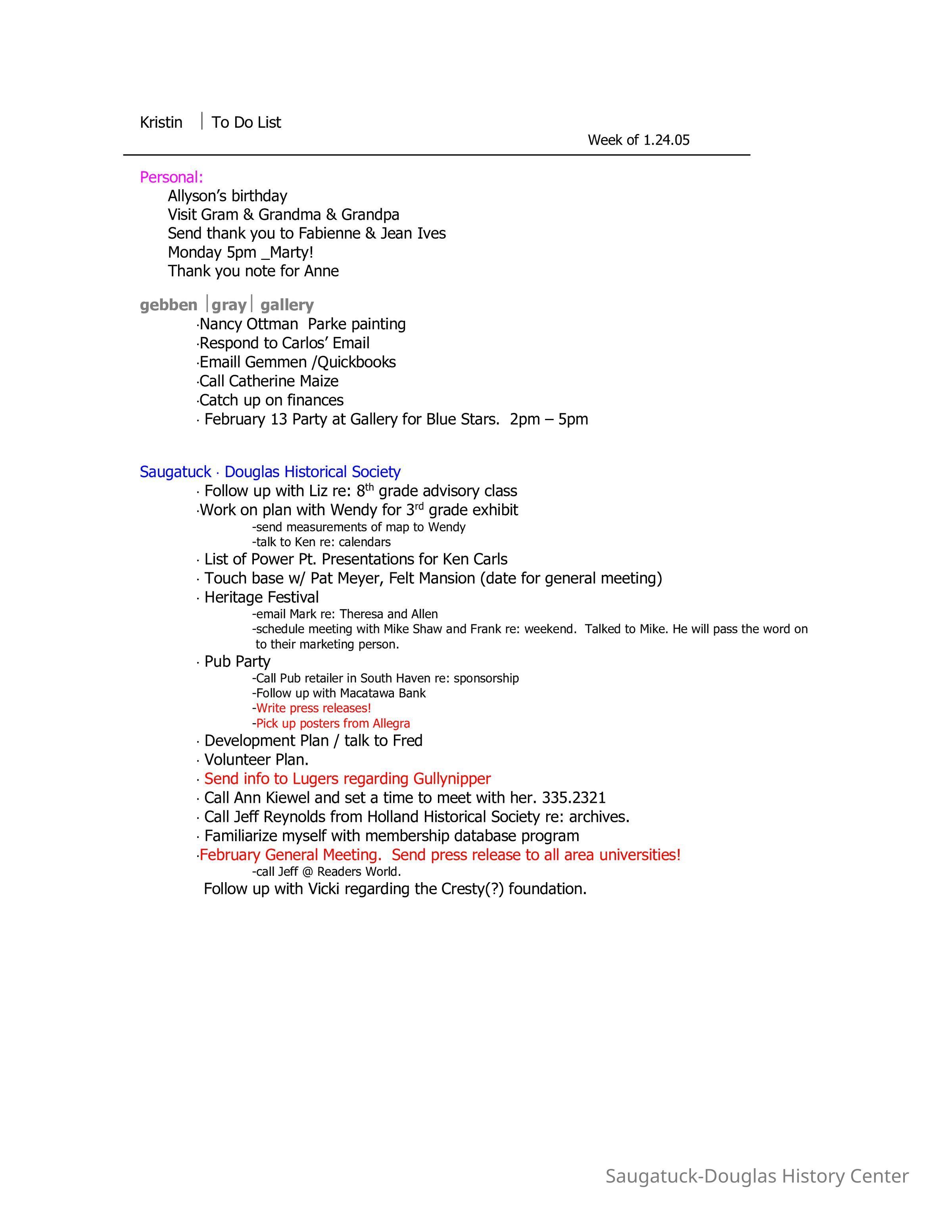 Most of this CD is data about the Gebben.Gray Gallery in Fennville that was owned by Theresa Gray and Kristin Gebben that was at 120 East Main St., Fennville. (Root in 2023) The documents about the SDHC are often the beginnings of lists. Email re Fall Appeal.doc Art Appreciation '04.doc Brent & Kristin House Gebben.Gray Gallery Inventory Journeyman tags.doc Kelly Burns Mack Baby Shower.doc Kristin Personal SDHS Boat Desktop.ini Expense Report SDHS Expenses.xls Fall Appeal Fall Appeal Outline 2004.doc Grants Cool Cities Grant.doc Grant writing resources.doc Promo Video.doc Heritage Festival '04 Budget Arts&Crafts Exhibit '04.doc Desktop.ini Letter to editor '04.doc Meetings with Board Members Dawn Schumann.doc Dick Haight.doc Jack Sheridan.doc Jim Schmiechen.doc John Malloy.doc Judy Mauger.doc Ken Carls.doc Ken Gold.doc Marsha.doc Mike Phillips.doc Peg Sanford.doc Questions for SDHS Board Members.doc SDHS Contacts.doc Museum Museum Exhibits.doc Old Schoolhouse Prograim Chair.doc Pub Party SCA Exhibit Space School Partnership SDHS Hours October 2004.doc Underwriters.doc Visitors Guide Saugatuck Douglas Visitors Guide and Directory.doc SDHS Volunteer Hours Worksheet Clipboard.doc SDHS Volunteer Hours Worksheet.doc Volunteer Organization Chart.doc