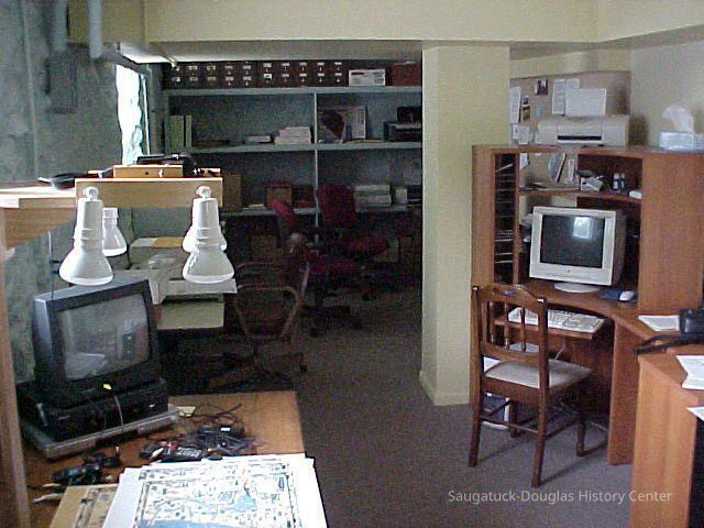 History mysteries photos and webfiles, historic photos, photos used to produce postcards for the museum shop, photos of the August 2014 members picnic at Mt. Baldhead pavilion, Inventory photos of the tech center when it was in the lower level of Dutcher Lodge/Douglas Village Hall, Big Pavilion VHS tape label.
