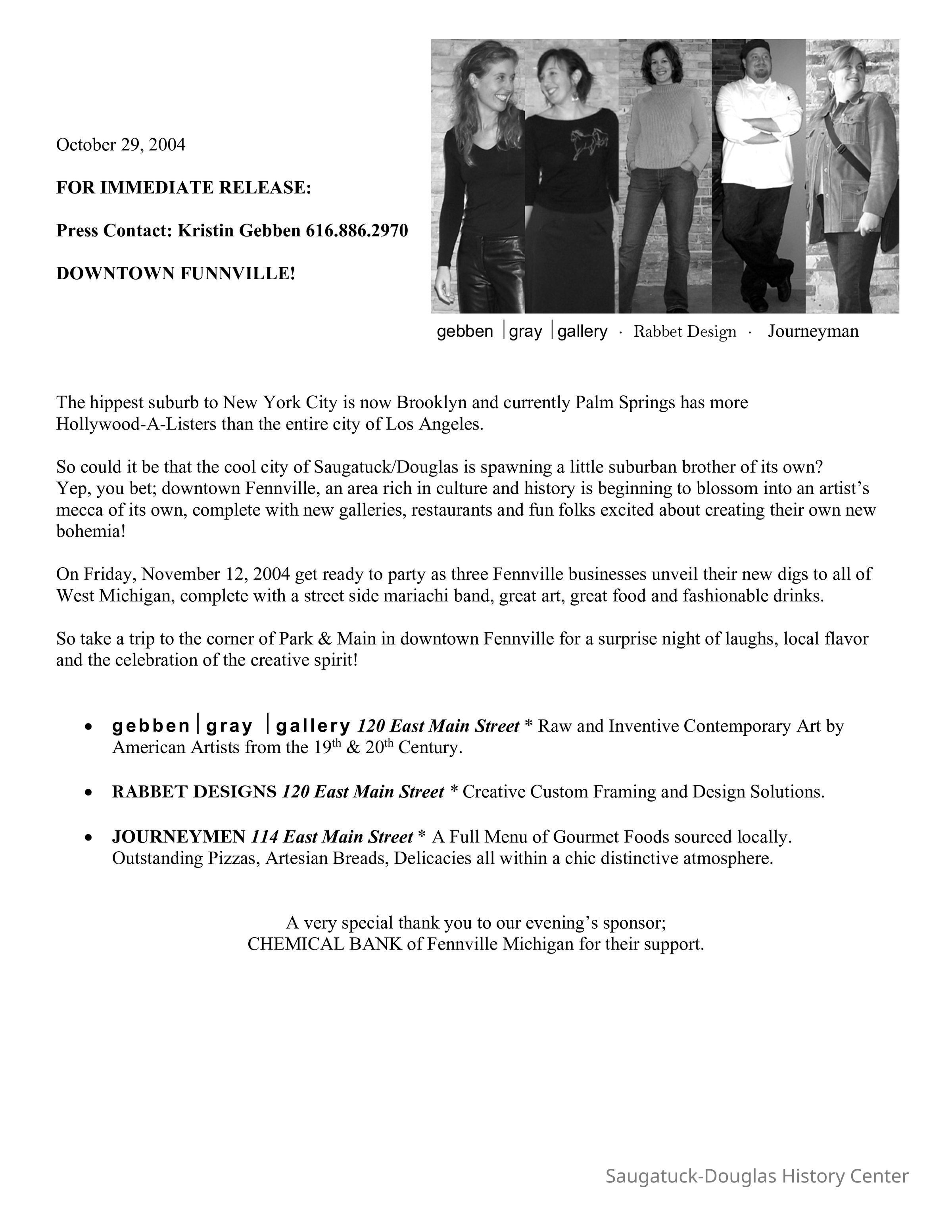Johnn Malloy press release documents, mostly TIF and DOC Files. These are the original files of print outs in the Johnn Malloy PR brinders 2023.06.09. hj37b(7.29.04)Chapel-CR SDHS 2004 jem2 hj31(7.1.04)TheHaps hj32(7.1.04)JlyMeeting hj32a(7.10.04)L.ChapelHSN hj32b(7.31.04)L.Chapel-CR hj33(7.7.04)Tue3-Lane hj33a(7.7.04)PicCptn hj33b(7.15.04)Squaw-CR hj34a(7.14.04)PicCptn hj34b(7.22.04)MillarsCR&LO hj35(7.14.04)HeriFestPlans hj35b(7.29.04)HeriFest-CR hj36(7.14.04)CalendarRedo hj37(7.21.04)Tue5 hj37a(7.21.04)PicCptn hj38(7.21.04)MuseumIntern hj38a(7.29.04)Intern-CR hj39(7.28.04)Tue6-Burr hj39a(7.28.04)PicCptn hj39b(8.5.04)Burr-CR hj40(7.28.04)AugMeeting hj41a-Durham.jpg hj41b(8.11.04)Gift-HSN hj41c(7.29.04)Gift-CR hj42(8.3.04)SproulsClass hj42a-Sprouls.jpg hj42b(8.12.04)Kids-CR hj42c(8.14.04)Kids-HSN hj43(8.3.04)Tue7-Tree hj43a-Tue7 PicCptn hj44(8.11.04)Tue8-Bleeker hj44a(8.19.04)Heath-CR hj45(8.25.04)SepMeeting hj45a(9.2.04)Sep-CR&HSN hj46(9.8.04)Museum hj46a(9.16.04)FallHrs-GRP hj46b(9.23.04)FallHrs-CR hj46c(9.23.04)Fall-HSN hj46d(10.3.04)MusFall-GRP hj47(9.8.04)KidsSpecial hj47a(9.23.04)Kids-HSN hj48(9.8.04)CroquetTourney hj49(9.10.04)RiverFire hj50(9.17.04)New hire hj50a(9.19.04)GebbenHire hj50b(9.22.04)Gebben-LO hj50c(9.31.04)Gebben-CR hj51(9.28.04)OctMeet hj51a(9.31.04)OctMeet-CR hj51b(10.3.04)OctMeet-LP hj52(10.6.04)PubPlan