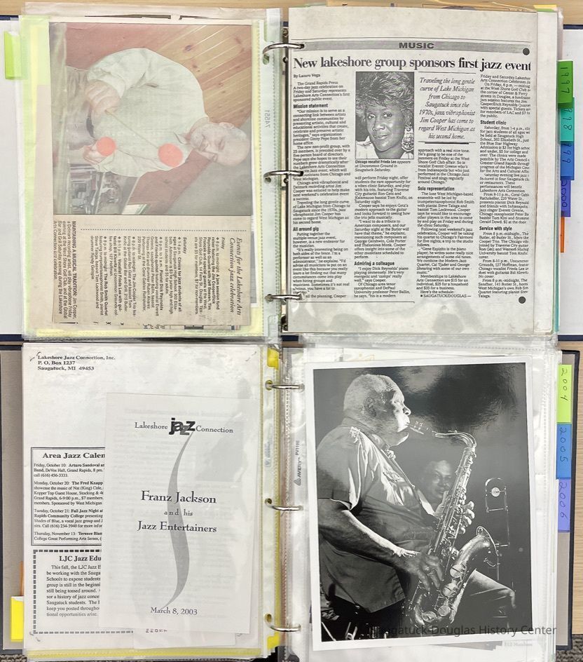 Items mounted on acidic "magnetic" photo album pages (with a wax surface and acetate topper) have been removed from the pages and placed in archival sheet protectors in the same locations in the binders. Originally, this material was in three binders. Removing the non-archival pages decreased the bulk of the pages to fit in two binders.