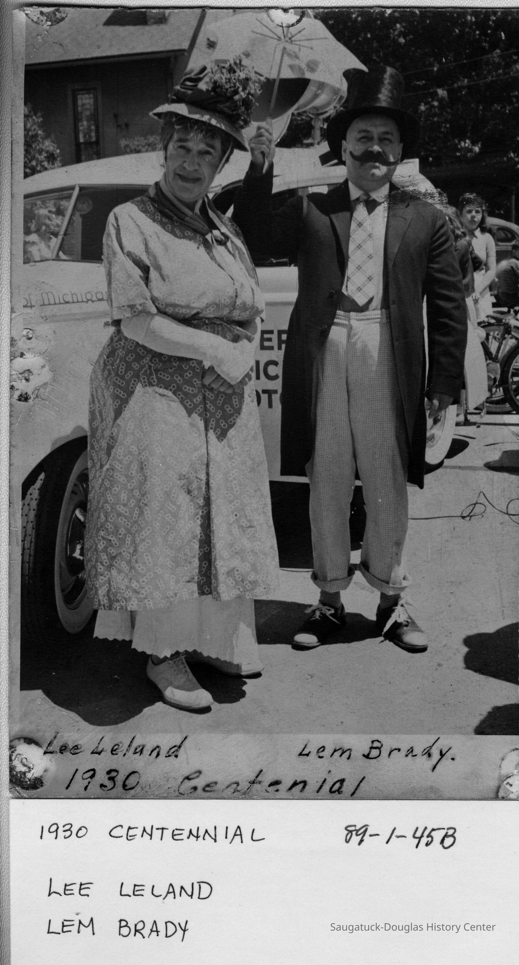 Photo marked 1930 Centennial Lee Leland and Lem Brady. Both men are comically dressed in old-timey costumes for a parade. Merchant and innkeeper Lee Leland is in drag, dressed as a woman with an exaggerated bust and floral hat. Banker Lemuel Brady has an oversized mustache and an undersized umbrella.