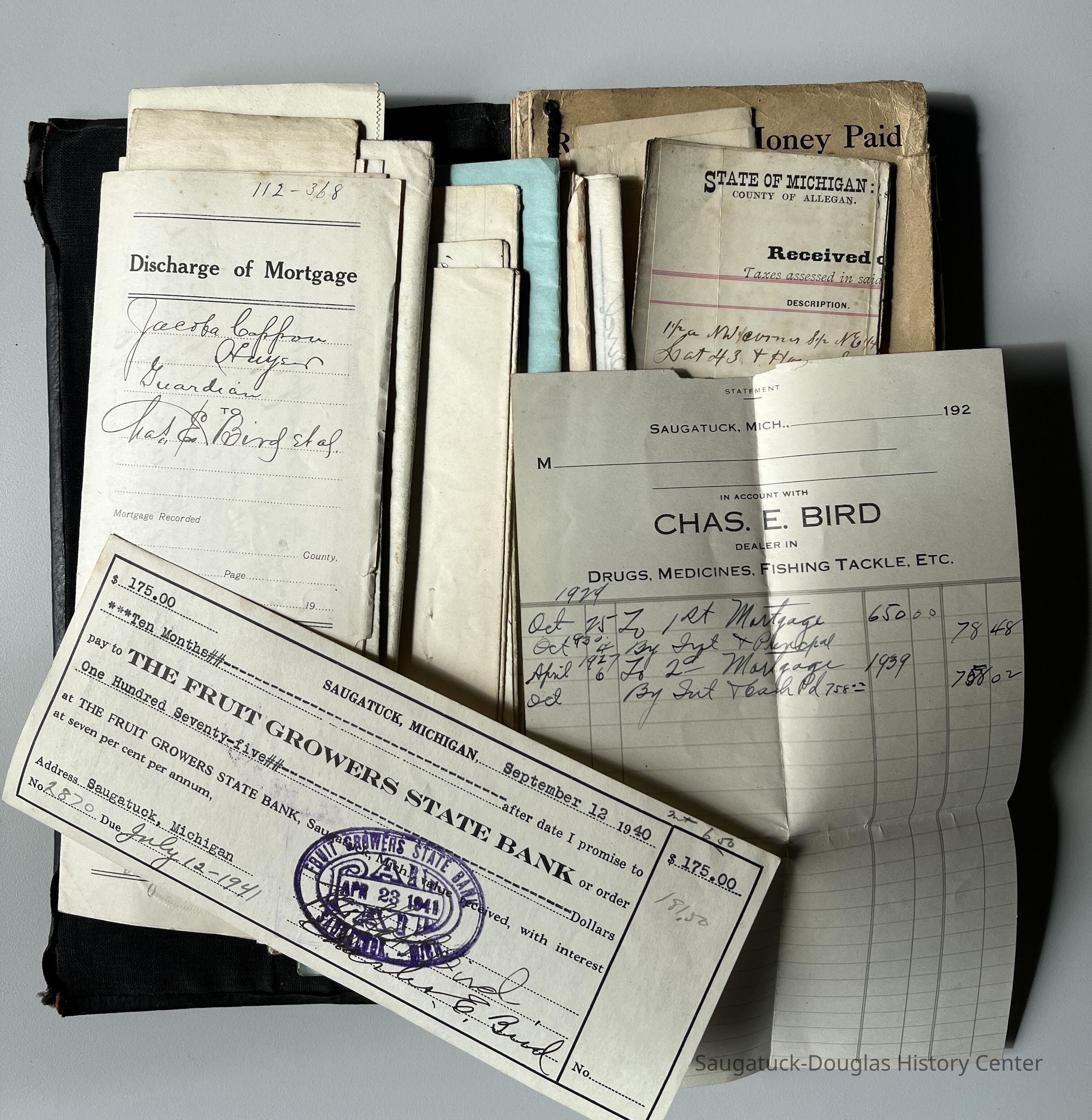 Charles E. Bird was an important early Saugatuck businessperson with interests in Bird's Drug Store and Rogers and Bird shipbuilders. These documents give a sense of his complicated world including loans to other businesspersons and transactions with family members.