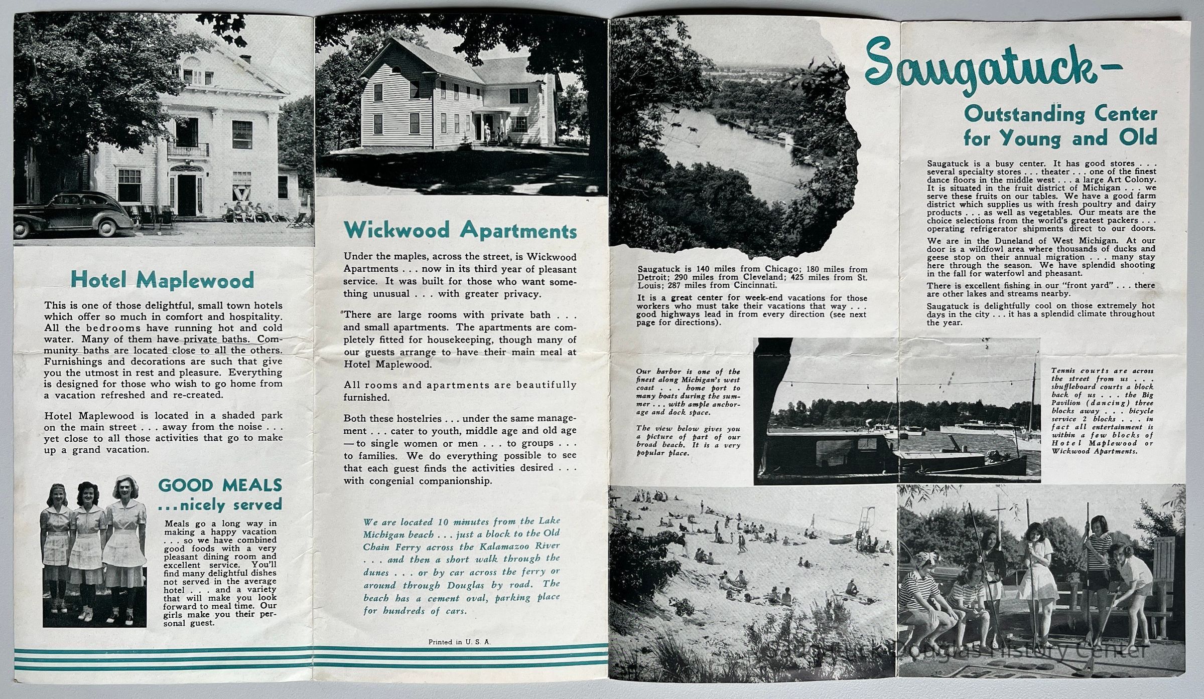 Four-fold brochure with additional War-time Rest flyer attached inside. Printed with black and teal-green ink. One page is devoted to Wickwood Apartments, which were located in the Frank Wicks residence at 510 Butler Street. The brochure text promotes Saugatuck tourism in general and includes photos of girls playing shuffleboard and Oval Beach. Map and text describe ways to travel to Saugatuck. Tiny type on bottom of "Things to Do" panel states "Gentiles Preferred"