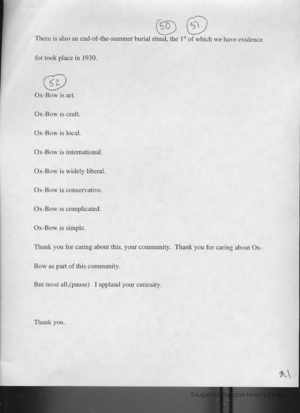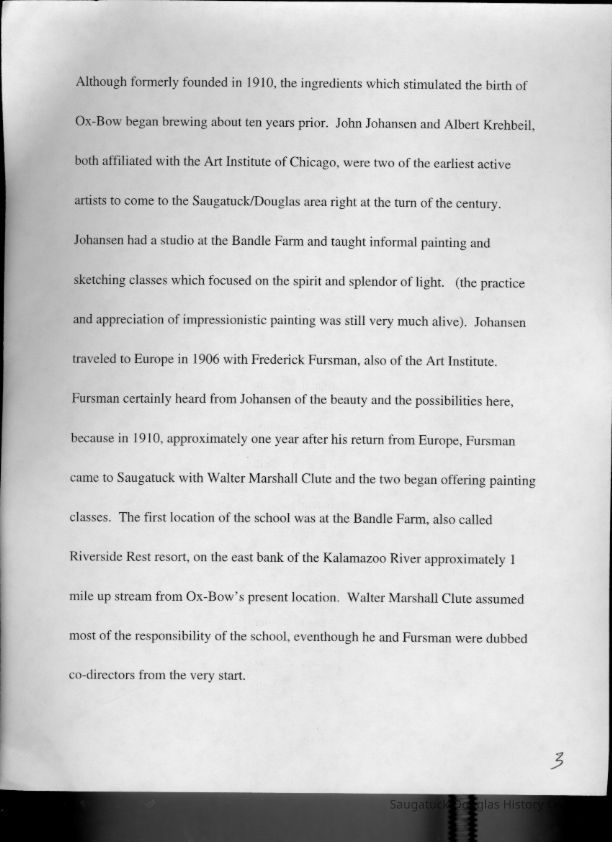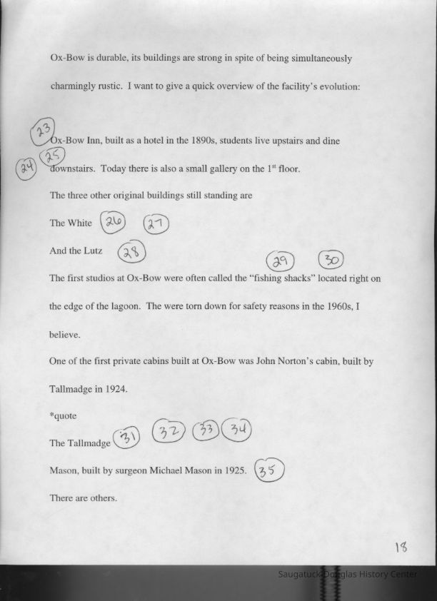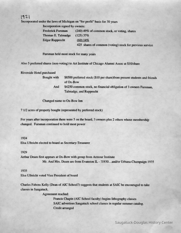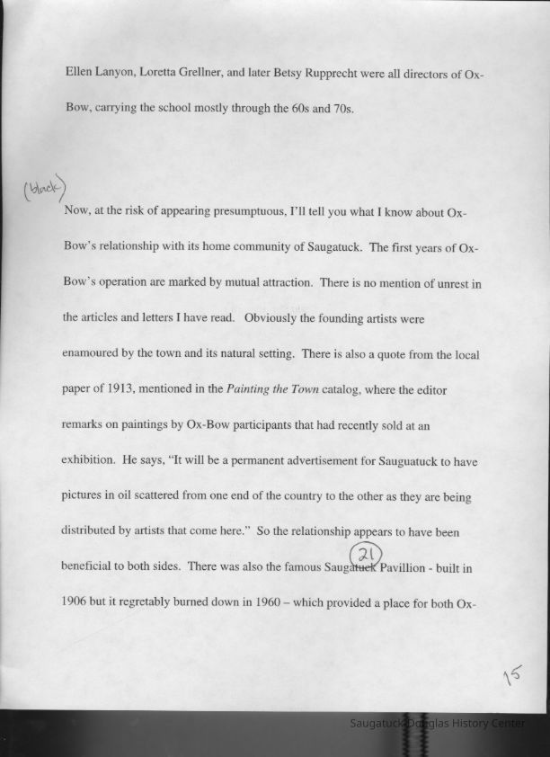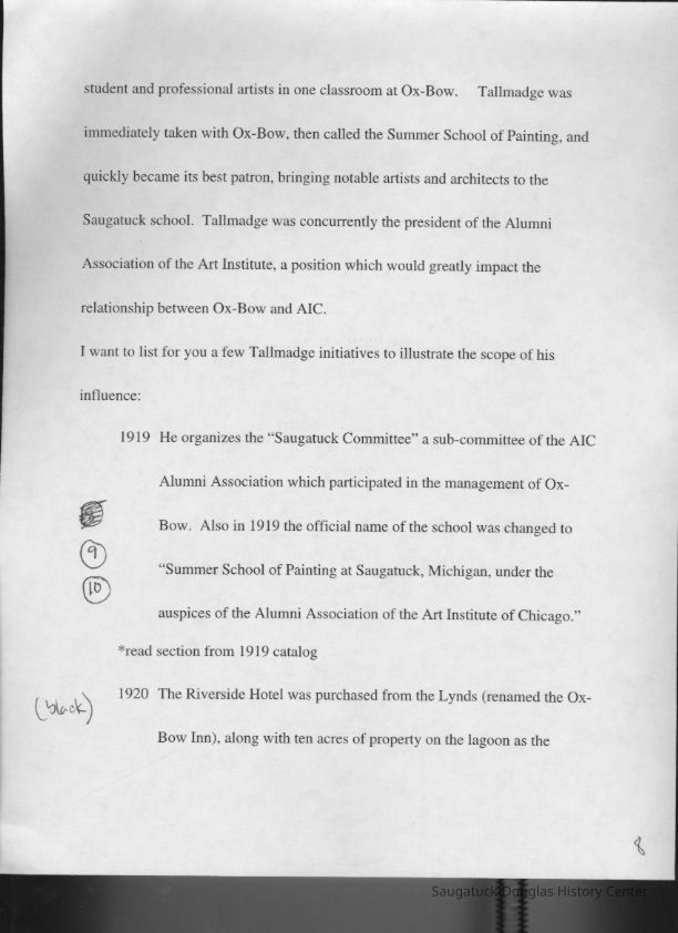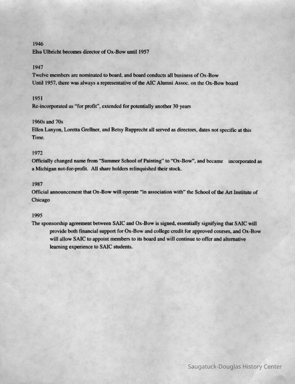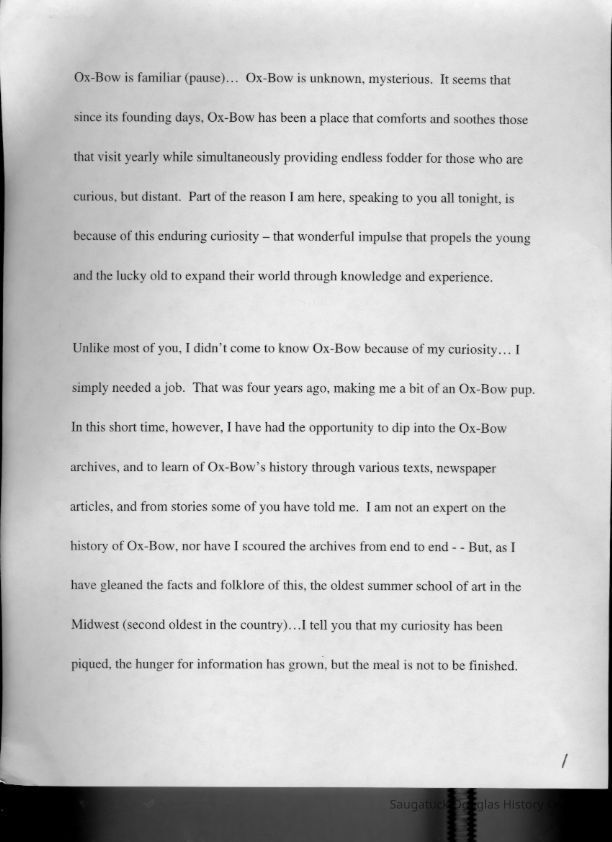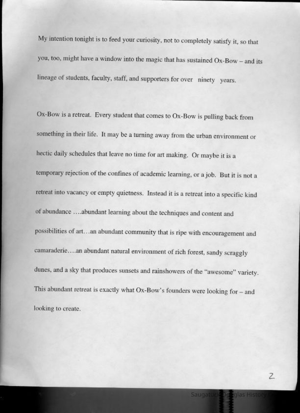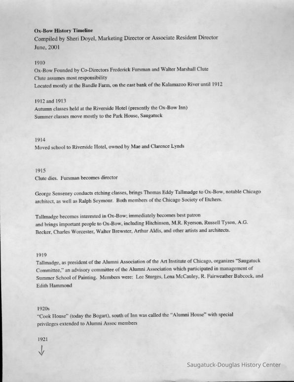 Scans of a 22-page speech, a four-page timeline and four sheets of slides collected by Sheri Doyel, marketing director or associate resident director (assumed to be of Ox-Bow), June 2001. Also included is a scan of a note to "Judy" from Sheri dated 9/17/2002 explaining how the numbered slides fit with the text.