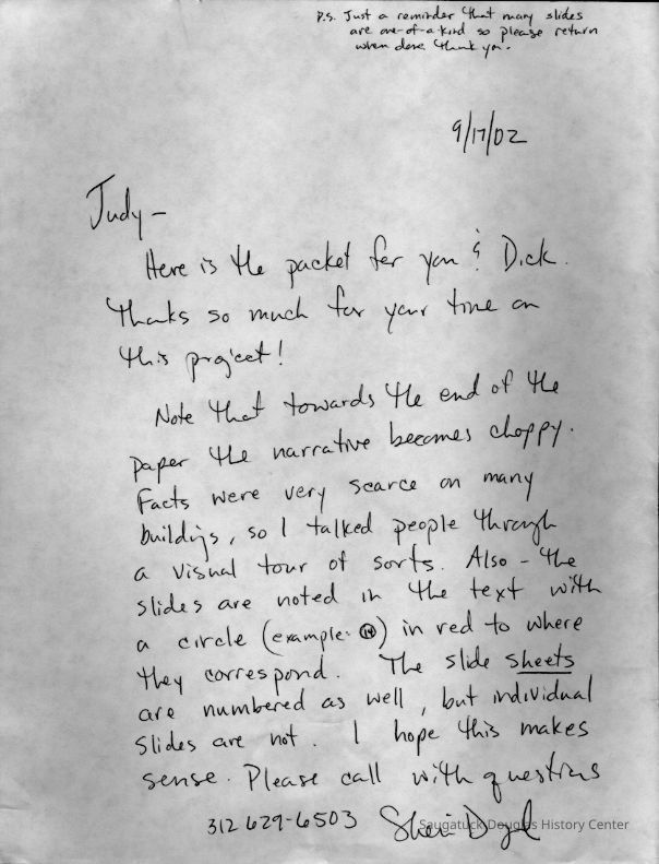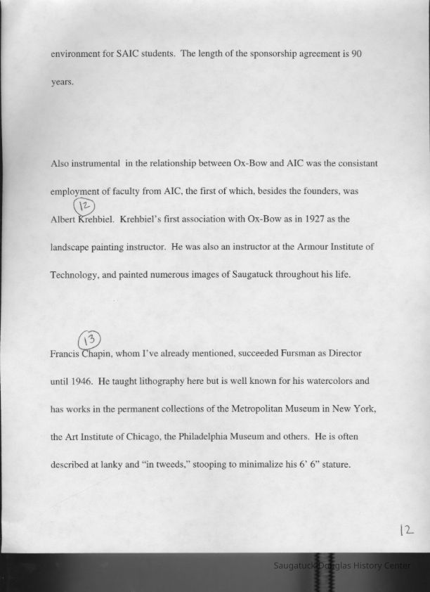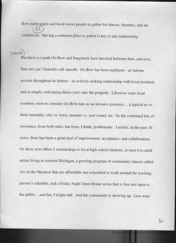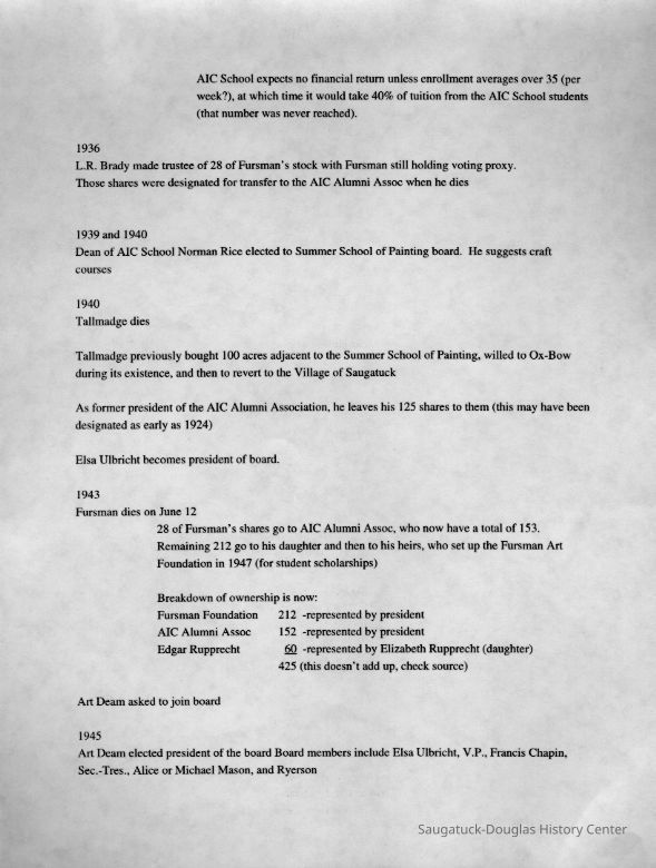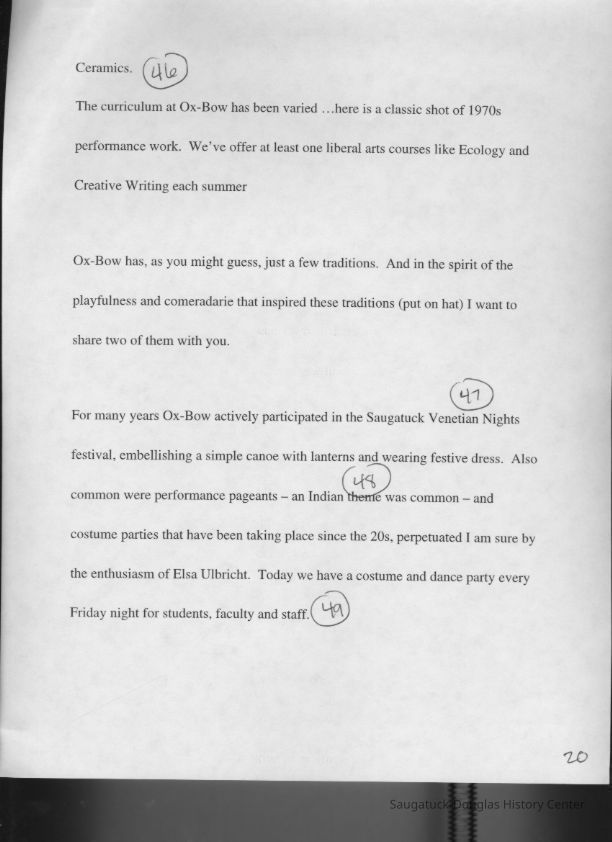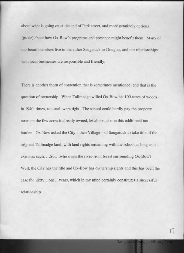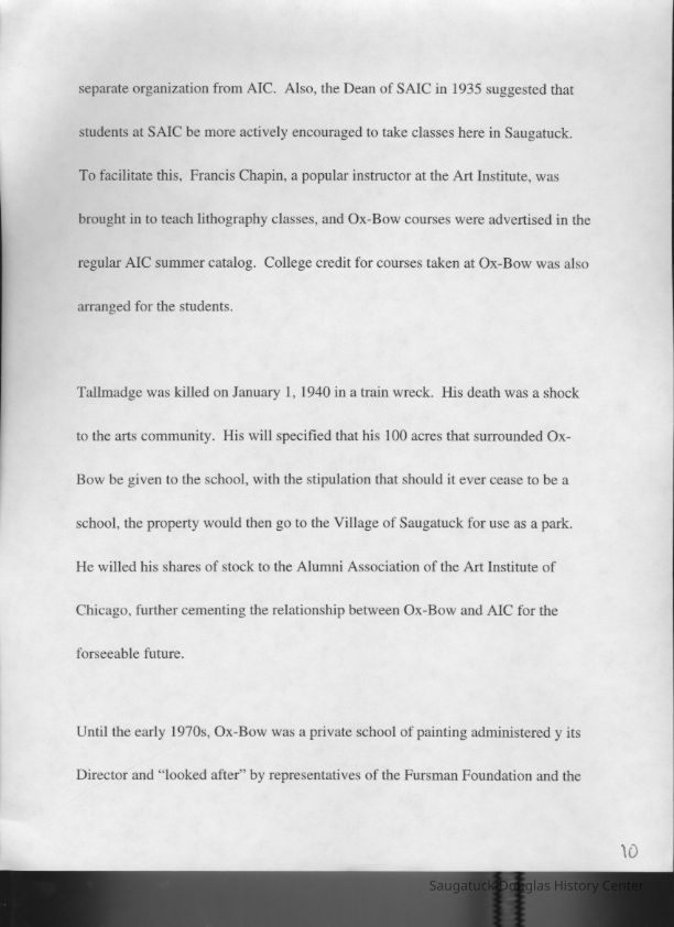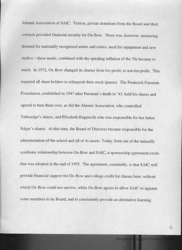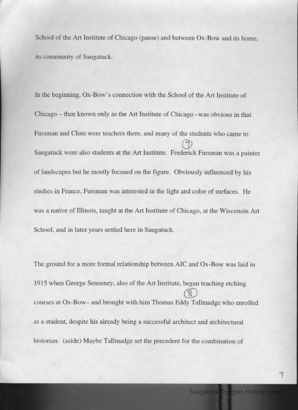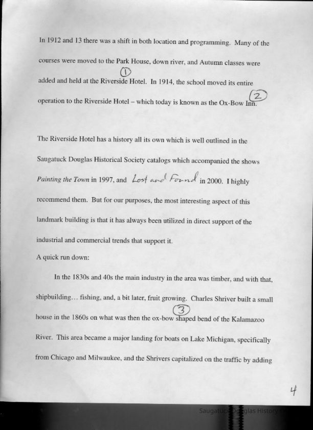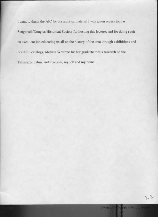 Scans of a 22-page speech, a four-page timeline and four sheets of slides collected by Sheri Doyel, marketing director or associate resident director (assumed to be of Ox-Bow), June 2001. Also included is a scan of a note to "Judy" from Sheri dated 9/17/2002 explaining how the numbered slides fit with the text.