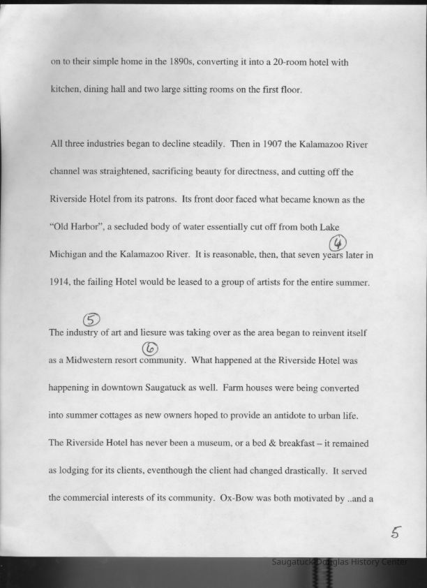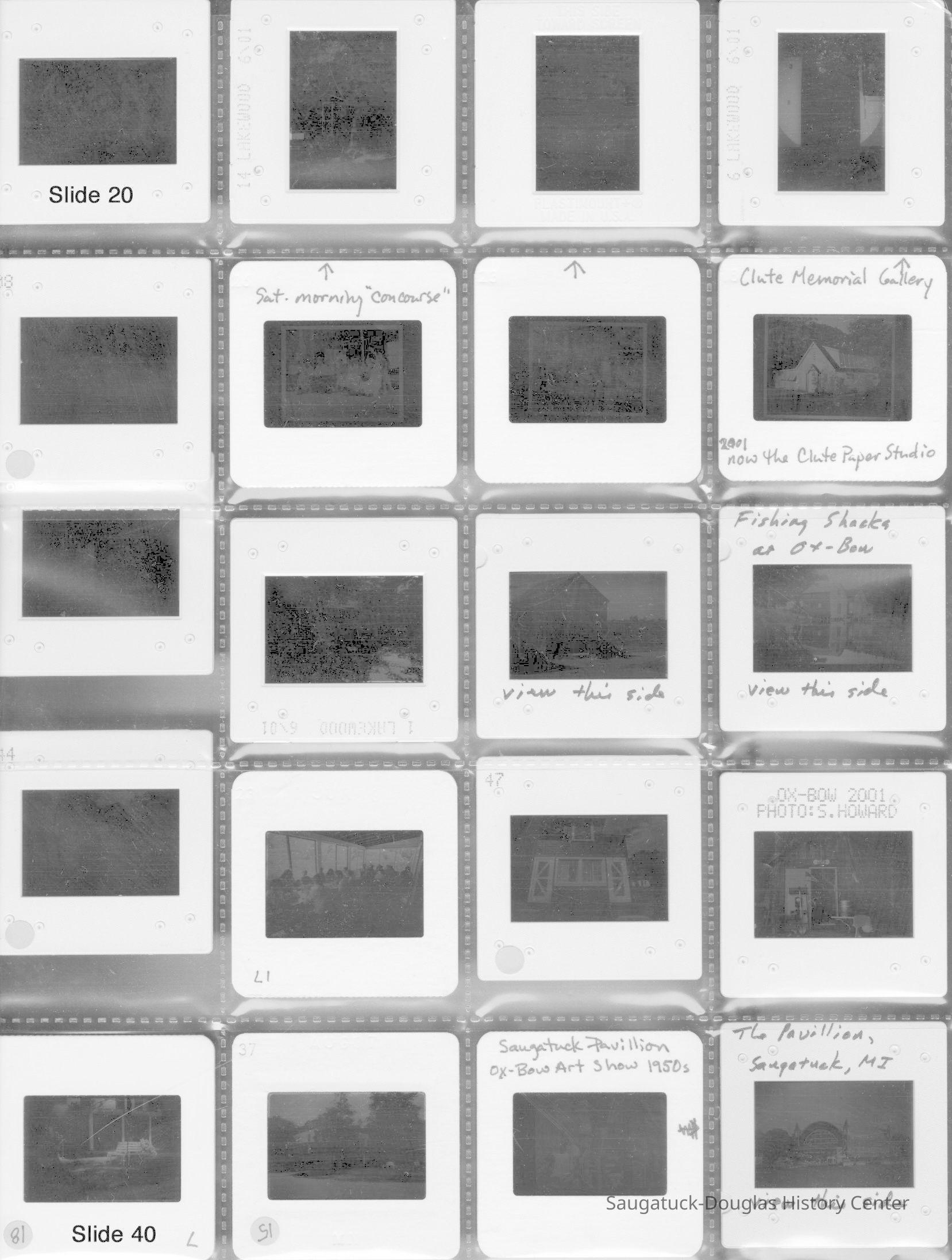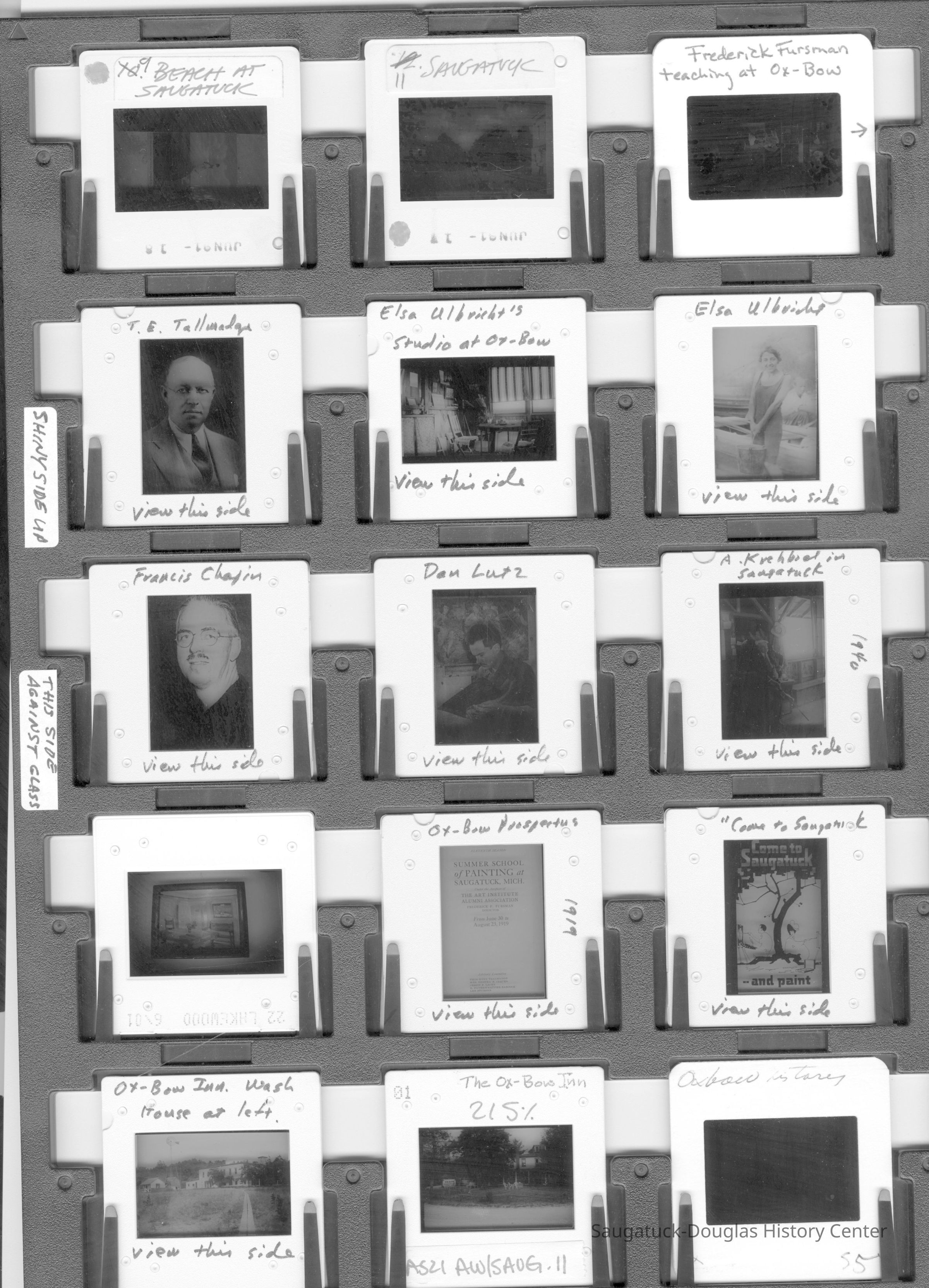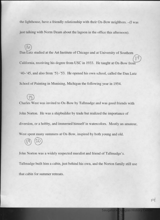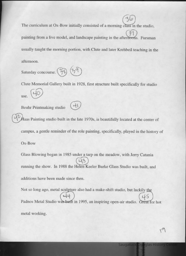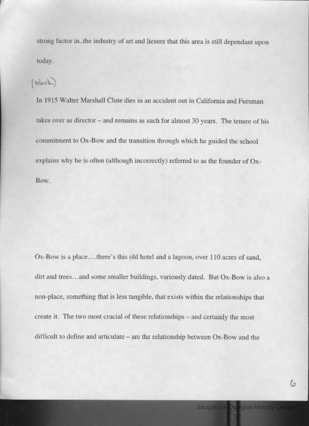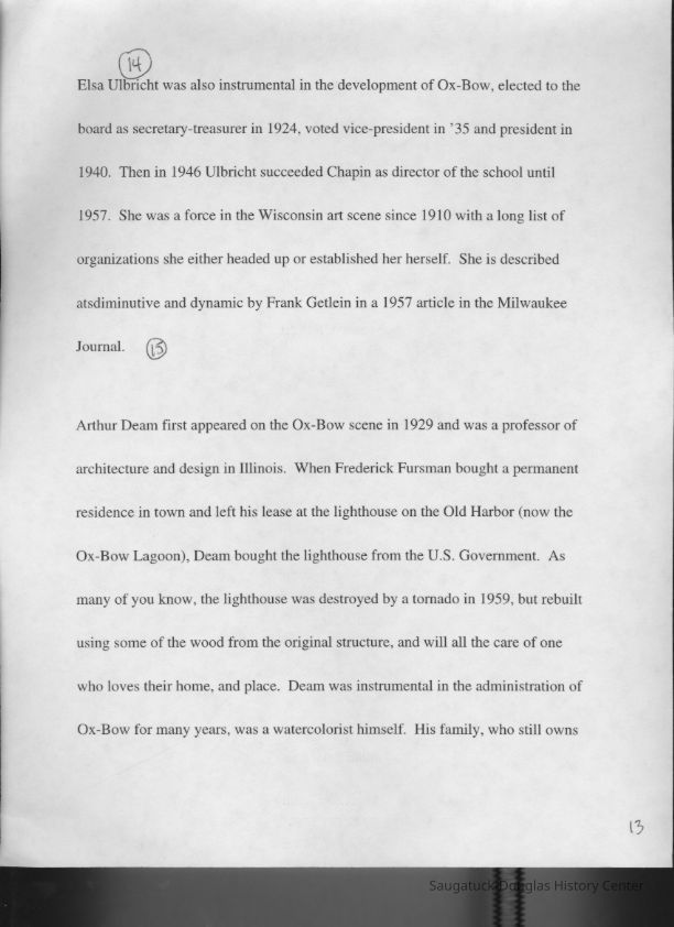 Scans of a 22-page speech, a four-page timeline and four sheets of slides collected by Sheri Doyel, marketing director or associate resident director (assumed to be of Ox-Bow), June 2001. Also included is a scan of a note to "Judy" from Sheri dated 9/17/2002 explaining how the numbered slides fit with the text.