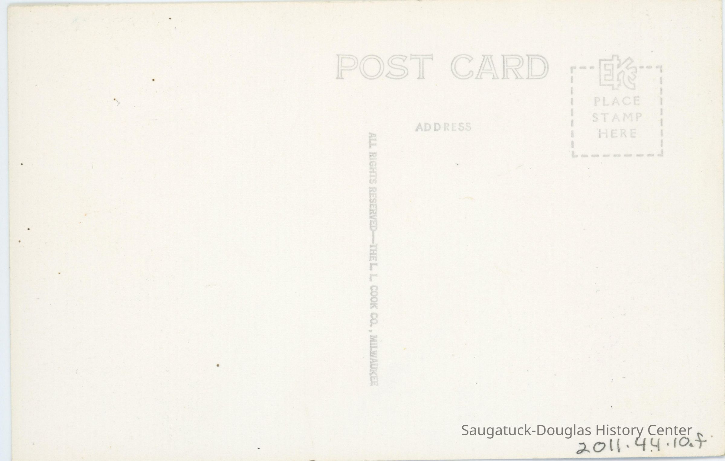 A black and white postcard showing St. Peter's Church in Douglas, Michigan. The building has a small foyer attached to the larger worship hall. Atop the steeple is a cross. M506