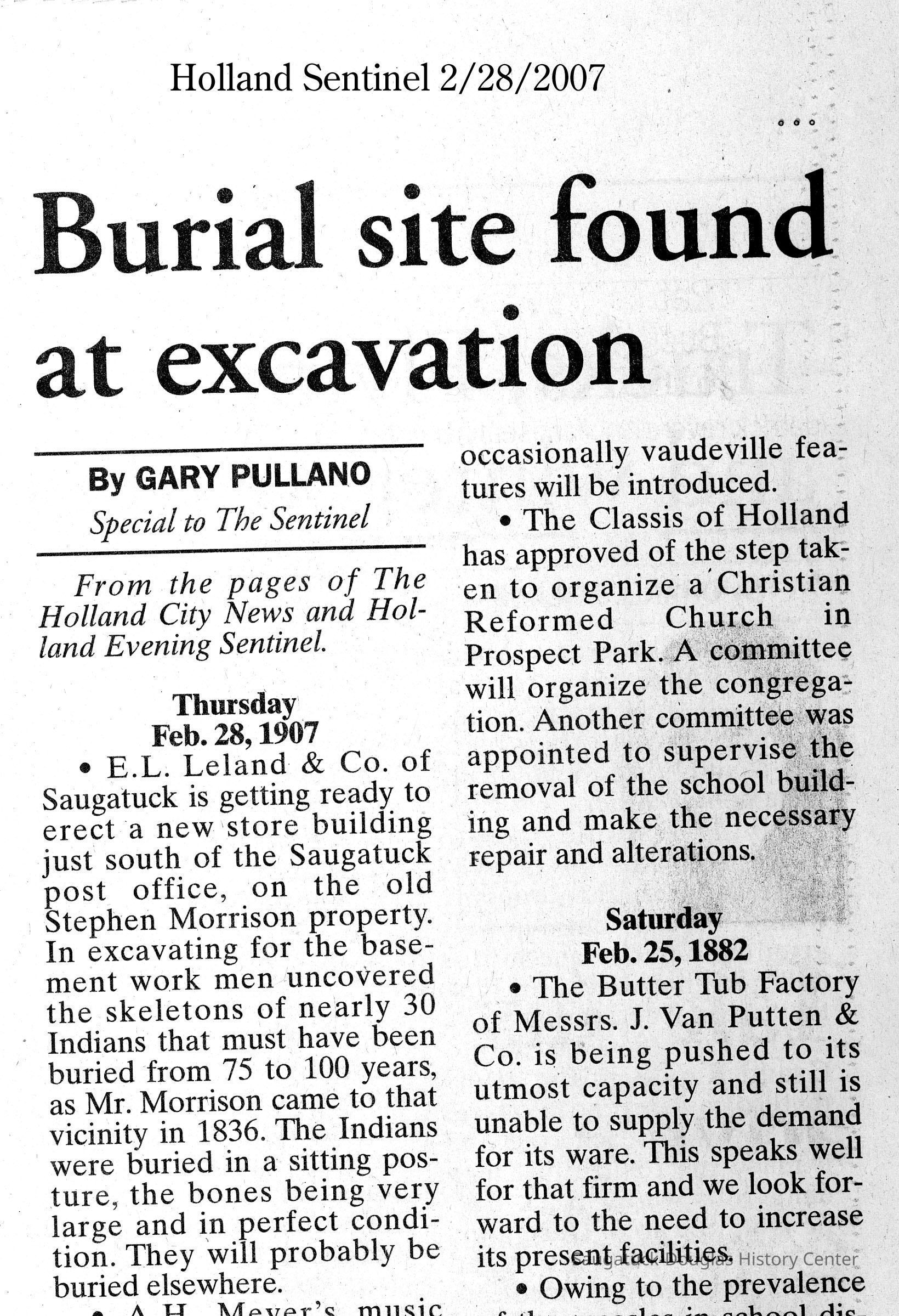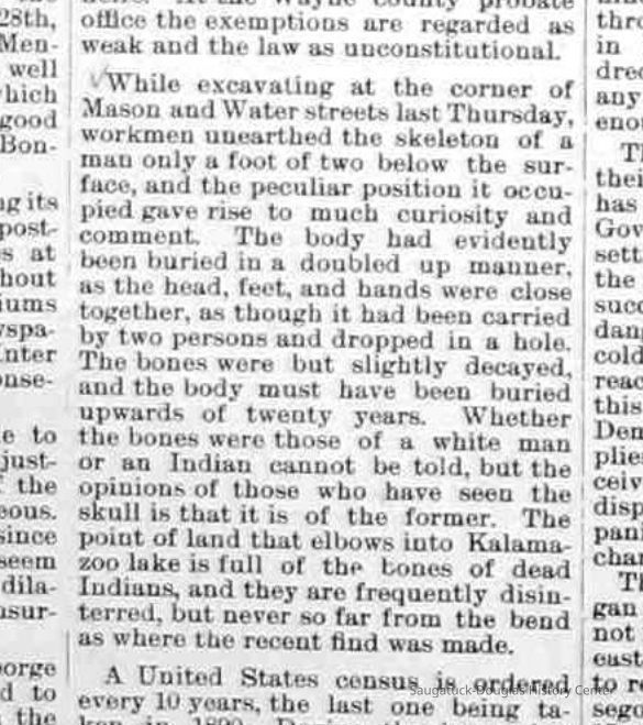 "While excavating at the corner of Mason and Water Streets last Thursday workmen unearthed the skeleton of a man only a foot or two below the surface, and the peculiar position it occupied gave rise to much curiosity and comment. The body had evidently been buried in a doubled up manner, as the head, feet and hands were close together, as though it had been carried by two persons and dropped in a hole. The bones were but slightly decayed, and the body must have been buried upwards of twenty years. Whether the bones were that of a white or an Indian cannot be told, but the opinions of those that have seen the skull is that is that it is of the former. The point of land that elbows into Kalamazoo Lake is full of bones of dead Indians, and they are frequently disinterred, but never so far from the bend as where the recent find was made."