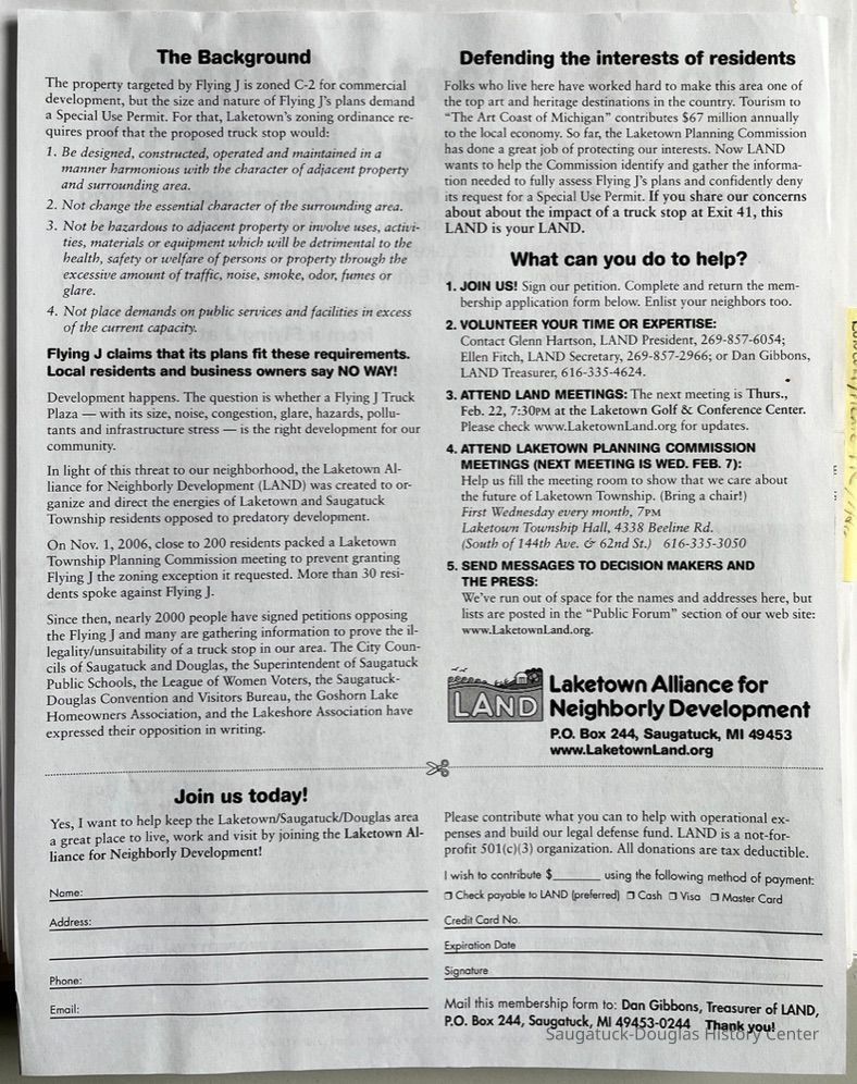 Documents, emails, press releases, media contact lists, and newspaper clippings pertaining to the formation and activities of LAND - The Laketown Alliance for Neighborly Development, a citizens group opposed to the development of a Flying J truck-stop at the I-196 exit 41. The well-organized documents track LAND's formation, strategies, membership and mailings lists from 2006 to 2007.