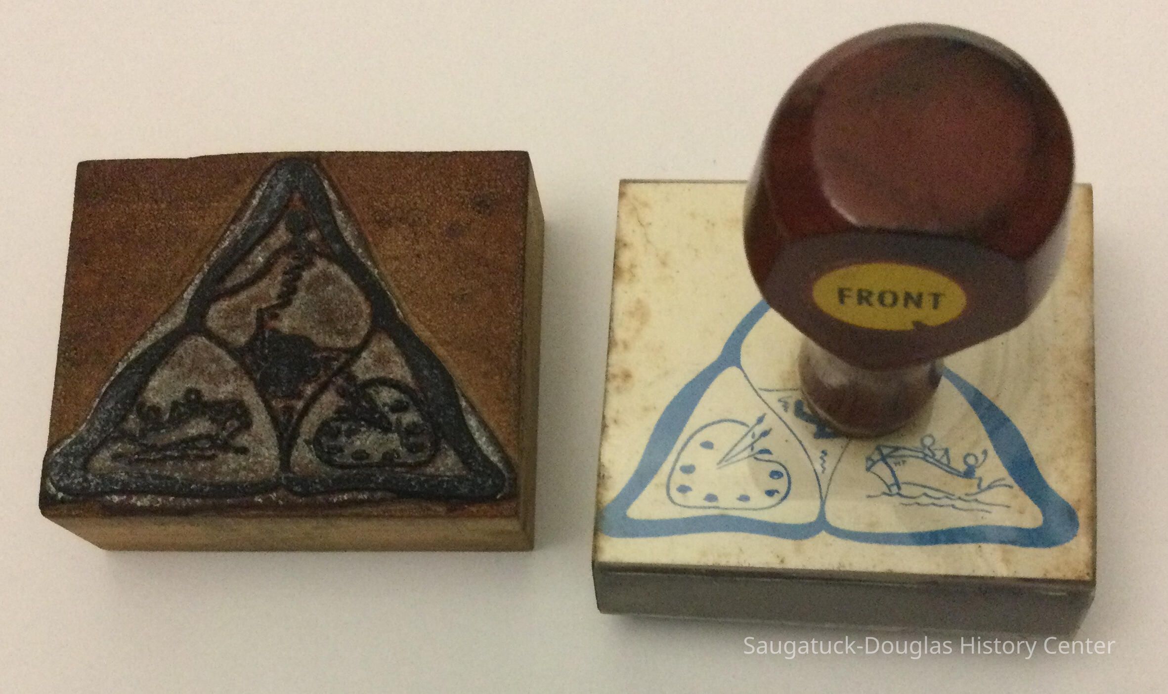 Two rubber stamps with Saugatuck Art Club logo