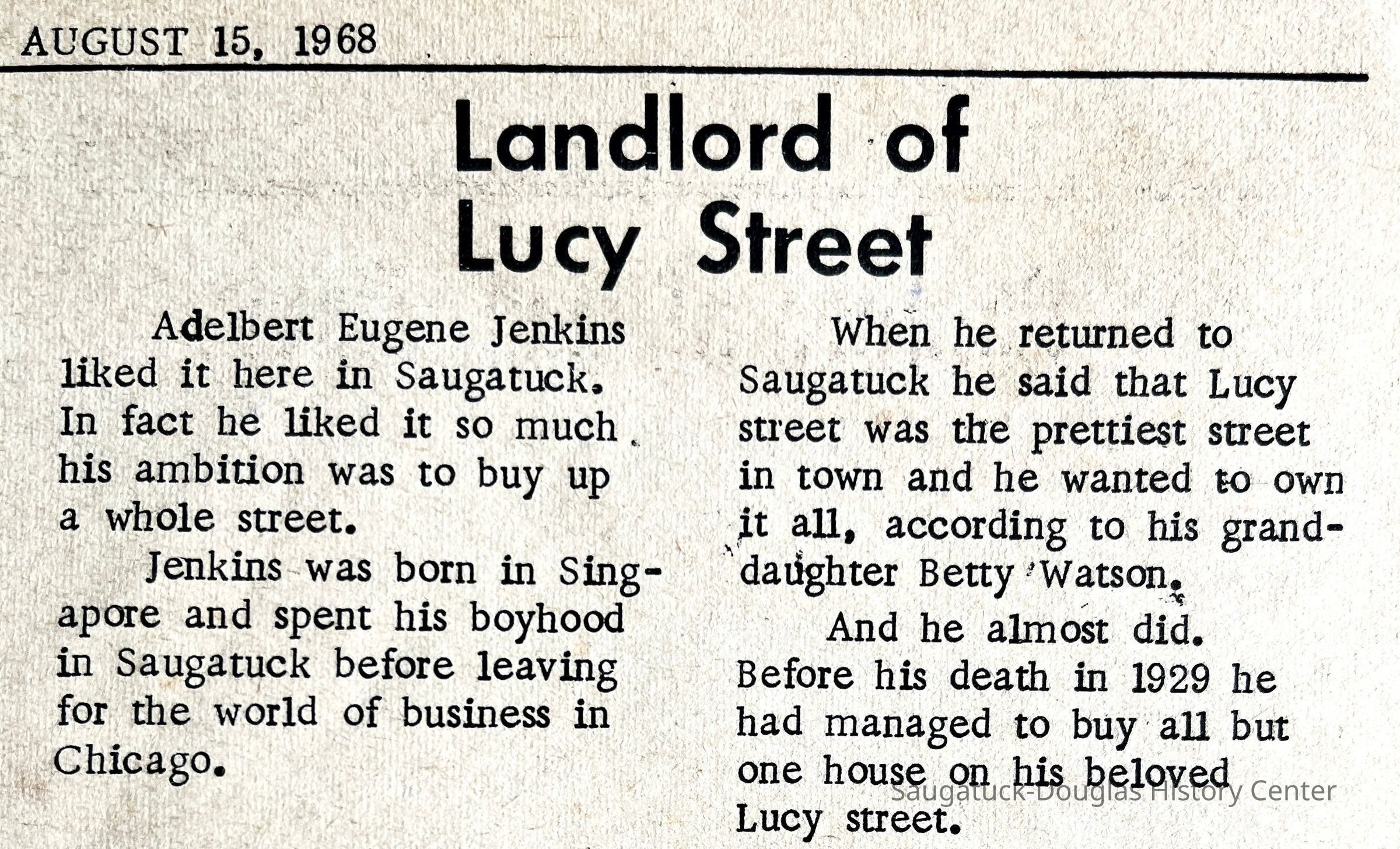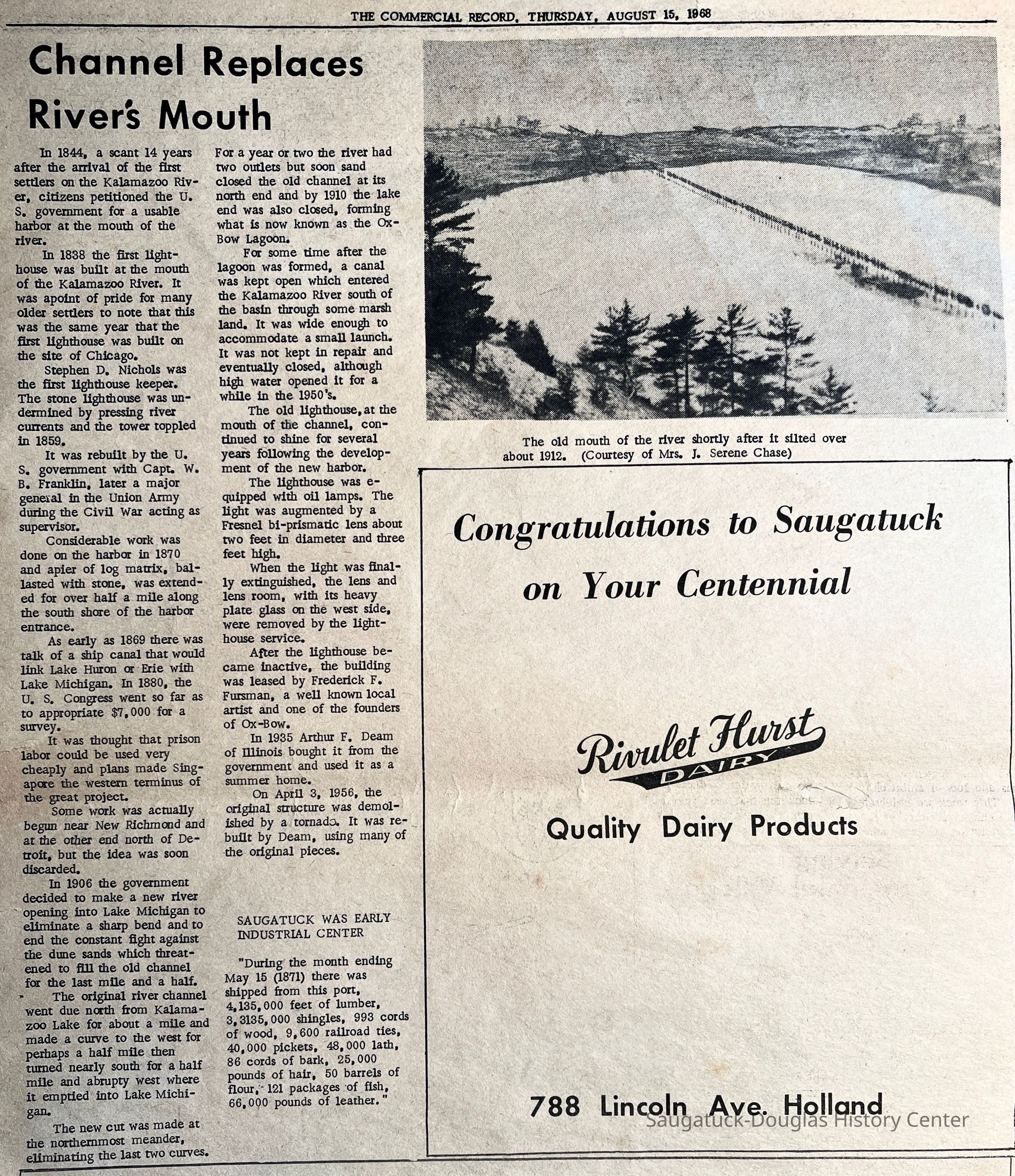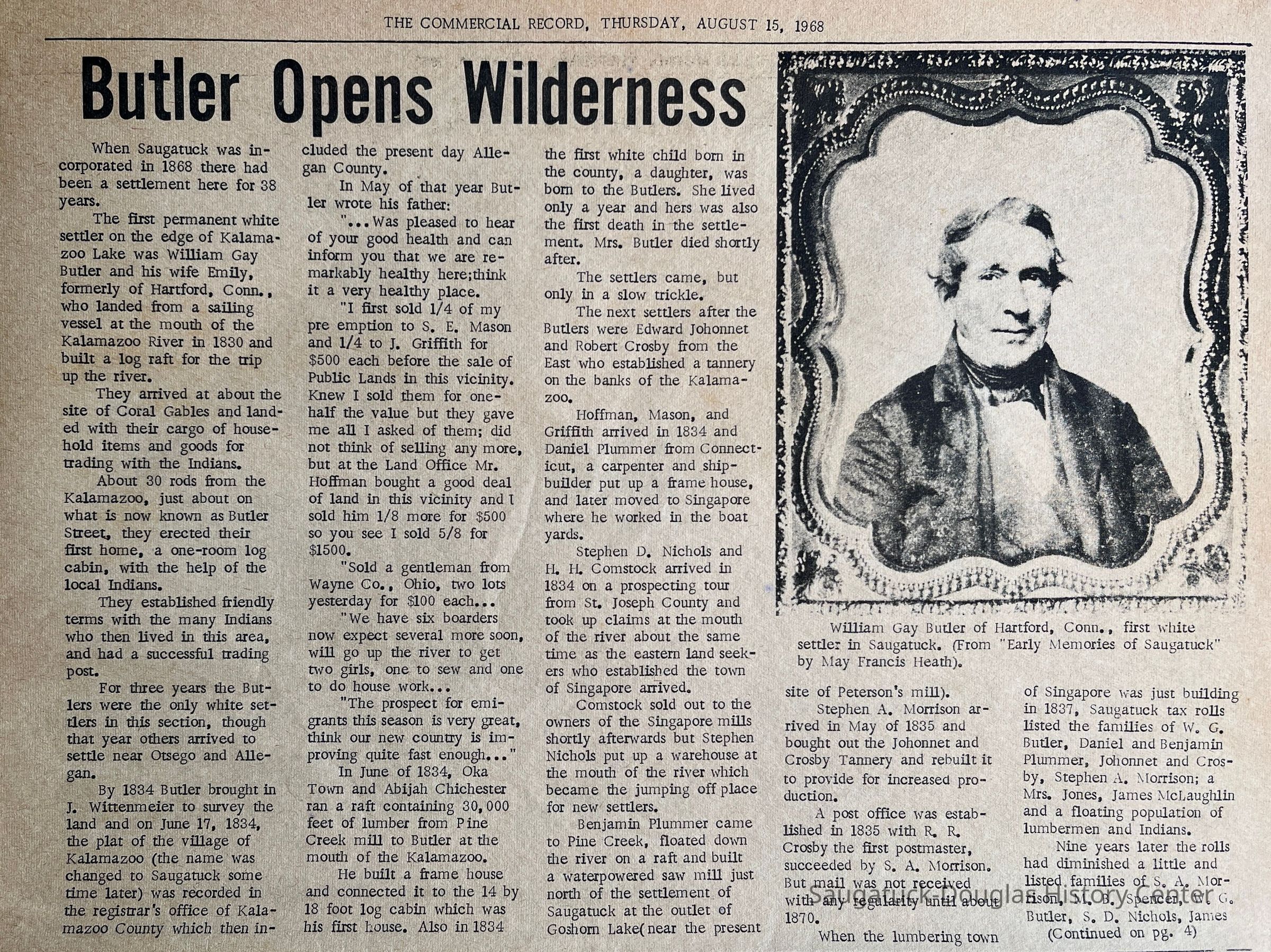 Butler, William Gay 1799-1857Nichols, Stephen D. 1806-1887Plummer, Benjamin 1802-1885Crosby, R. RensselaerJenkins, Adelbert Eugene 1863-1929Gerber's Landing/Peach Tree Landing/BreeseHutchins, Harrison 1815-1893Coutoumanos, George 1876-1962Morrison, Mary Elizabeth (Peckham) 1816-1881Saugatuck Union School 1866-1896Saugatuck Public School 1897-1950Ox-Bow Inn/Riverside Hotel/Shriver family homeOx-Bow/Summer School of Art116 Riverside/Riverside Rest/Bandle Farm/Bandle's Addition 1890-2024Fursman, Frederick Frary 1874-1943Clute, Walter Marshall 1870-1915888 Holland/Park House/Clover's Waffle House/H.D. Moore residenceTallmadge, Thomas Eddy 1876-1940Rupprecht, Edgar A. 1889-1954United States (ship) 1909-1946Bob Stephenson (boat)Graham & Morton Transportation Co. 1874-1950Interurban Railroad 1899-1927Goodrich Transporation CompanyNorth American (ship)South American (ship)Bon Voyage (ship) 1891Mount Baldhead Dune/ParkLane, Kit 1939-2024Lane, Arthur Leroy Sr. 1901-1996MacsaubeeKrehbiel, Albert Henry 1873-1945Norton, John Warner 1876-1934Taylor, Cora Bliss 1889-1986Hoerman, Carl 1885-1955Chalet Studio and Art GalleryHoerman, Christiana A.Polka, John 1930-2006Tri-County/Western Allegan County/Ganges Telephone CompanyForce, Delos Mettier 1859-1939Force's Florists201 Culver/New Holland Spritis/Shell/Force's Snug Harbor/Interurban StationCuckoo (ship) 1907Big Pavilion 1909-1960Old Harbor/Channel piers pre-1906/Ox-Bow LagoonSaugatuck Harbor Piers/Channel 1906-presentKalamazoo Lighthouses 1839/1858/1956-presentIra Chaffee (ship) 1867G.P. Heath (ship) 1871-1887A.B. Taylor (ship) 1884 / Ottawa 1902-1910John A. Aliber (boat) 1897-c1927Davis, Jefferson F. 1808-1889Tuttle, Levi 1829-1921Saugatuck Township Fire DistrictWard School/Singapore School