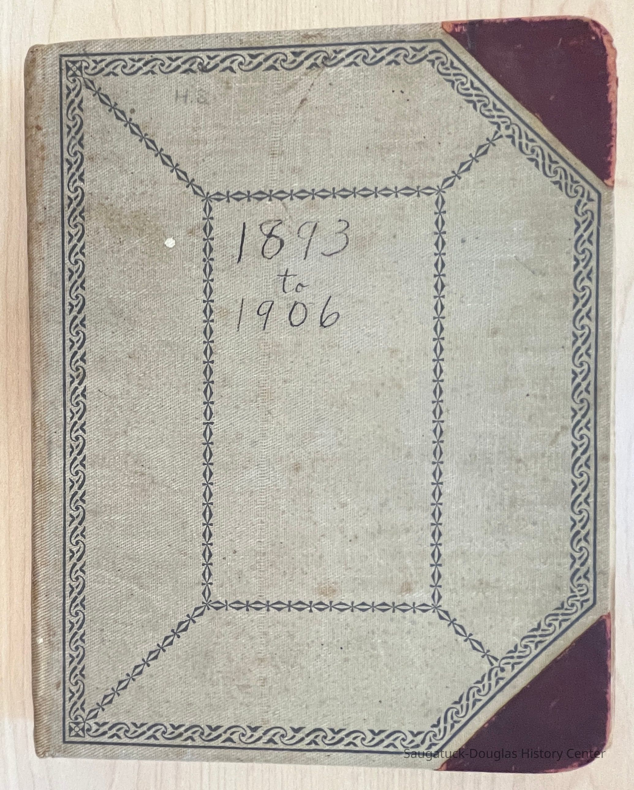 Beige-gray, cloth-covered ledger with red-brown reinforced corners and dark scroll patterns stamped on the cover. "1893 to 1906" is written by hand on the cover of the book.