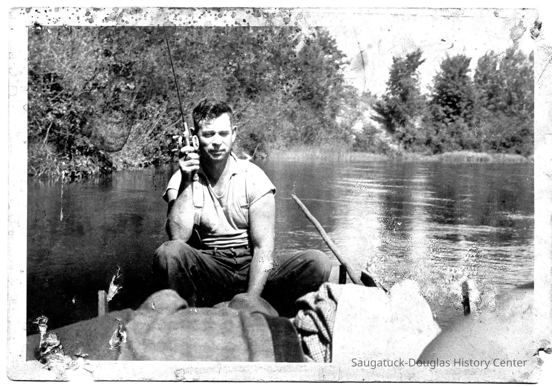 d. Dick Newnham or his brother Harry Newnham holding a rod and reel, 1947, 3.5x4.75"