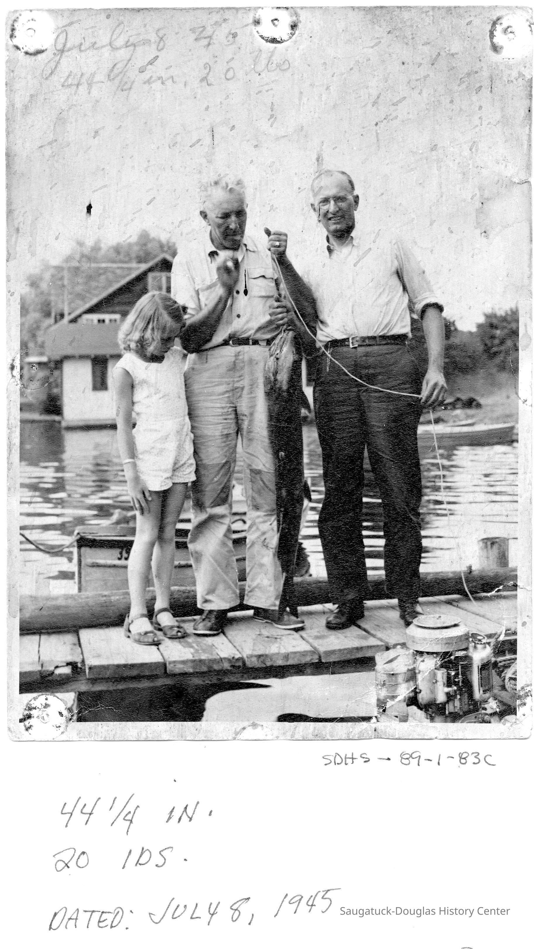c. Two men and a young girl with a large catfish. July 8, 1945. Outboard engine in the foreground, 7x5"