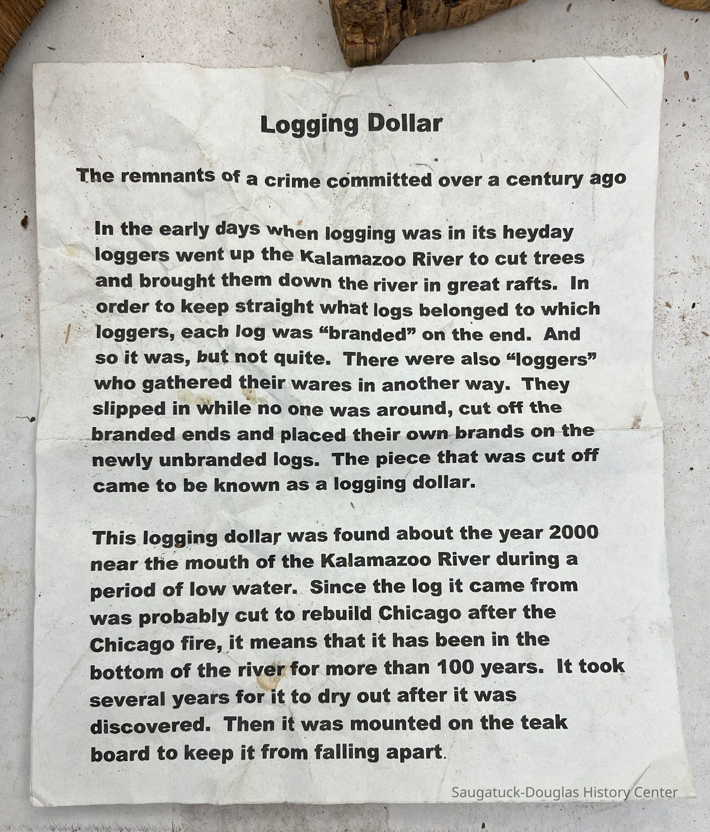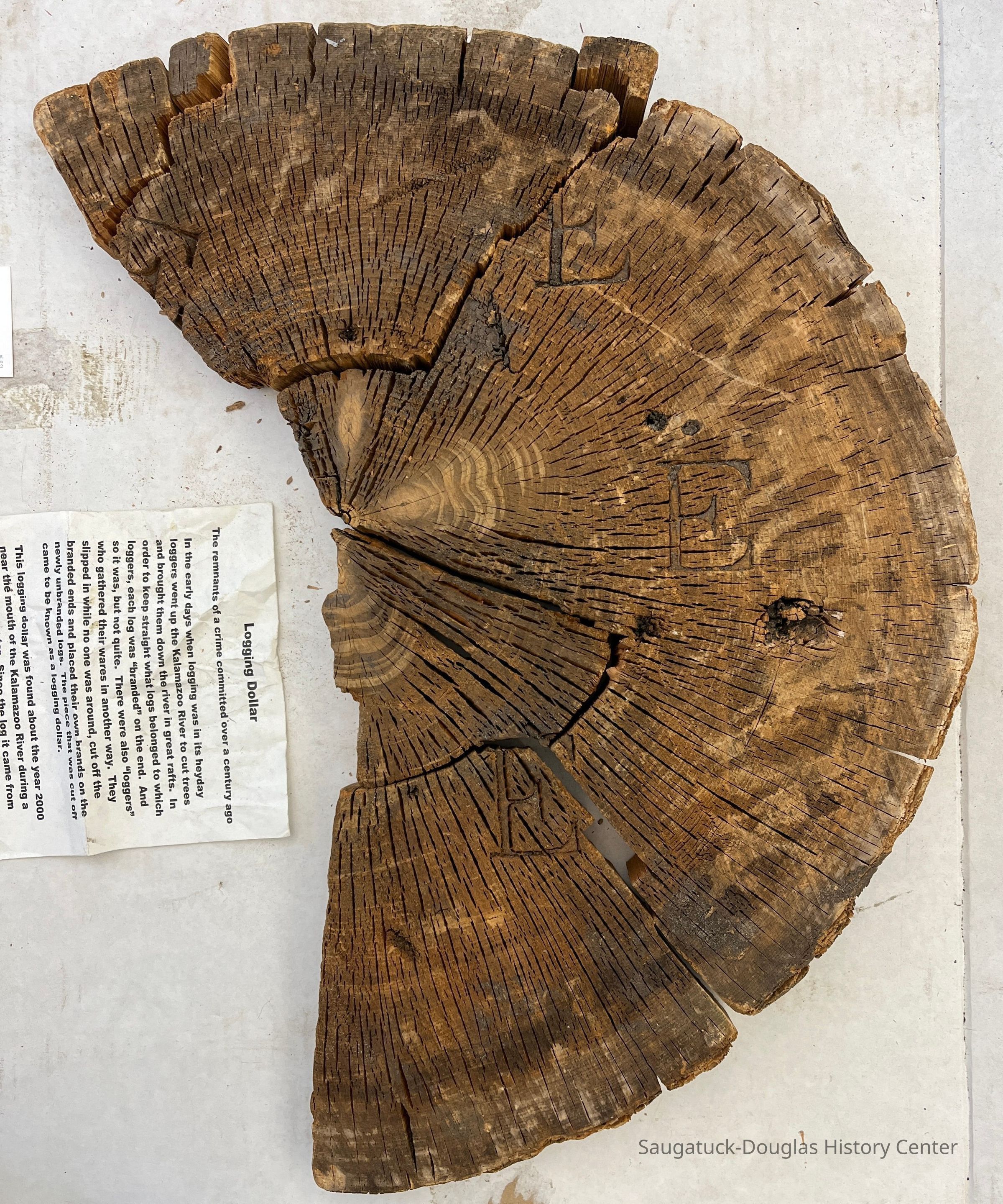 Lumbering companies stamped the ends of tree trunks to keep track of their inventory as it was transported down river.