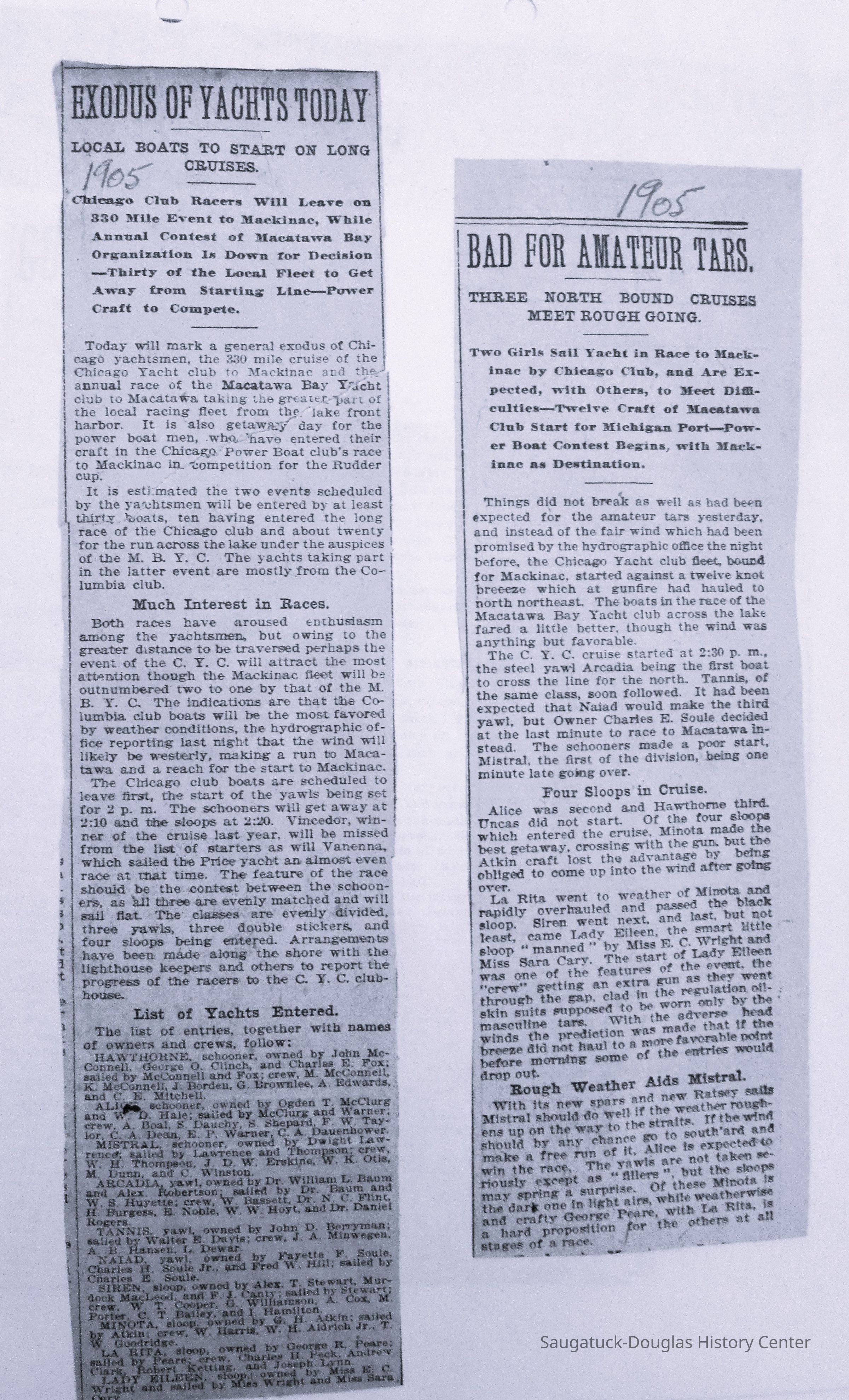 Evelyn Wright-Crawford who, along with her cousin Sara Cary [or Carey], double-hand sailed her 32-foot sloop "Lady Eileen" in the Chicago Yacht Club’s 1905 Chicago to Mackinac race. She was a founder of the Saugatuck Yacht Club and spouse of Andrew Hay Crawford of the Crawford Transportation Company, that from 1909 to 1913 made daily trips from Chicago with the H. W. Williams (later the Tennessee) and other steamships. The ships usually docked at the Big Pavilion.