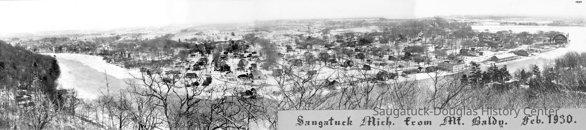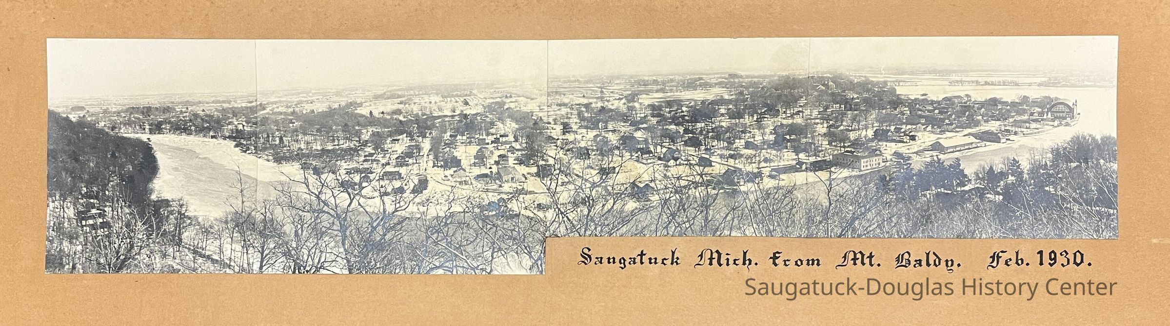 Four photos glued to a board to create a panorama image. "Saugatuck Mich. from Mt. Baldy. Feb. 1930" is hand lettered with black ink on the board. The view shows the town and river covered in snow and ice.