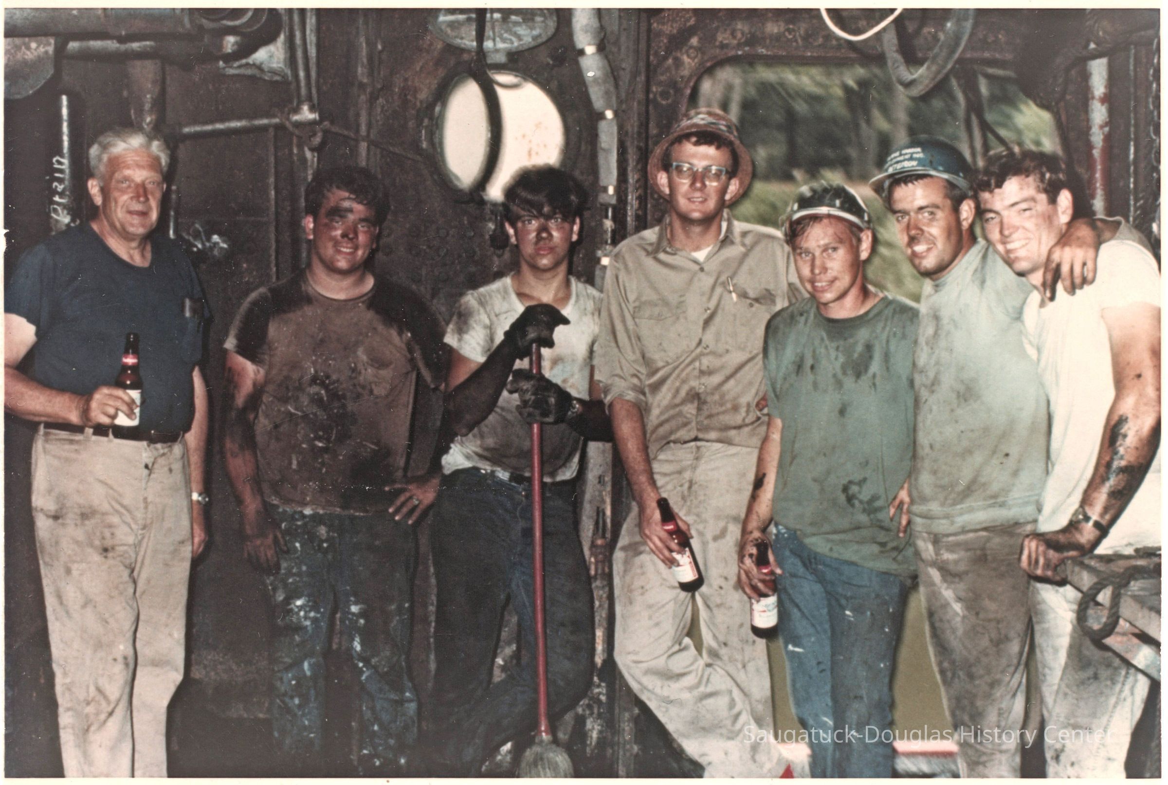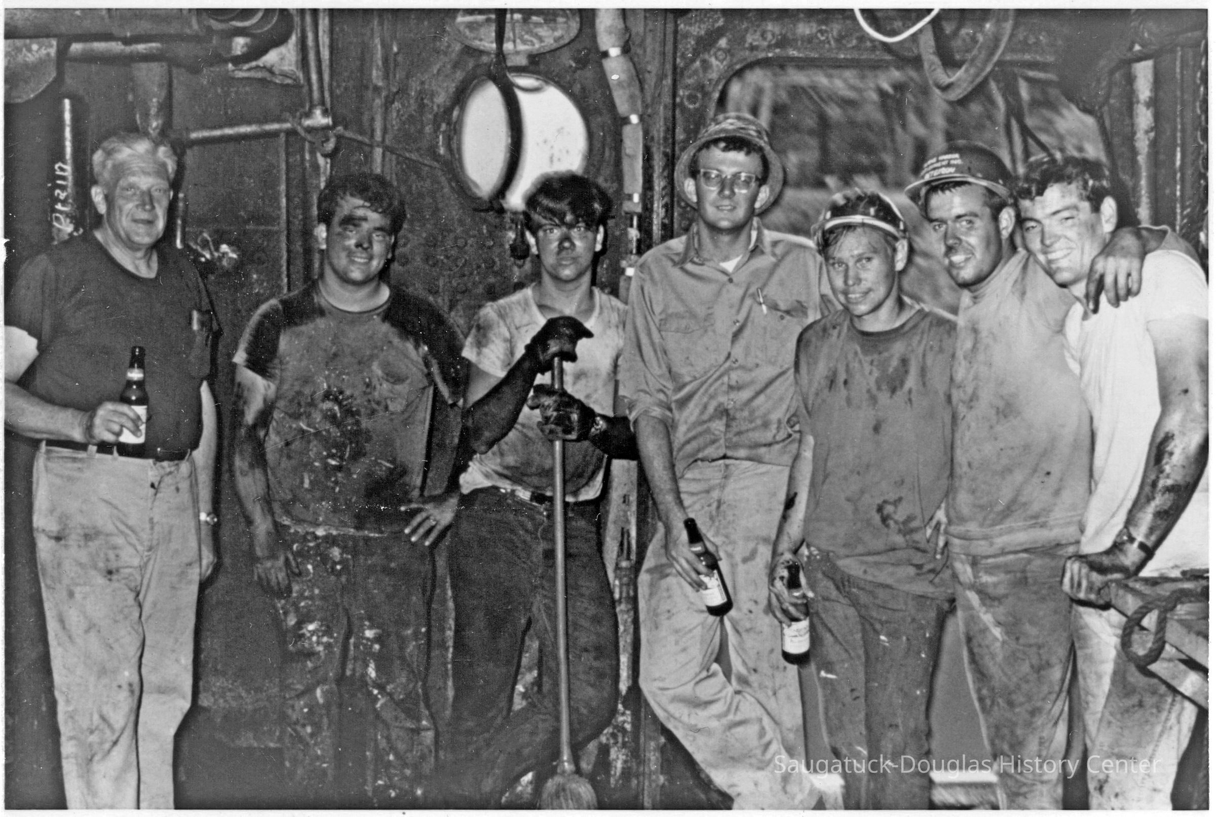 One mature man and six young men line up while they take a beer break from a very dirty job. The coal-smudged workers are inside the Keewatin steamship when it was stuck on its journey up the Kalamazoo River. The river bank is visible through the doorway behind the young men.