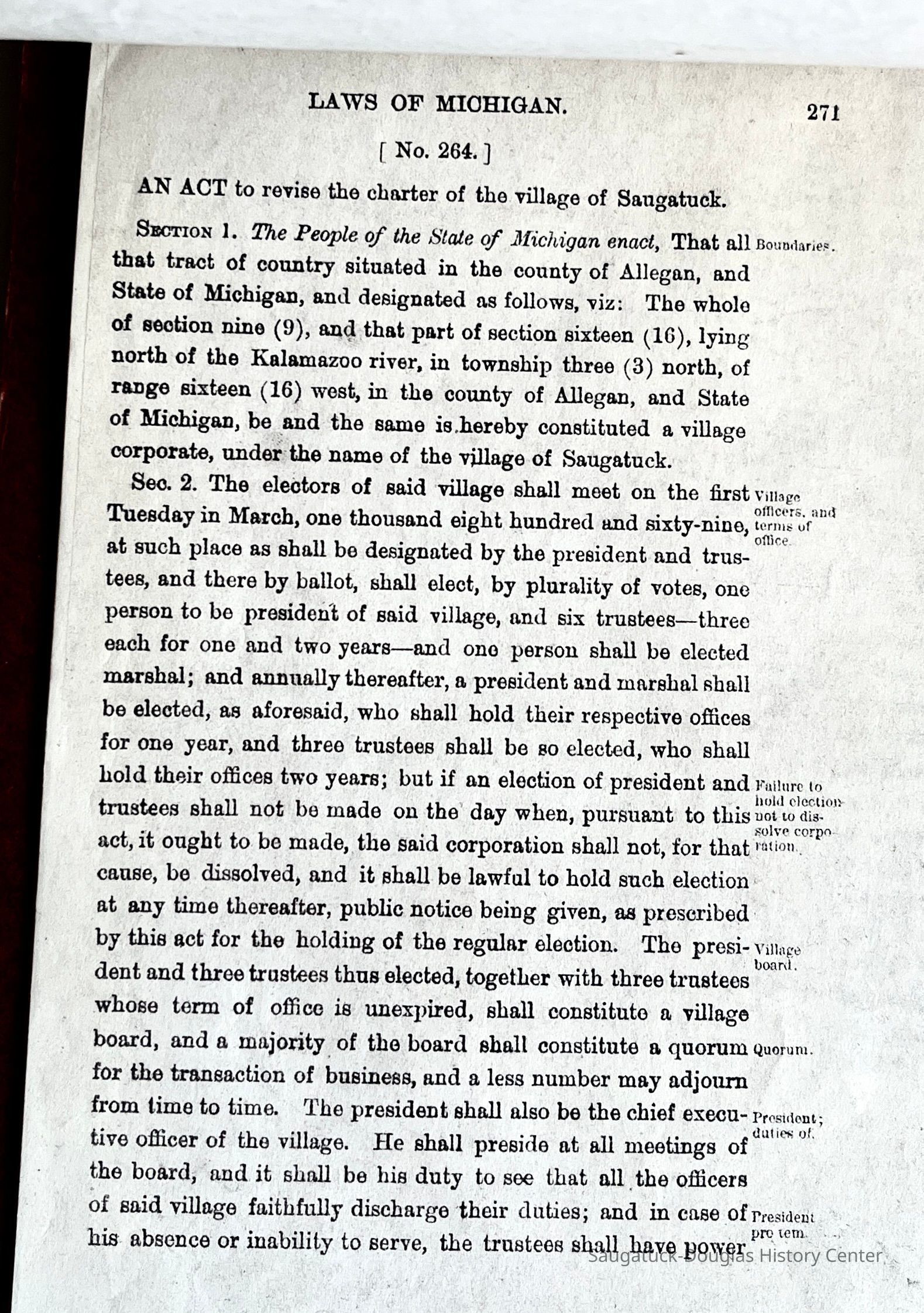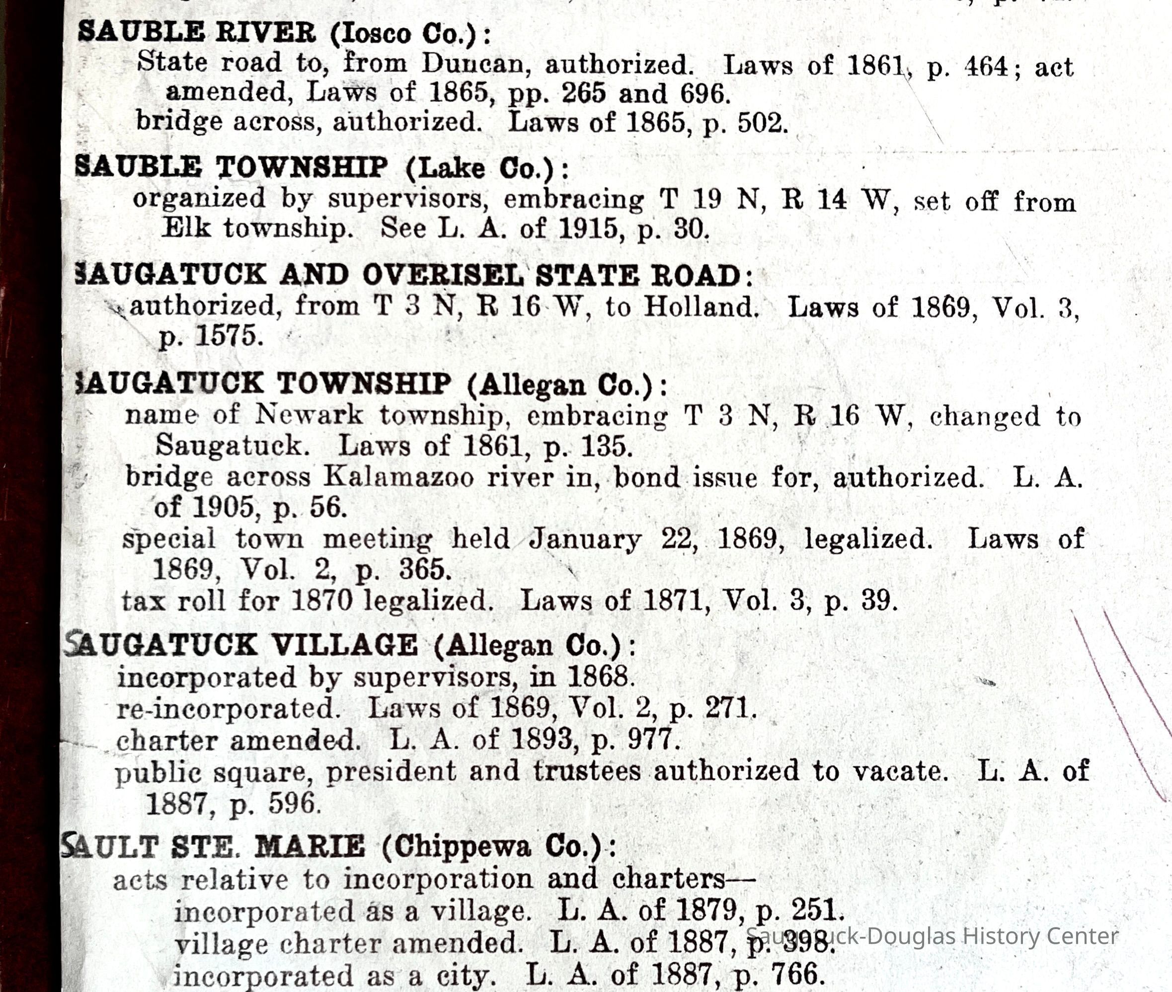 Photocopied pages from a Michigan State book with of page 735 with the heading "Index to Local and Special Acts" and "Laws of Michigan, Number 264, An act to revise the charter of the Village of Saugatuck," pages 271-287
