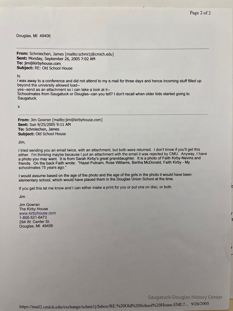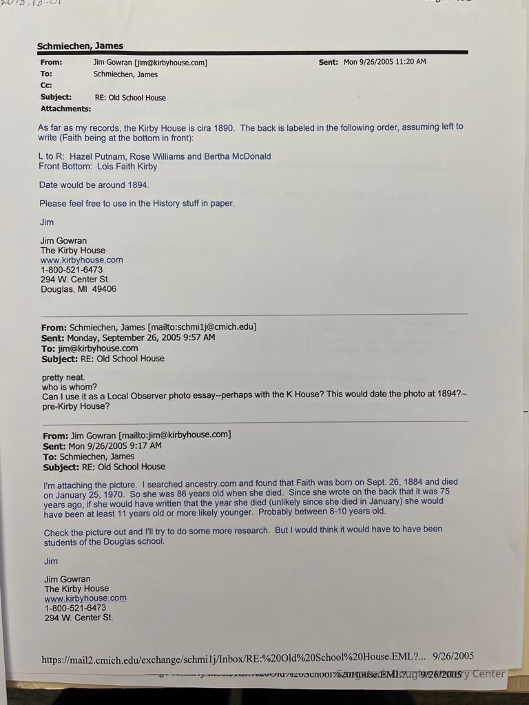 Correspondance between James Schmiechen and Jim Gowran regarding a Kirby family photograph. Copy of photograph included.