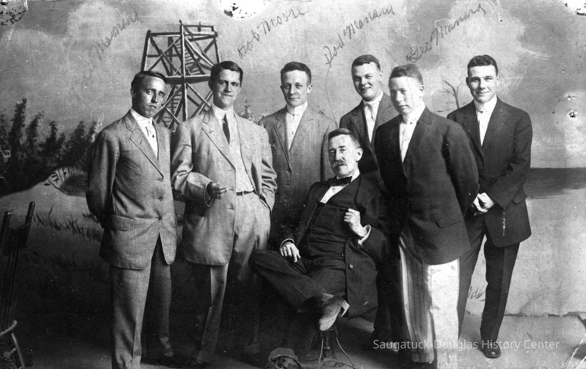 Six younger men standing around a seated, older man. All are posing in front of a photo backdrop with a painting of the Mt. Baldhead observation tower.