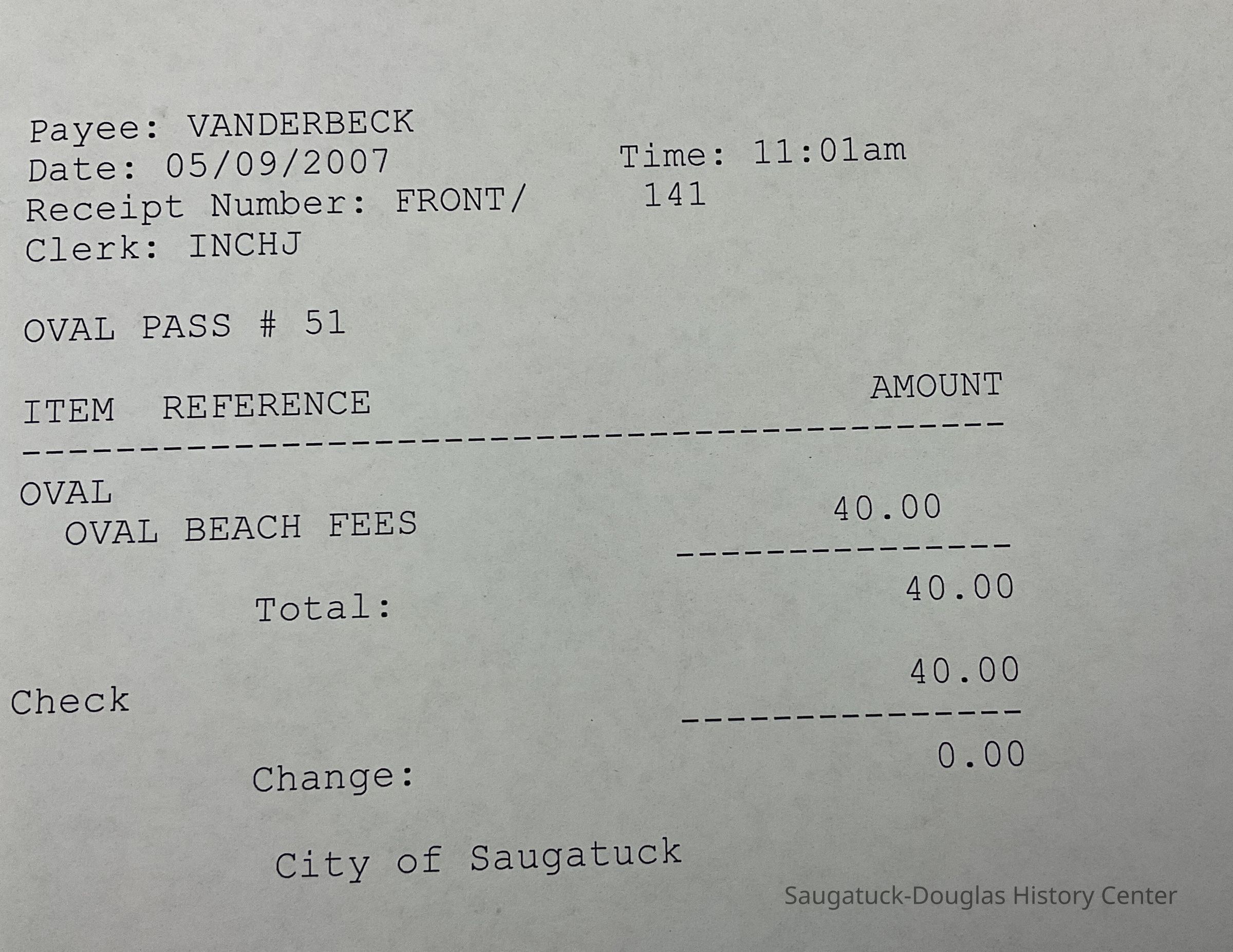 Windshield sticker - Oval Beach parking permit & receipt (payee: Vanderbeck)