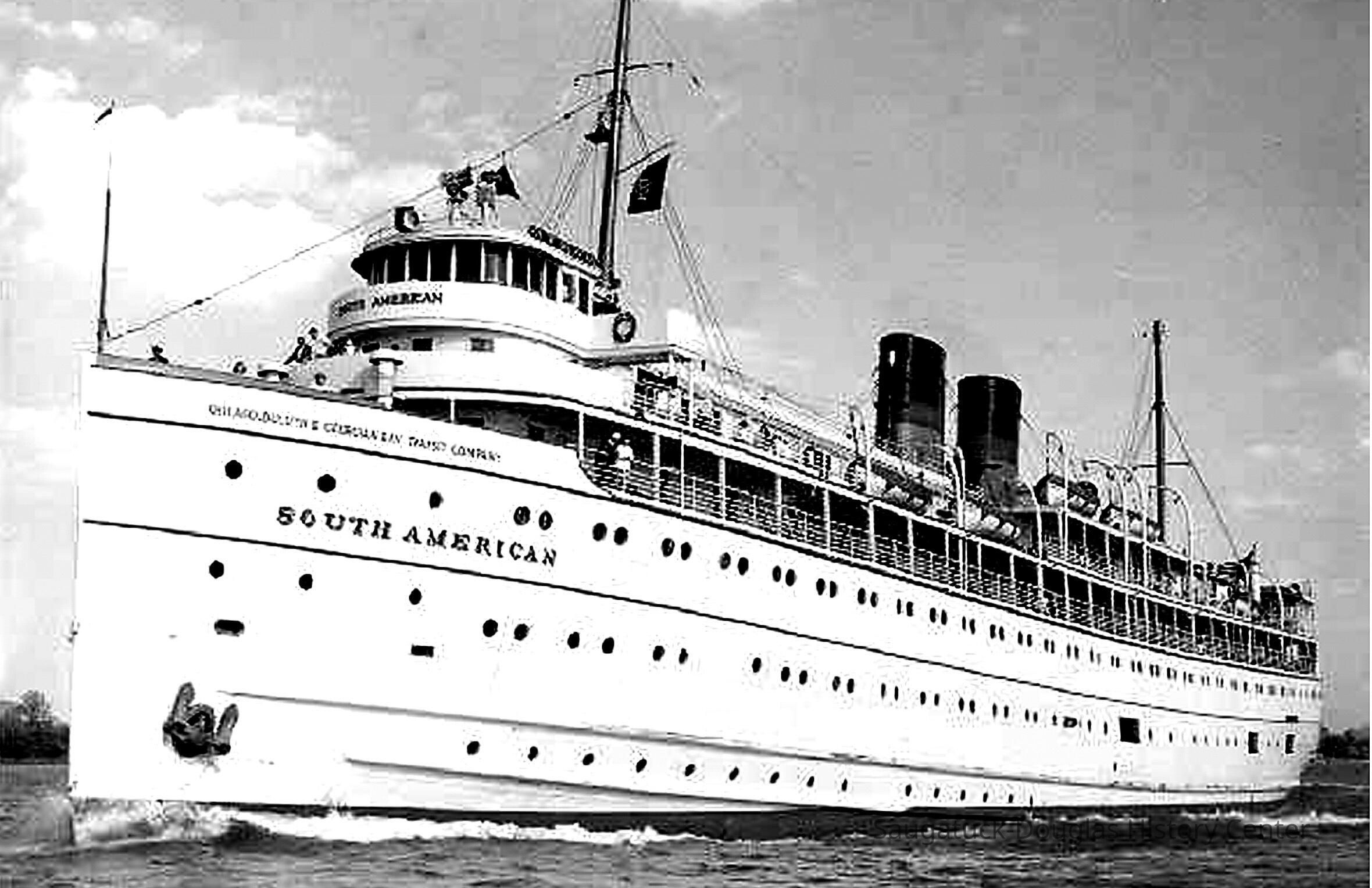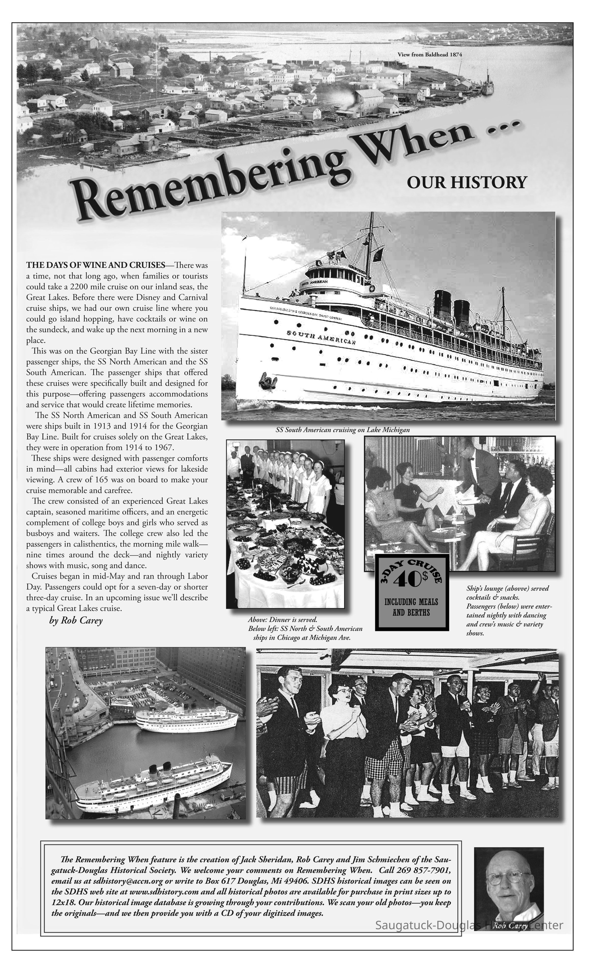 THE DAYS OF WINE AND CRUISES—There was a time, not that long ago, when families or tourists could take a 2200 mile cruise on our inland seas, the Great Lakes. Before there were Disney and Carnival cruise ships, we had our own cruise line where you could go island hopping, have cocktails or wine on the sundeck, and wake up the next morning in a new place. This was on the Georgian Bay Line with the sister passenger ships, the SS North American and the SS South American. The passenger ships that offered these cruises were specifically built and designed for this purpose—offering passengers accommodations and service that would create lifetime memories. The SS North American and SS South American were ships built in 1913 and 1914 for the Georgian Bay Line. Built for cruises solely on the Great Lakes, they were in operation from 1914 to 1967. These ships were designed with passenger comforts in mind—all cabins had exterior views for lakeside viewing. A crew of 165 was on board to make your cruise memorable and carefree. The crew consisted of an experienced Great Lakes captain, seasoned maritime officers, and an energetic complement of college boys and girls who served as busboys and waiters. The college crew also led the passengers in calisthenics, the morning mile walk—nine times around the deck—and nightly variety shows with music, song and dance. Cruises began in mid-May and ran through Labor Day. Passengers could opt for a seven-day or shorter three-day cruise. In an upcoming issue we’ll describe a typical Great Lakes cruise. by Rob Carey