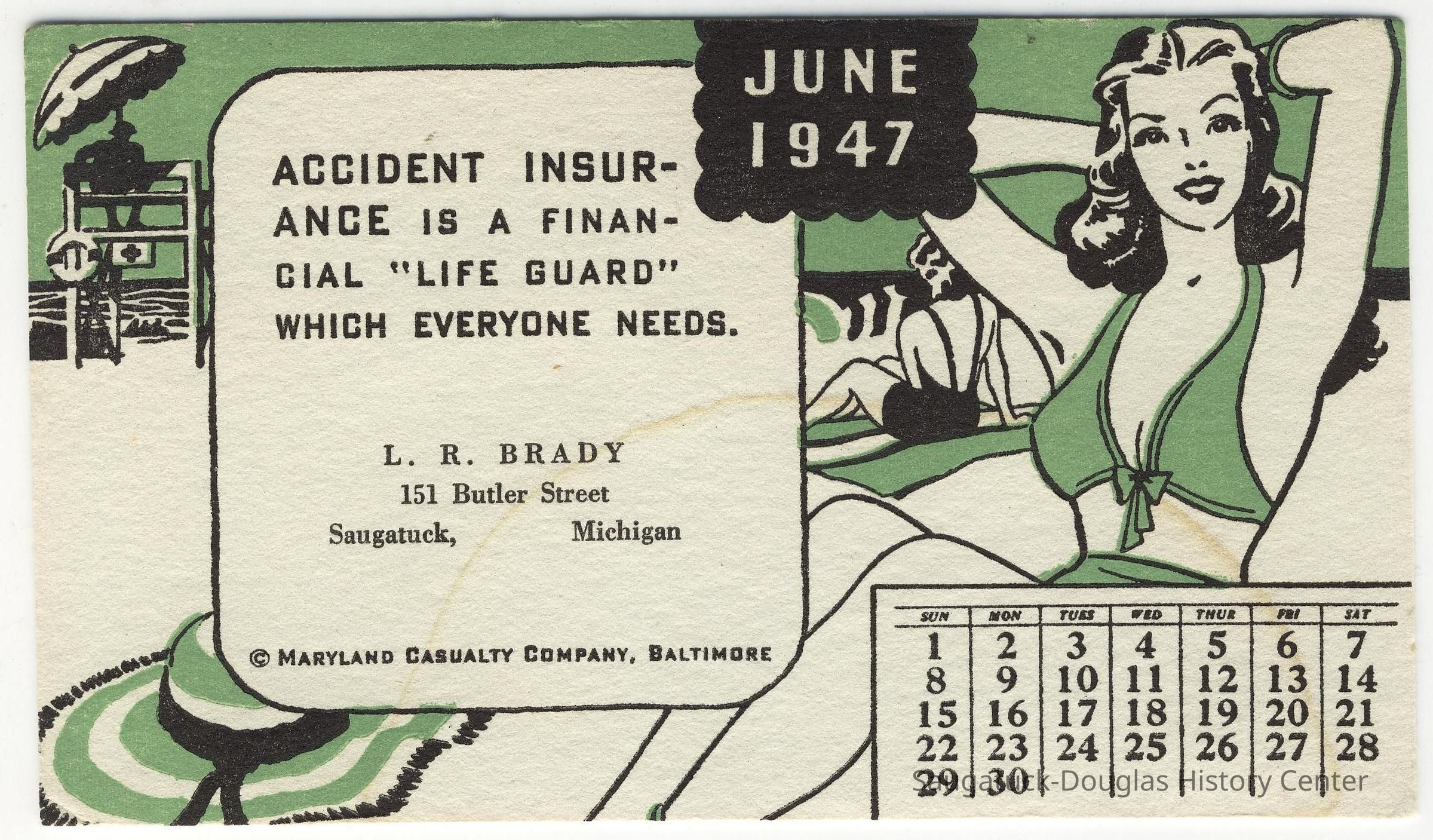 An ink blotter/calender from the L.R. Brady Insurance Co. for June 1947. It has an image of a girl in a green bathing suit and the words: Accident insurance is a financial "life guard" which everyone needs.