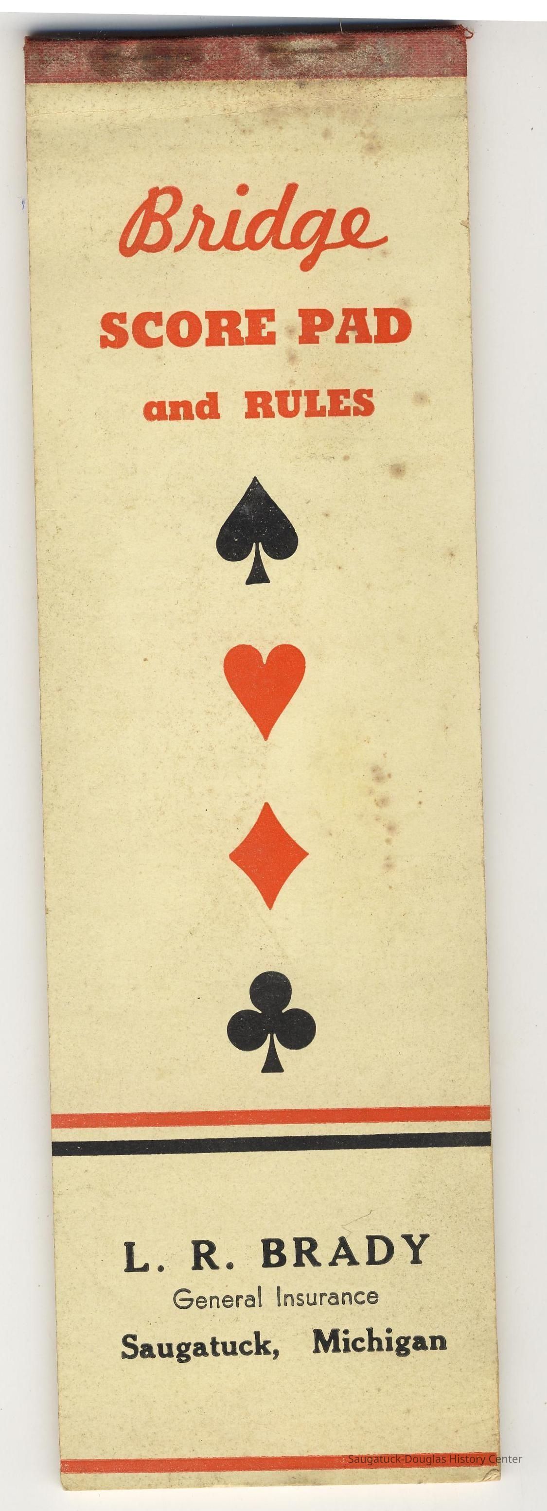 A red and black bridge score pad and rules from the L.R. Brady Insurance Co. Saugatuck, MI