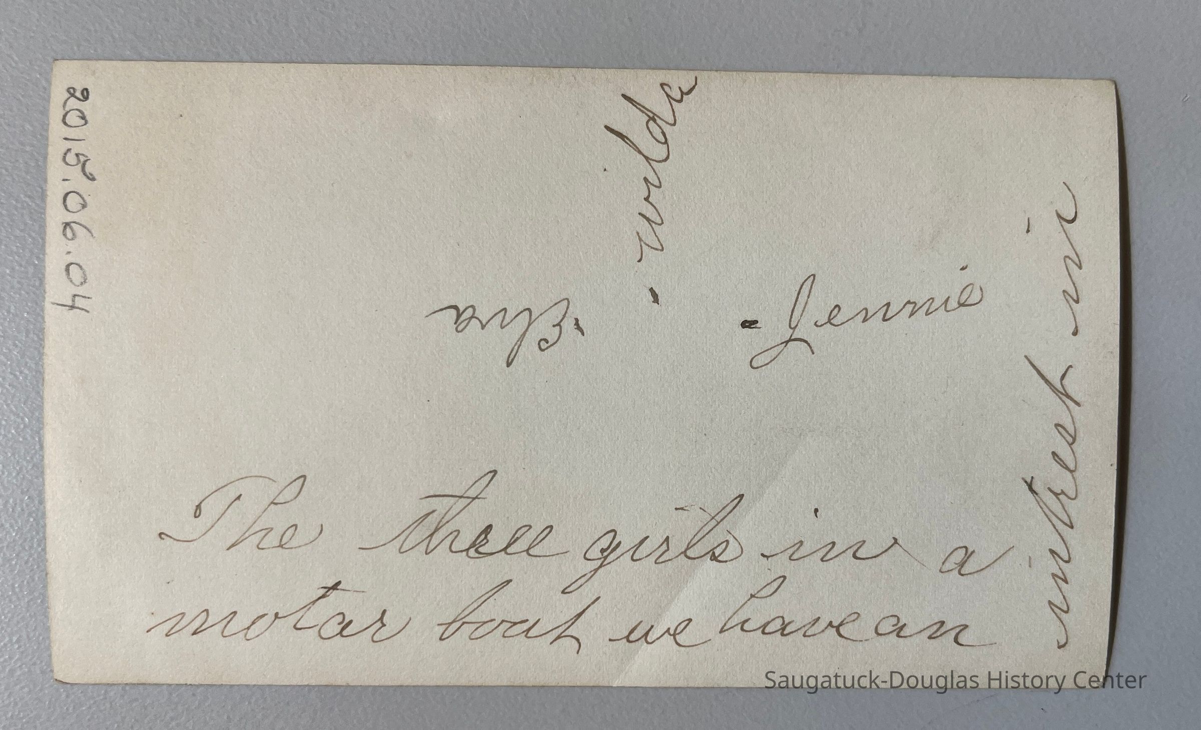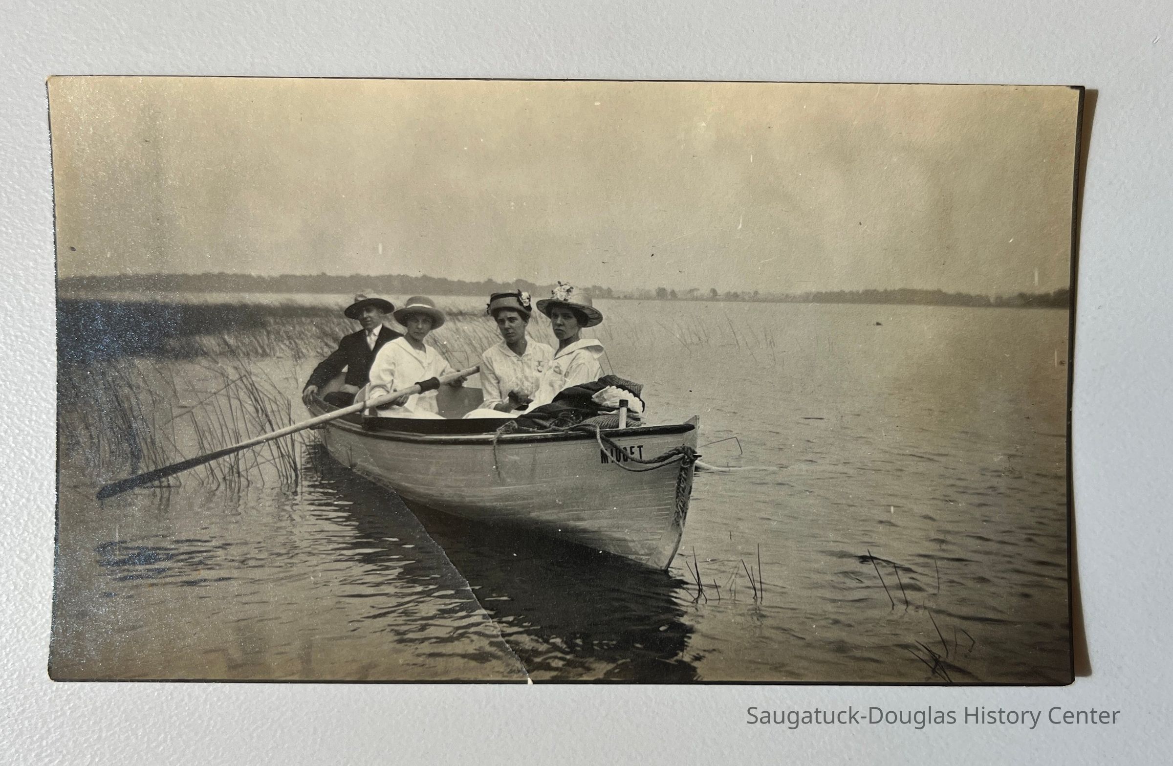 4" x 2 1/2" black and white photograph of four people in a row boat