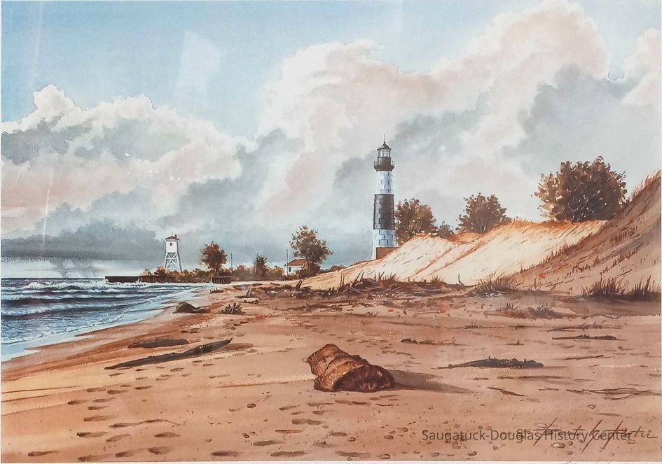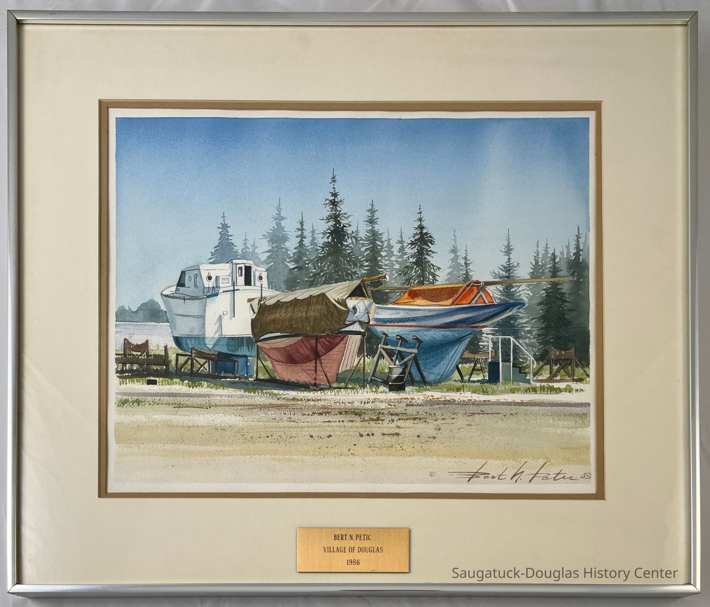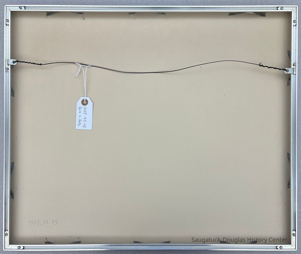 Framed behind glass with a double white and brown mats and .25" silver-tone metal frame. Attached to the glass is a gold-tone plaque that reads "Bert N. Petic, Village of Douglas, 1986"