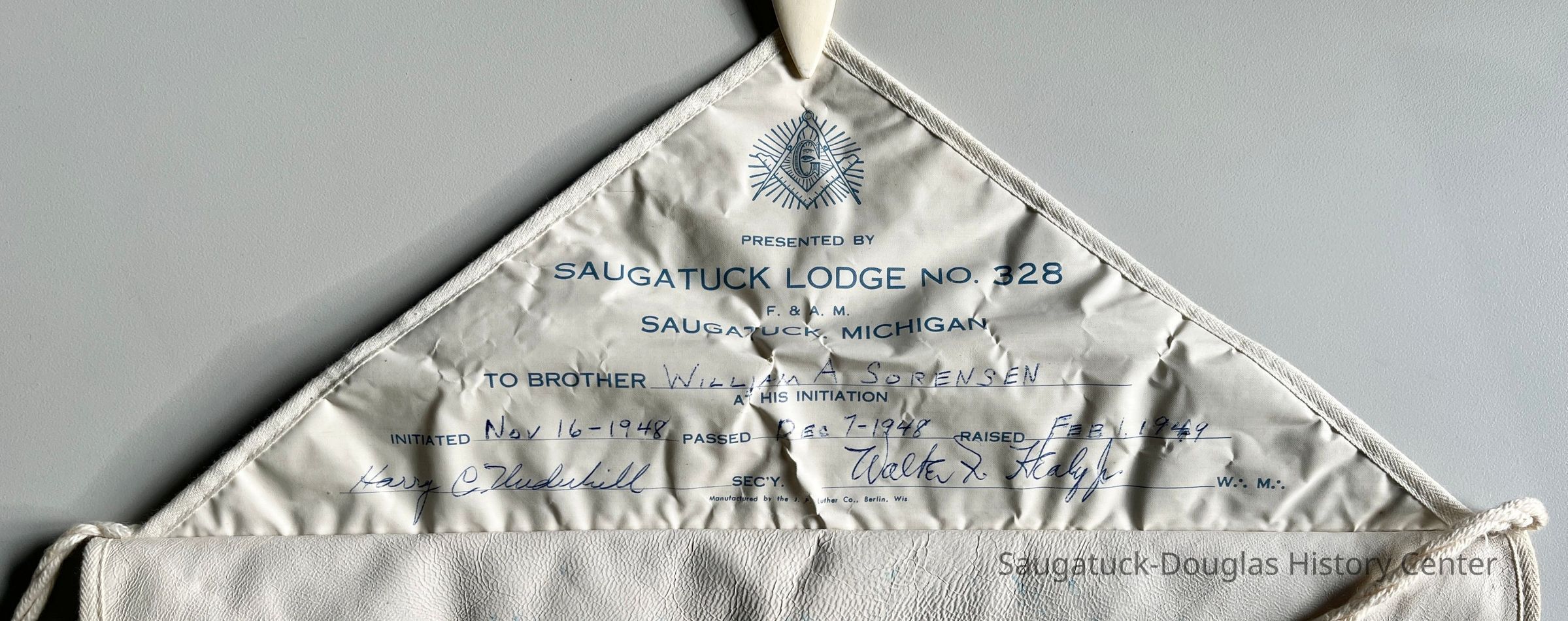White fabric and lambskin apron with long cords and tassels presented to William A. Sorensen at his initiation to the Saugatuck Masonic Lodge Number 328 on 16 Nov. 1948. The front flap of the apron is signed by Harry C. Underhill and Walter F. Healy [?] Jr.