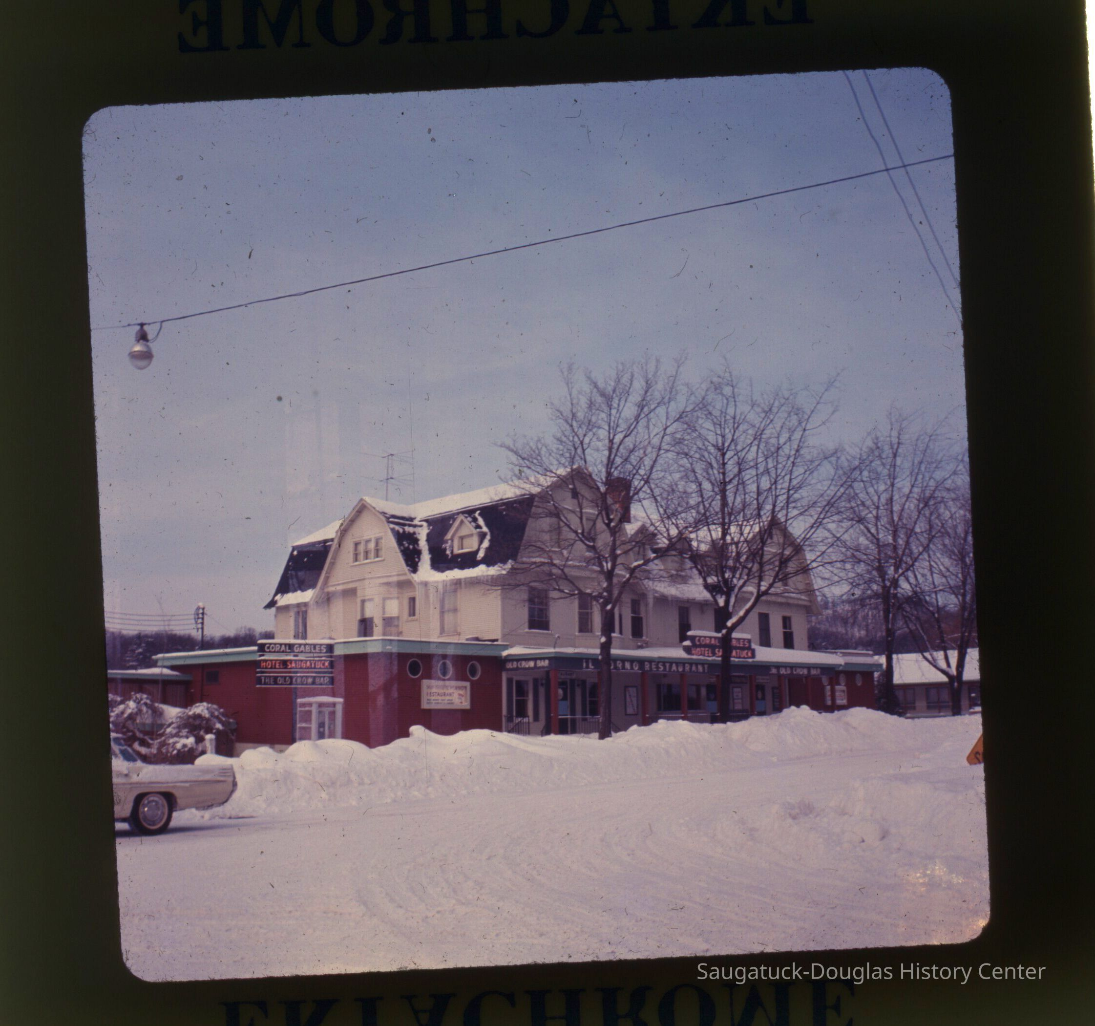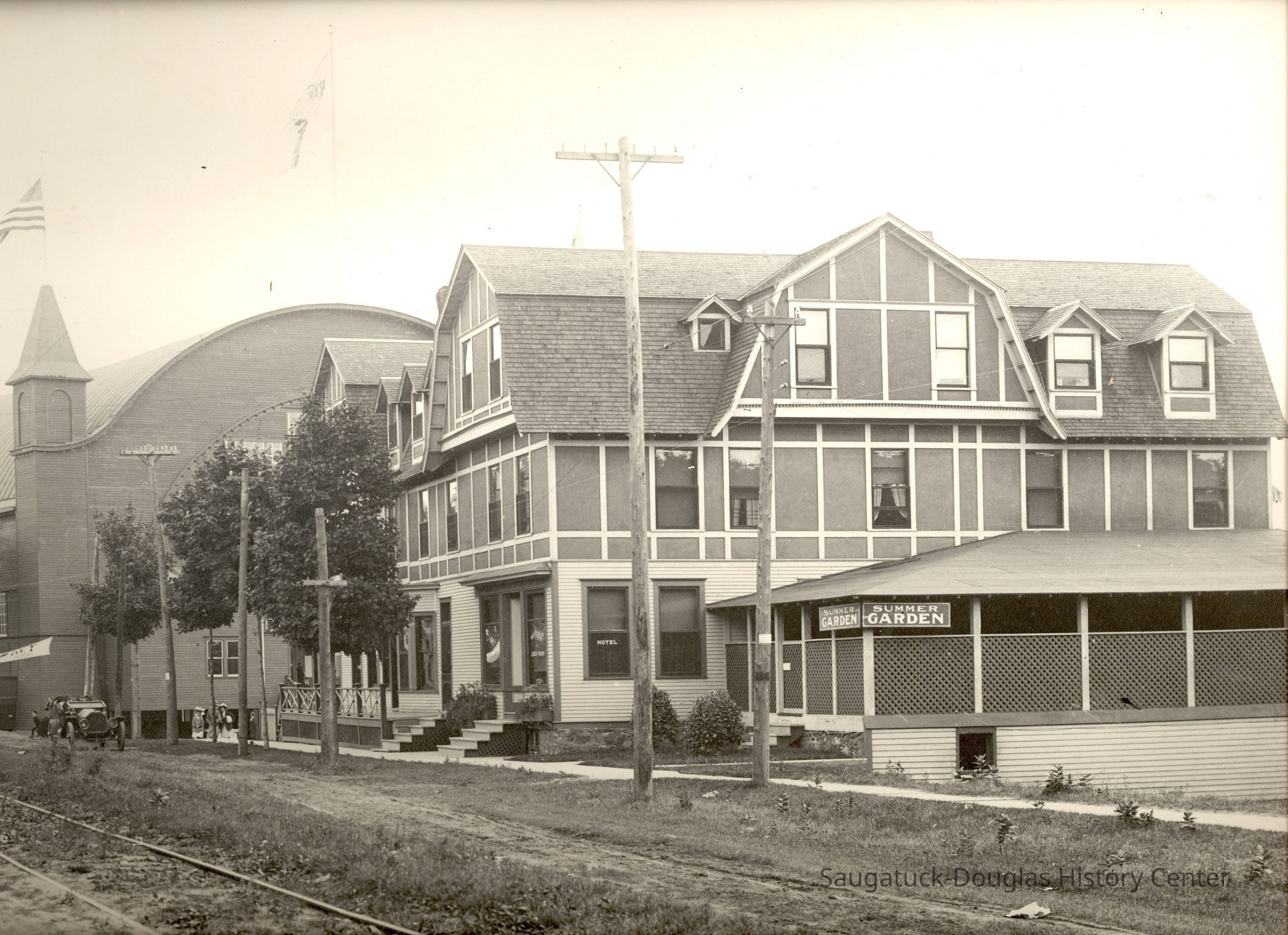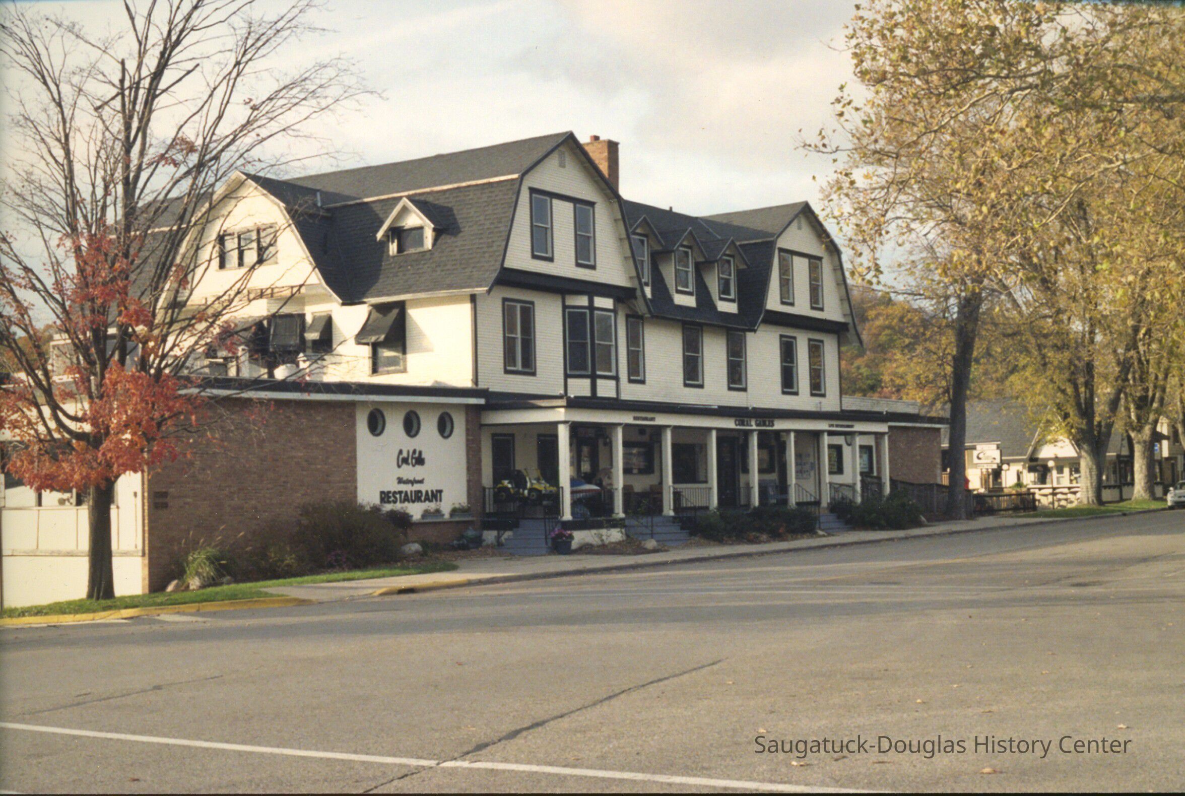 Images of the gambrel/Dutch colonial roofed building that is known today as the Coral Gables, or when it was the Hotel Saugatuck, the Columbia Hotel or Leiendecker's Inn on Water Street in Saugatuck.