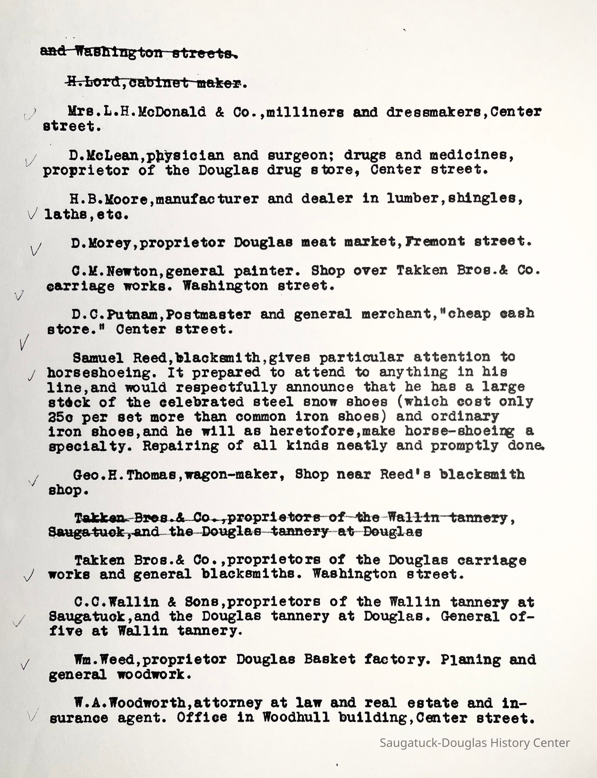 McLean, Daniel or DavidCrouse, Jonas S. 1824-1899Weed, William H. "Will" 1866-1909Red Ribbon Club DouglasKirby, John 1829-1882Thomas, George H.McDonald, Mrs. L.H.Kibby, Jervis H. 1843-1933Gray, Thomas 1820-1895Lord, H.Daniels, J.N.Ewald, LudwigHutchinson Bros. & Co.Woodworth, Warren A. 1836-1922Firman, N.C.Newton, C.M. or C.W.Reed, Samuel Caleb 1848-1923Gill, Willard Stevens 1828-1918C.C. Wallin & SonsMoore, Harry B.Dutcher Lodge building 1867-Takken Bros. & Co. 1879-Morey, DavidBillings, Nellie M. (Upson) 1862-1943Ox-Bow House/Old Library/Douglas Athletic Clubhouse/Methodist Episcopal Church