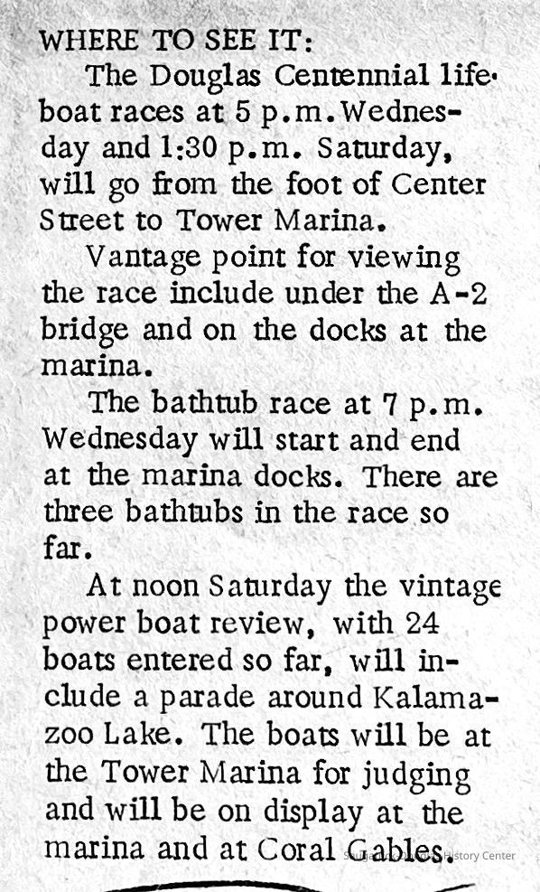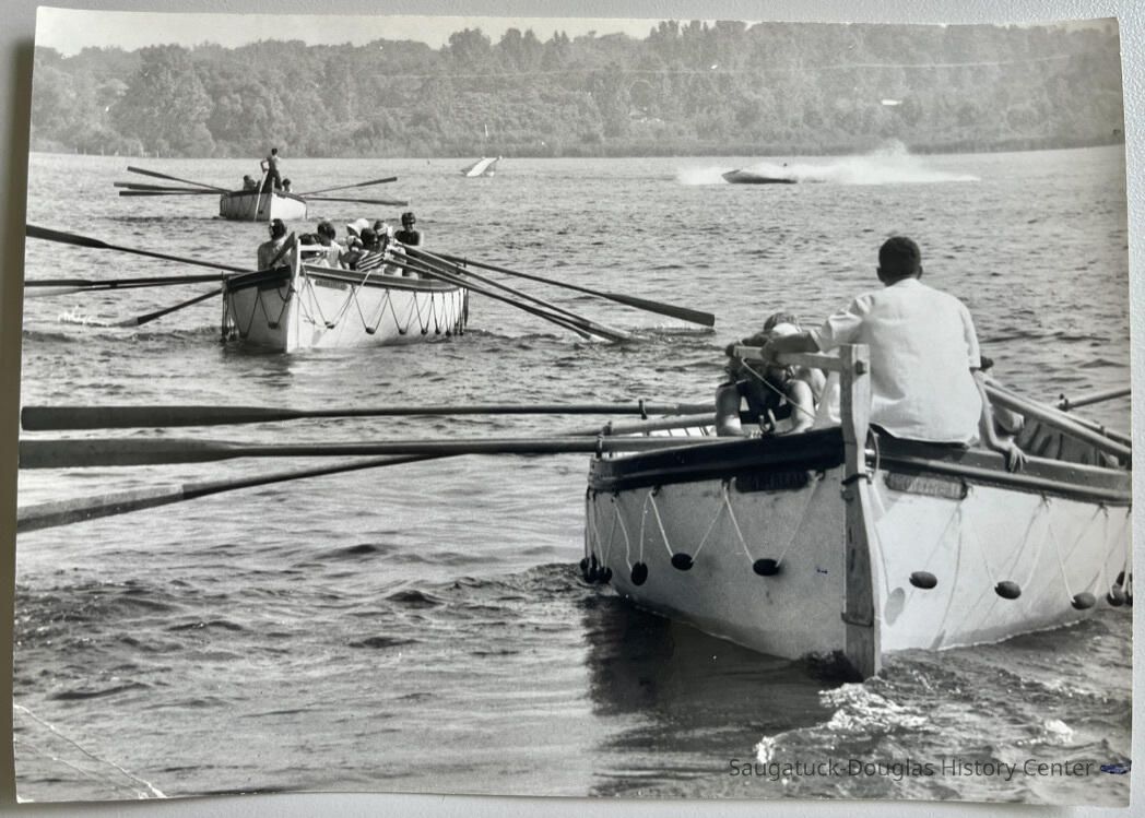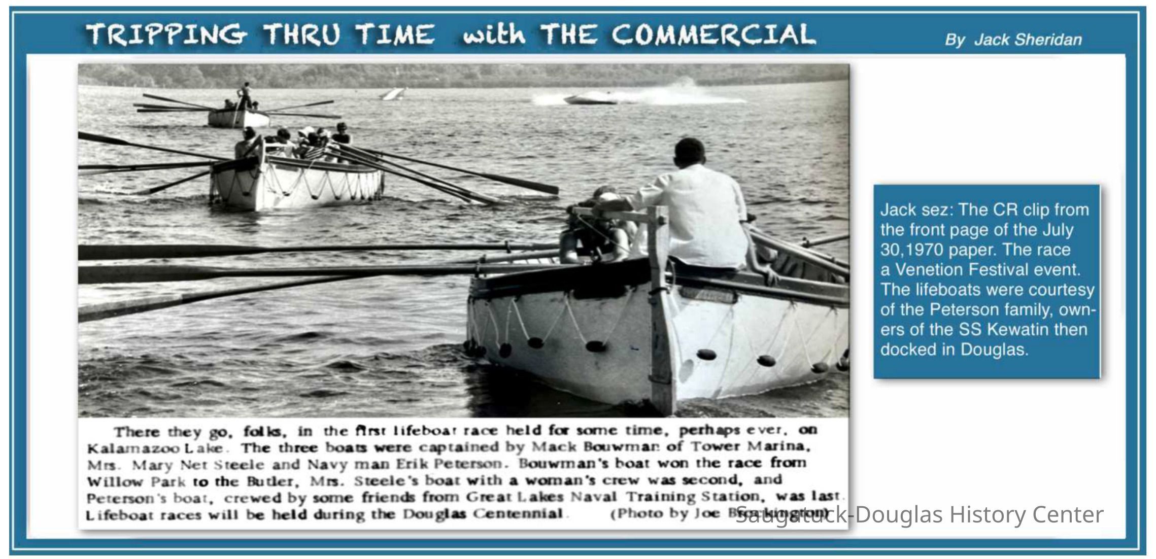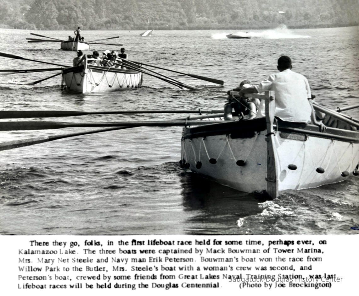 This photo ran in the July 30, 1970 Commercial Record with the caption "There they go, folks, in the first lifeboat race held for some time, perhaps ever, on Kalamazoo Lake. The tree boats were captained by Mack Bouwman of Tower Marina, Mrs. Mary Net Steele and Navy man Erik Peterson. Bouwman's boat won the race from Willow Park to the Butler, Mrs. Steele's boat with a woman's crew was second, and Peterson's boat, crewed by some friends from Great Lakes Naval Training Station, was last. Lifeboat races will be held during the Douglas Centennial. Photo by Joe Brockington."