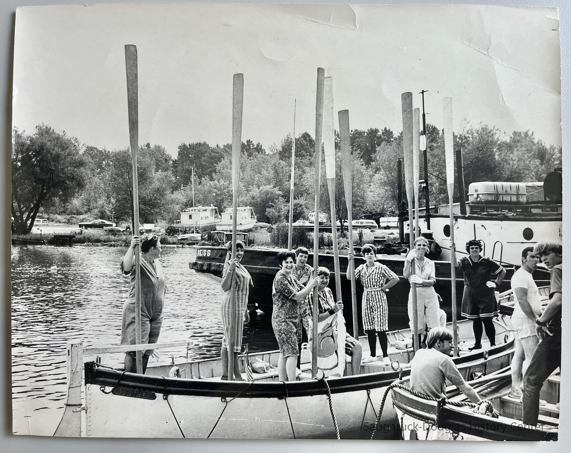 1. Eight women, some in historical costumes and gloves, stand proudly with their oars held vertically in a steamer-era lifeboat. The lifeboat has a nameplate "Montreal" on the stern by the rudder. Three men are in another lifeboat tied alongside. Behind the lifeboat is the tugboat Reiss and two River Queen houseboats are visible on the shore. Photo has print reproduction calculations written on the back and a stamp from the Prosch-Jensen's of Fennville. 8x10"