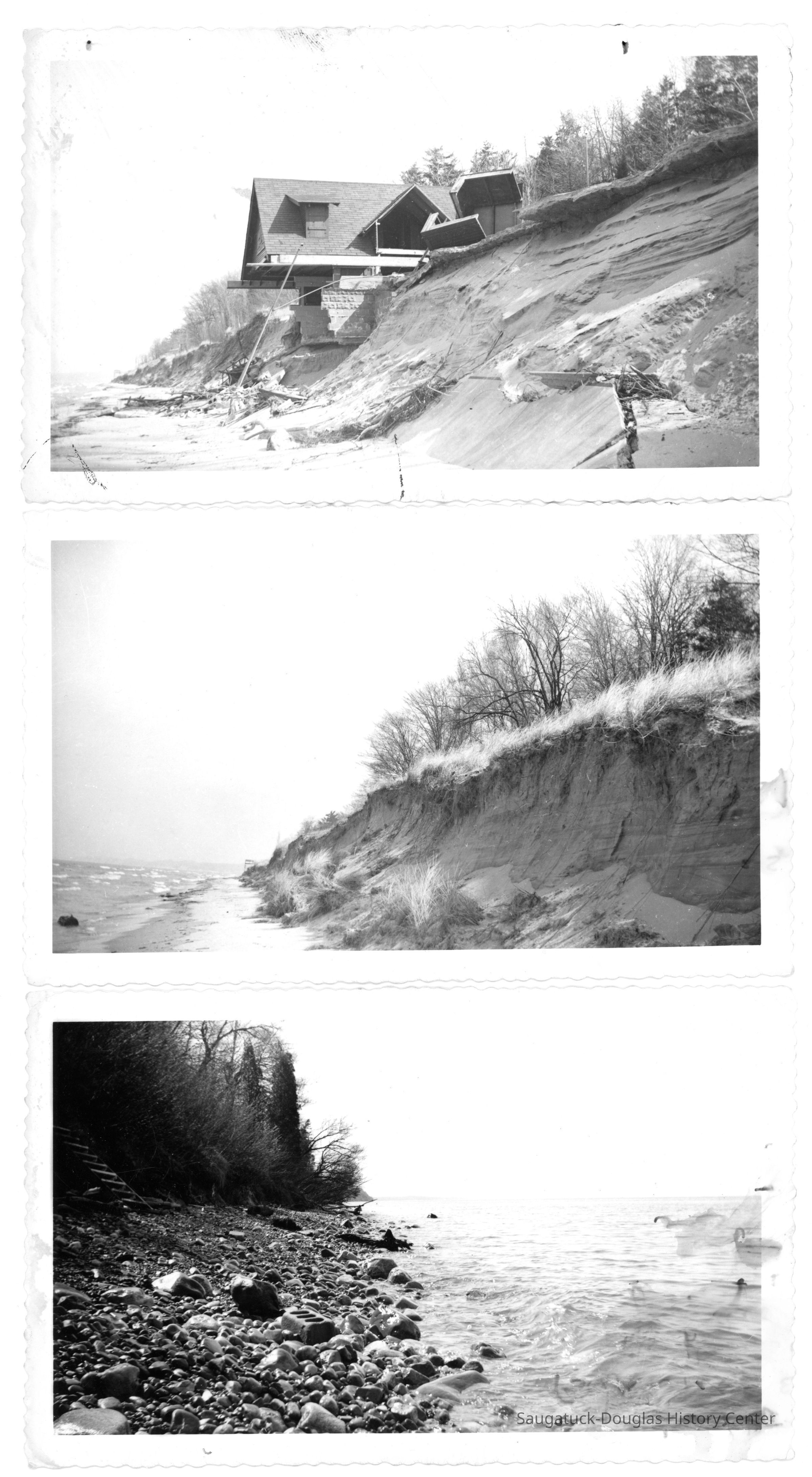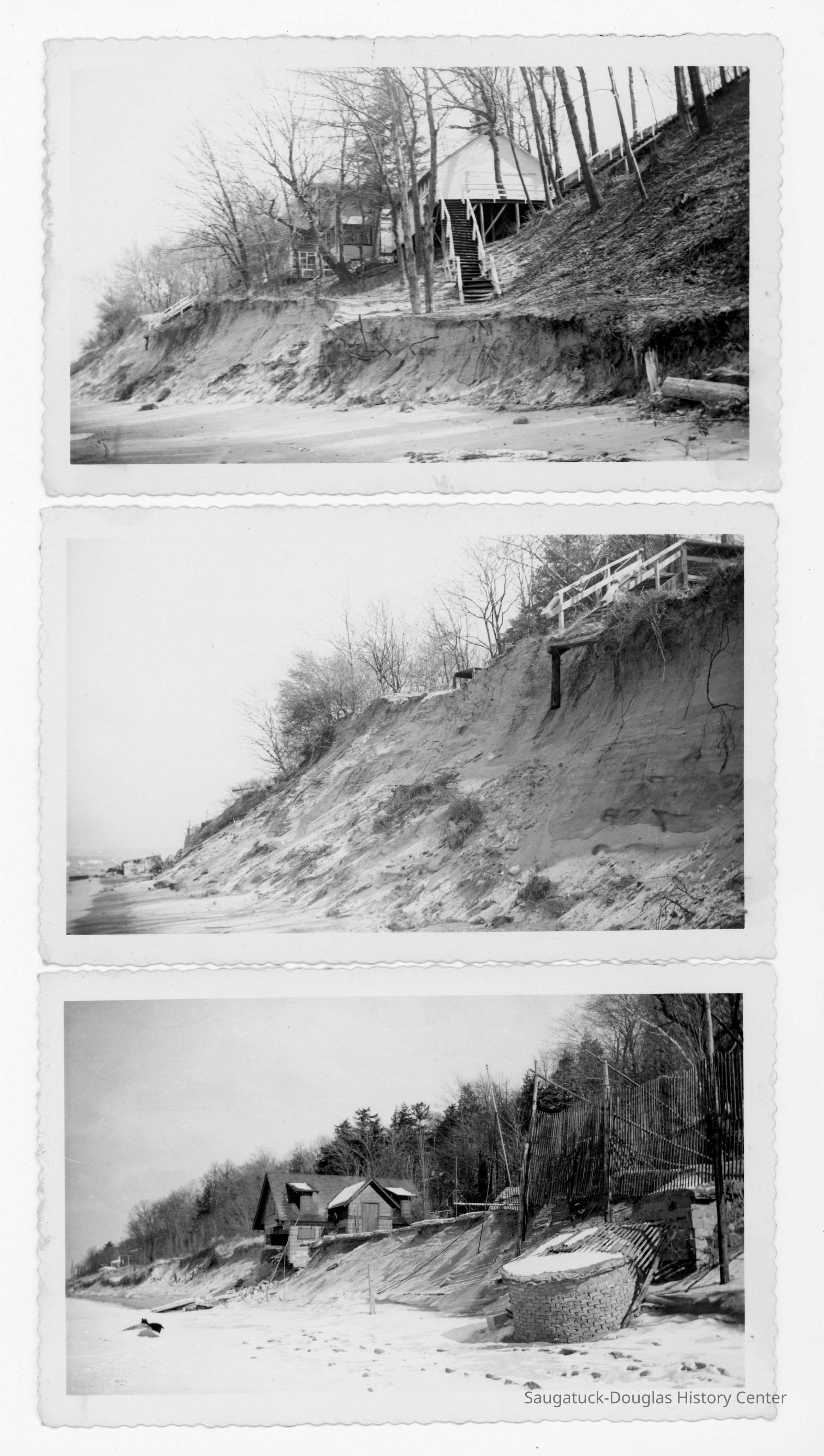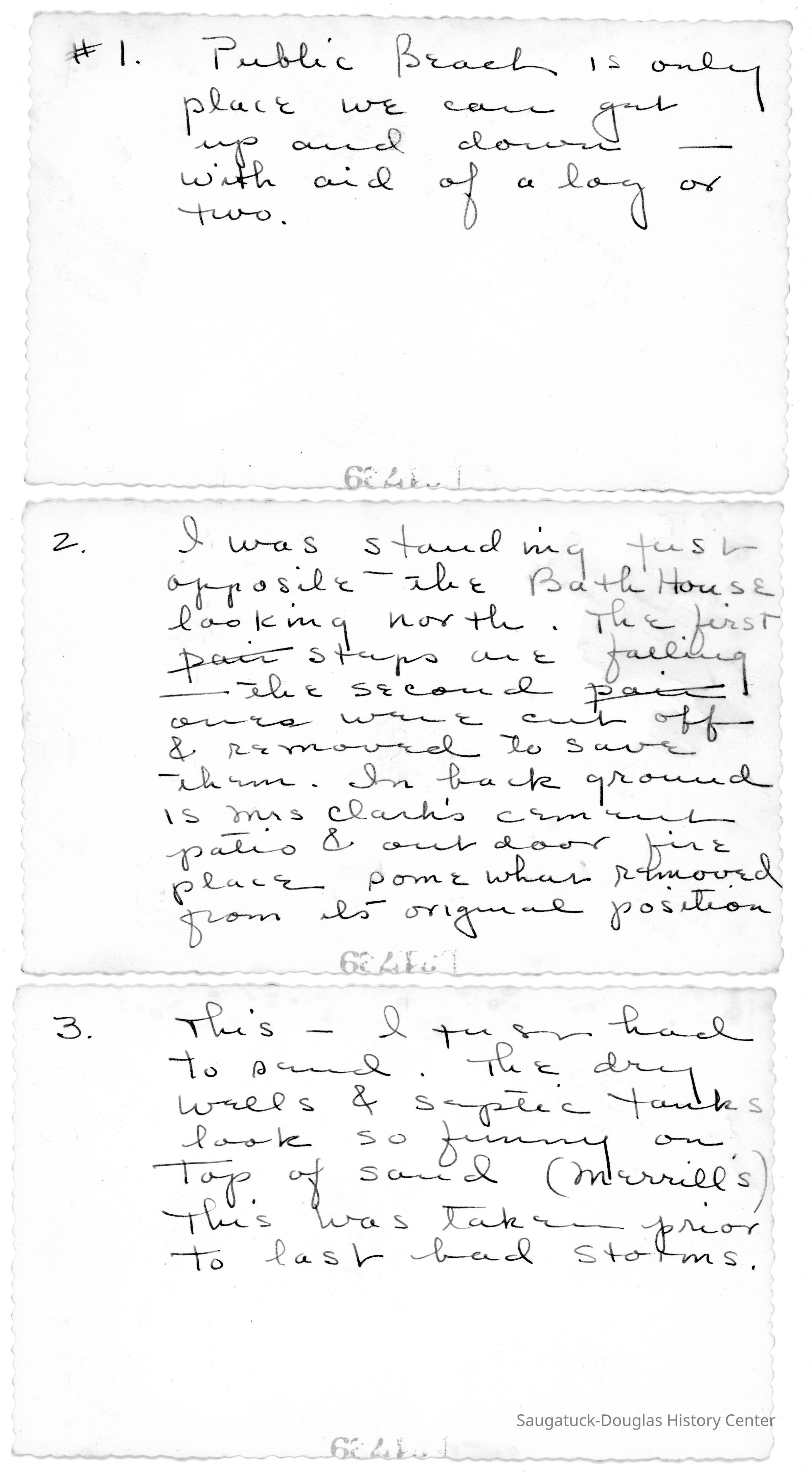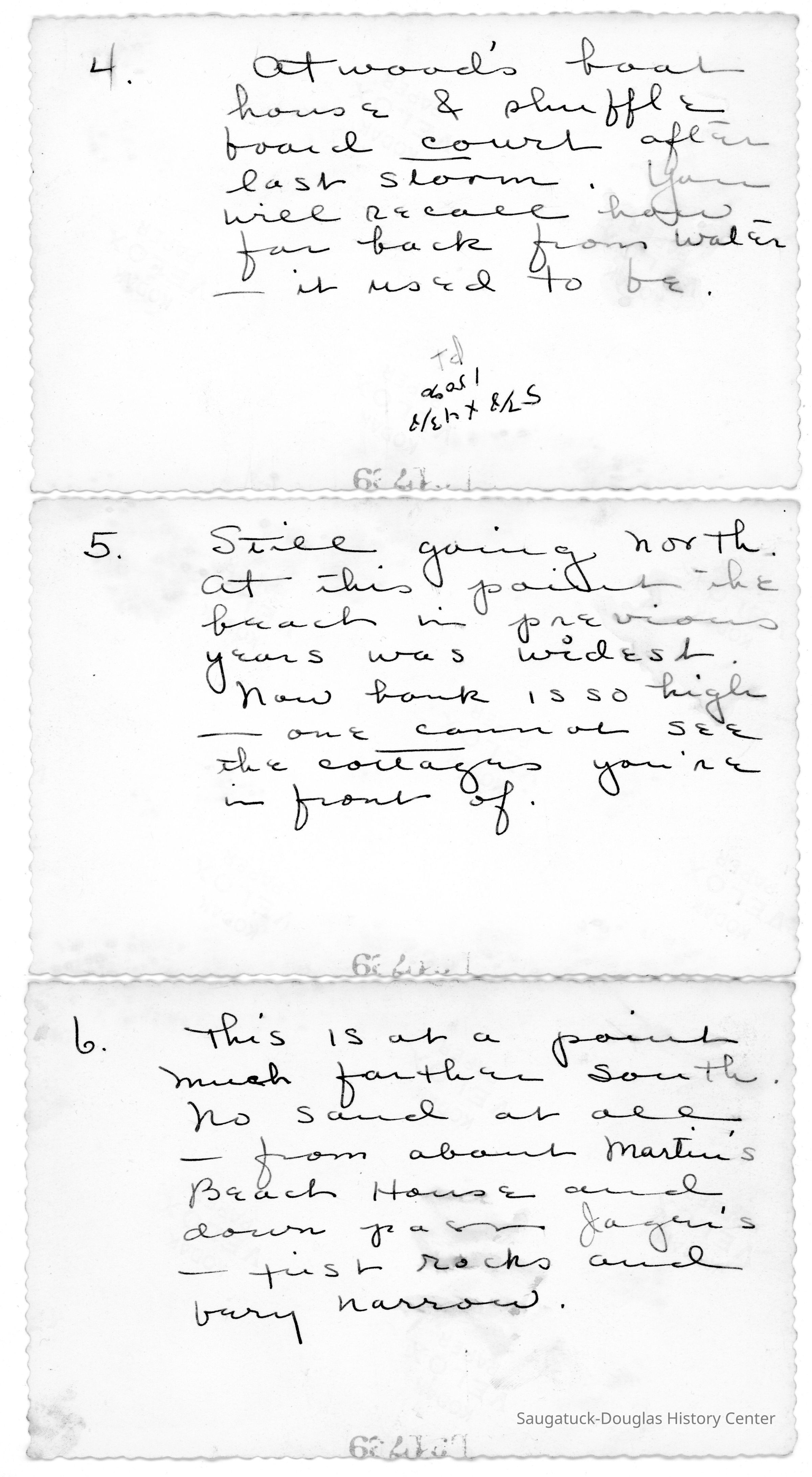 Six black-and-white photos of Douglas Beach. Each image has information handwritten on the back of the print. The notes describe the state of the beach after storms had eroded the dunes.