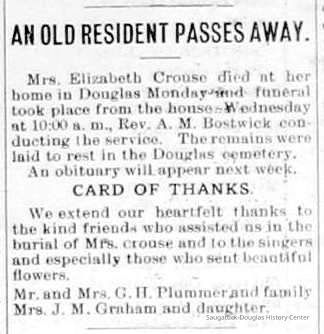 Lizzie Graham married Jonas S. Crouse of Douglas.