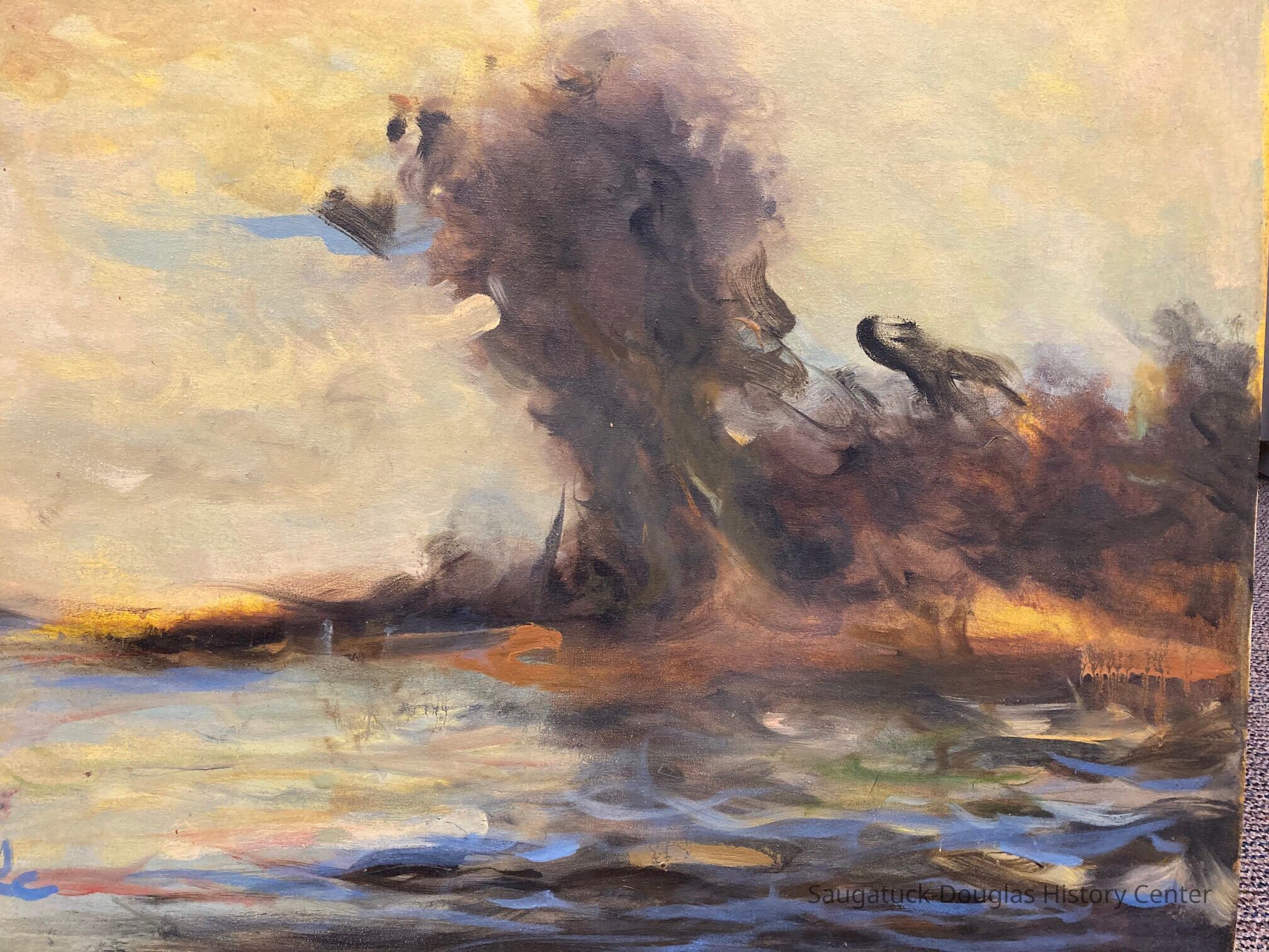Abstract paining of tree at waters edge by John Polka. Along with the canvas is a color photograph, that may be of the Ox-Bow lagoon or the Kalamazoo River, that was used as inspiration.