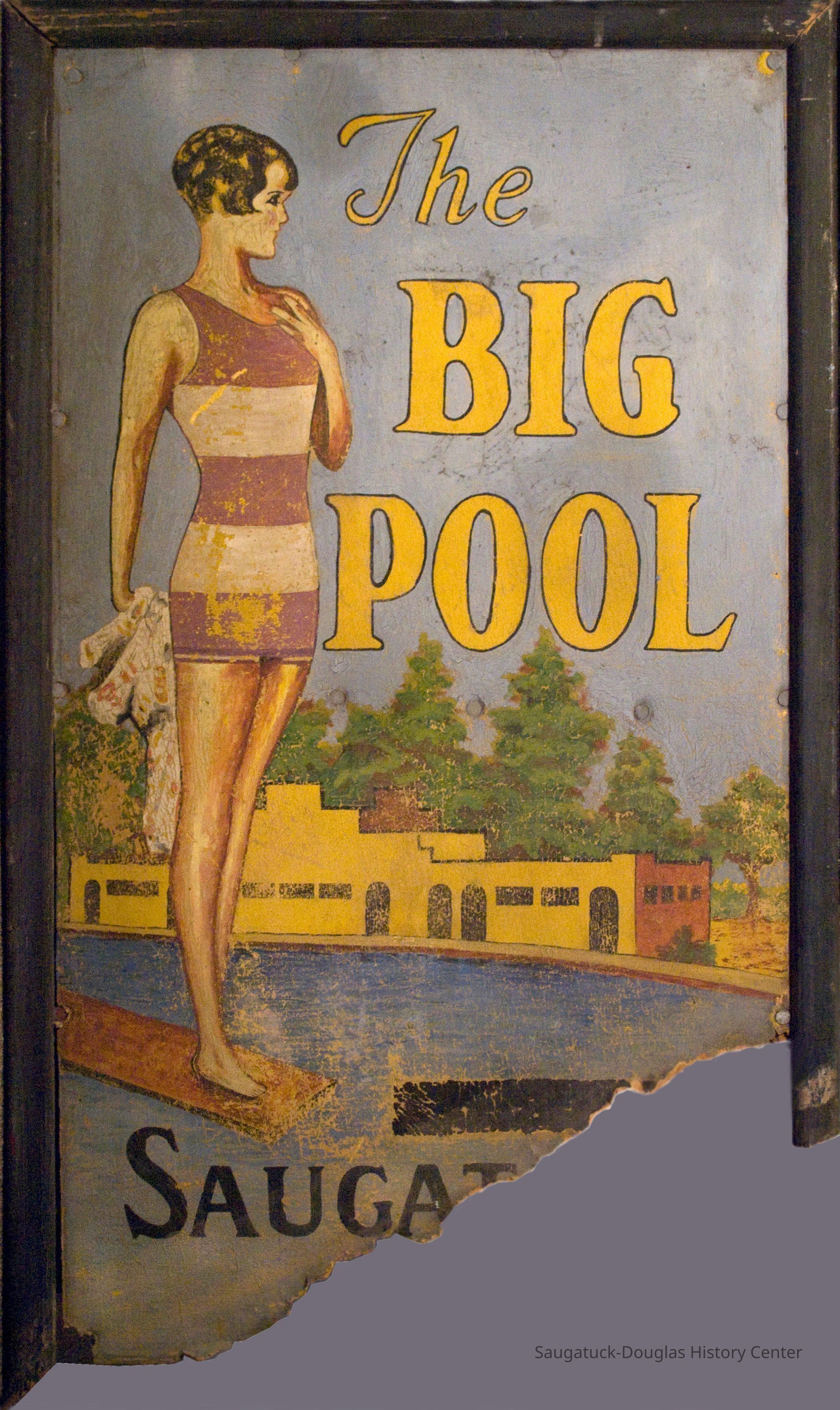 Interpretive notes from the 2008 "13 Moments in Time" exhibit: The Big Pool was built in 1927 on North Street near the old road to Holland. It was saucer-shaped with shallow water around the edges and deepest in the middle where there was a diving platform. Here the artist puts us on the diving board where a shapely female swimmer is thinking about making the plunge. Will she? Won't she? The dark line above the word "Saugatuck" was once an arrow pointing to the right. If the artist signed this painting, it was on the right hand corner which had been lost when it was discovered on the ash heap in the furnace room of a former newspaper office on Lake Street about 1970. One of the good things about having a town full of artists was their availability for signs and other artistic endeavors.