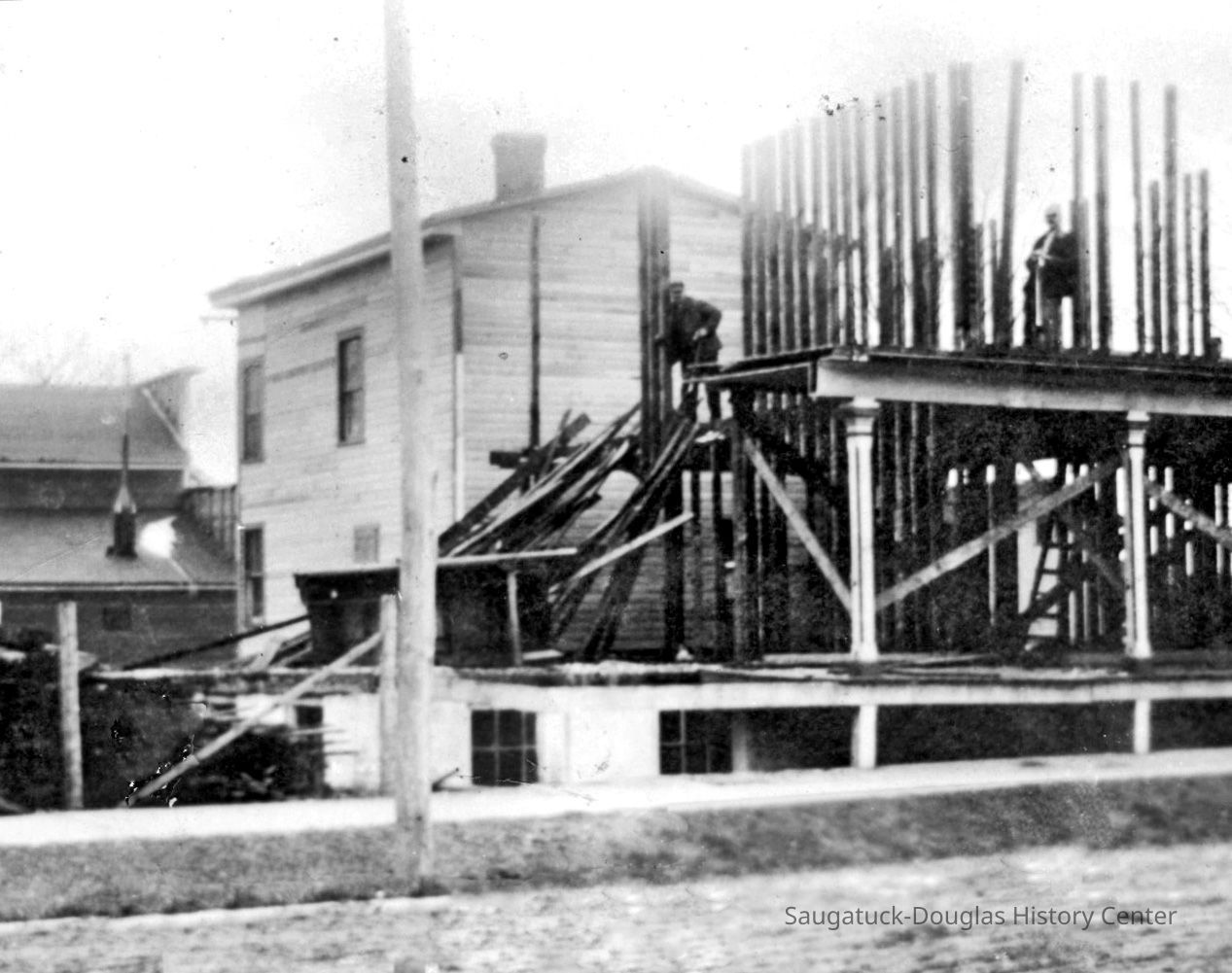 This image was featured as History Mystery #75 with the solution: The Hamilton Hotel - aka Saugatuck House, being torn down in 1913 to clear the way for the current Saugatuck Drug building on the corner of Butler and Mason Sts. The present Phil's building can be seen to the north