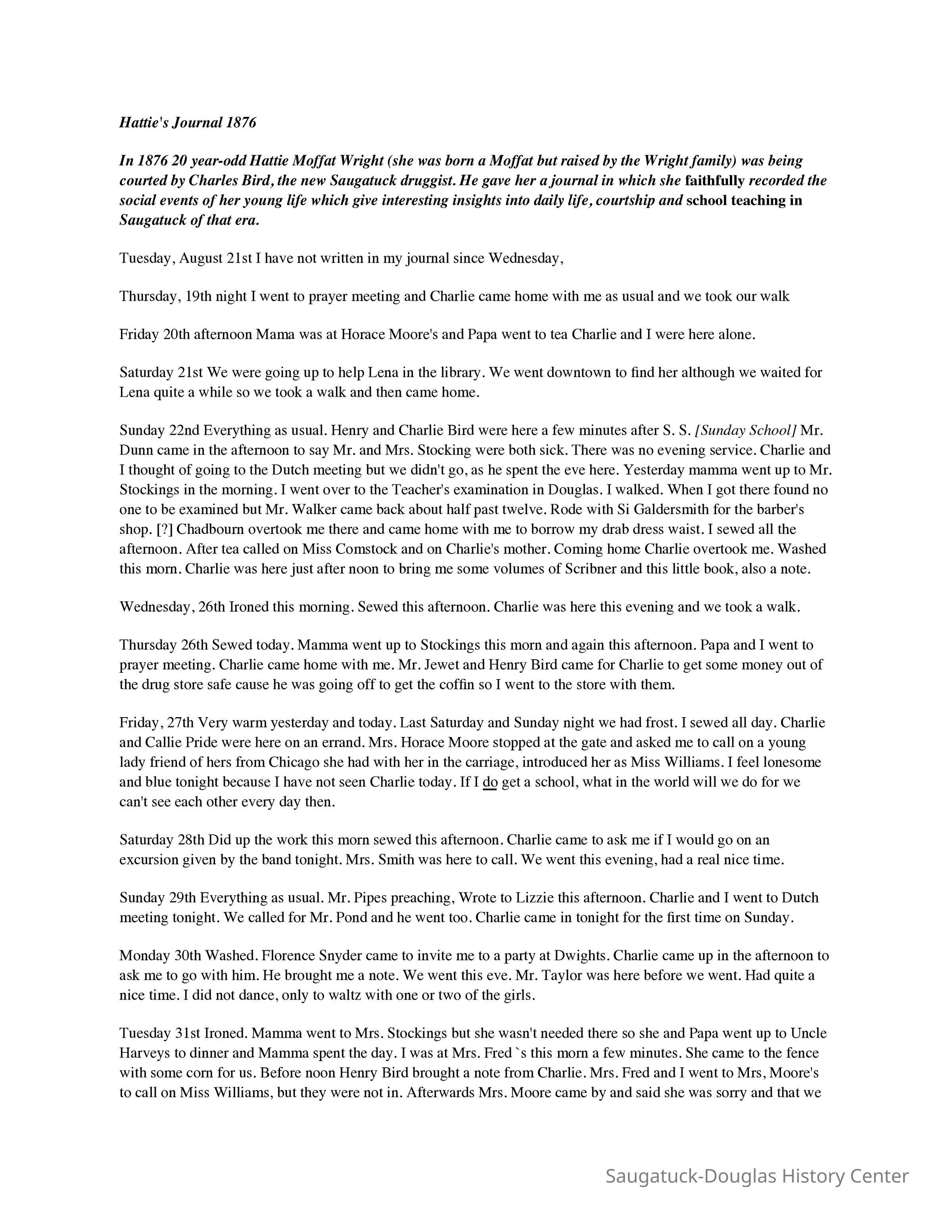 Hattie's Journal 1876 In 1876 20 year-odd Hattie Moffat Wright (she was born a Moffat but raised by the Wright family) was being courted by Charles Bird, the new Saugatuck druggist. He gave her a journal in which she faithfully recorded the social events of her young life which give interesting insights into daily life, courtship and school teaching in Saugatuck of that era. Tuesday, August 21st I have not written in my journal since Wednesday, Thursday, 19th night I went to prayer meeting and Charlie came home with me as usual and we took our walk Friday 20th afternoon Mama was at Horace Moore's and Papa went to tea Charlie and I were here alone. Saturday 21st We were going up to help Lena in the library. We went downtown to find her although we waited for Lena quite a while so we took a walk and then came home. Sunday 22nd Everything as usual. Henry and Charlie Bird were here a few minutes after S. S. [Sunday School] Mr. Dunn came in the afternoon to say Mr. and Mrs. Stocking were both sick. There was no evening service. Charlie and I thought of going to the Dutch meeting but we didn't go, as he spent the eve here. Yesterday mamma went up to Mr. Stockings in the morning. I went over to the Teacher's examination in Douglas. I walked. When I got there found no one to be examined but Mr. Walker came back about half past twelve. Rode with Si Galdersmith for the barber's shop. [?] Chadbourn overtook me there and came home with me to borrow my drab dress waist. I sewed all the afternoon. After tea called on Miss Comstock and on Charlie's mother. Coming home Charlie overtook me. Washed this morn. Charlie was here just after noon to bring me some volumes of Scribner and this little book, also a note. Wednesday, 26th Ironed this morning. Sewed this afternoon. Charlie was here this evening and we took a walk. Thursday 26th Sewed today. Mamma went up to Stockings this morn and again this afternoon. Papa and I went to prayer meeting. Charlie came home with me. Mr. Jewet and Henry Bird came for Charlie to get some money out of the drug store safe cause he was going off to get the coffin so I went to the store with them. Friday, 27th Very warm yesterday and today. Last Saturday and Sunday night we had frost. I sewed all day. Charlie and Callie Pride were here on an errand. Mrs. Horace Moore stopped at the gate and asked me to call on a young lady friend of hers from Chicago she had with her in the carriage, introduced her as Miss Williams. I feel lonesome and blue tonight because I have not seen Charlie today. If I do get a school, what in the world will we do for we can't see each other every day then. Saturday 28th Did up the work this morn sewed this afternoon. Charlie came to ask me if I would go on an excursion given by the band tonight. Mrs. Smith was here to call. We went this evening, had a real nice time. Sunday 29th Everything as usual. Mr. Pipes preaching, Wrote to Lizzie this afternoon. Charlie and I went to Dutch meeting tonight. We called for Mr. Pond and he went too. Charlie came in tonight for the first time on Sunday. Monday 30th Washed. Florence Snyder came to invite me to a party at Dwights. Charlie came up in the afternoon to ask me to go with him. He brought me a note. We went this eve. Mr. Taylor was here before we went. Had quite a nice time. I did not dance, only to waltz with one or two of the girls. Tuesday 31st Ironed. Mamma went to Mrs. Stockings but she wasn't needed there so she and Papa went up to Uncle Harveys to dinner and Mamma spent the day. I was at Mrs. Fred `s this morn a few minutes. She came to the fence with some corn for us. Before noon Henry Bird brought a note from Charlie. Mrs. Fred and I went to Mrs, Moore's to call on Miss Williams, but they were not in. Afterwards Mrs. Moore came by and said she was sorry and that we must come up this eve. So we went. While I was gone Florence Snyder and Belle Shores came to see about the picnic tomorrow. Mrs. Fred came in with me when we came from Mrs. Moores. Wednesday, 1st September Went to the picnic today. Had a glorious time. Nobody but women invited so we could cut up as we pleased. Charlie was here this eve. I met him at the gate and he kissed me. He invited me to his house tomorrow. Thursday 2nd Went to Mrs. Prides this morning and ironed for her cause her baby is sick. She gave me a chemise that was too small for her. Annie Taylor called this afternoon, also Mrs. Moore and Miss Williams. Went to Charlie's to tea, from there to prayer meeting. We went to Prides before we came home to see how the baby was. Some girls serenaded me with tin horns. Friday Sewed most all day. Charlie Pride and Collie brought me a note from Charles saying he couldn't come tonight but would come tomorrow and wanted me to meet him at the gate. I went over to Maxon's [with ?J some tomatoes this eve. Have just written to Charles. Saturday 4th Did up the work this morn. Reca Cheesen was here after dinner. Mrs. Grant called shortly after she left. Mamma was up at Mrs. Taylors to get her to help her mend papa's coat. Grace and Mable came with their father to bring mamma home. We gave them our kitten, Robbie. The band played this evening and met Charlie at the gate and we went walking to hear it play. It is quite cool this eve. Mr. King caught a man in one of his apple trees tonight. Sunday 5th Marcia was at church today and Tedmon was also home. He was there with Jennie Smalley tonight. John Underwood was there tonight. I have lost that little pin of Charlie's again and must go and look for it in the morning. Monday 6th Went and looked for Charlie's pin the first thing this morn, but did not find it. We washed this morn. This afternoon Mrs. Frank Johnson and her mother, Mrs. Hilbrook called. Mr. Pride brought me a note from Charlie saying he was going out on the lakeshore to Mr. Gill's to get Mr. Prides rag carpet and would take me. So this evening we went. Had a glorious ride. When we came back we called on his cousin Lillie. Then Charlie