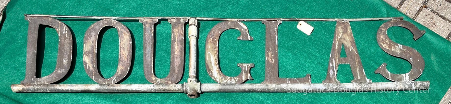 Metal final that adorned the top of the siren tower at the NW corner of Beery Field. The flat metal and plumbing pipe sign spells out the name "DOUGLAS" in capital letters. The items was called a directional wind spinner in local newspaper coverage.