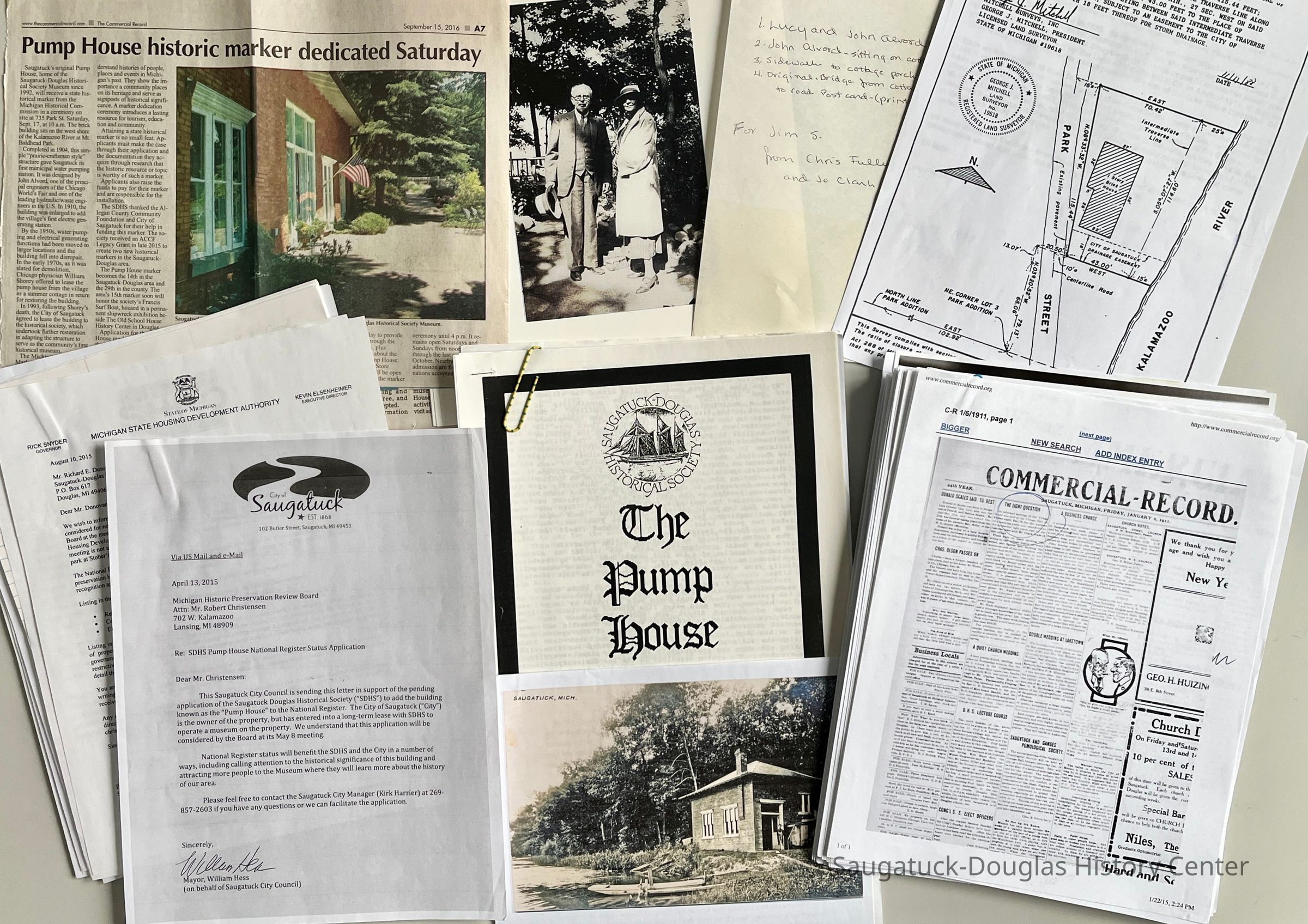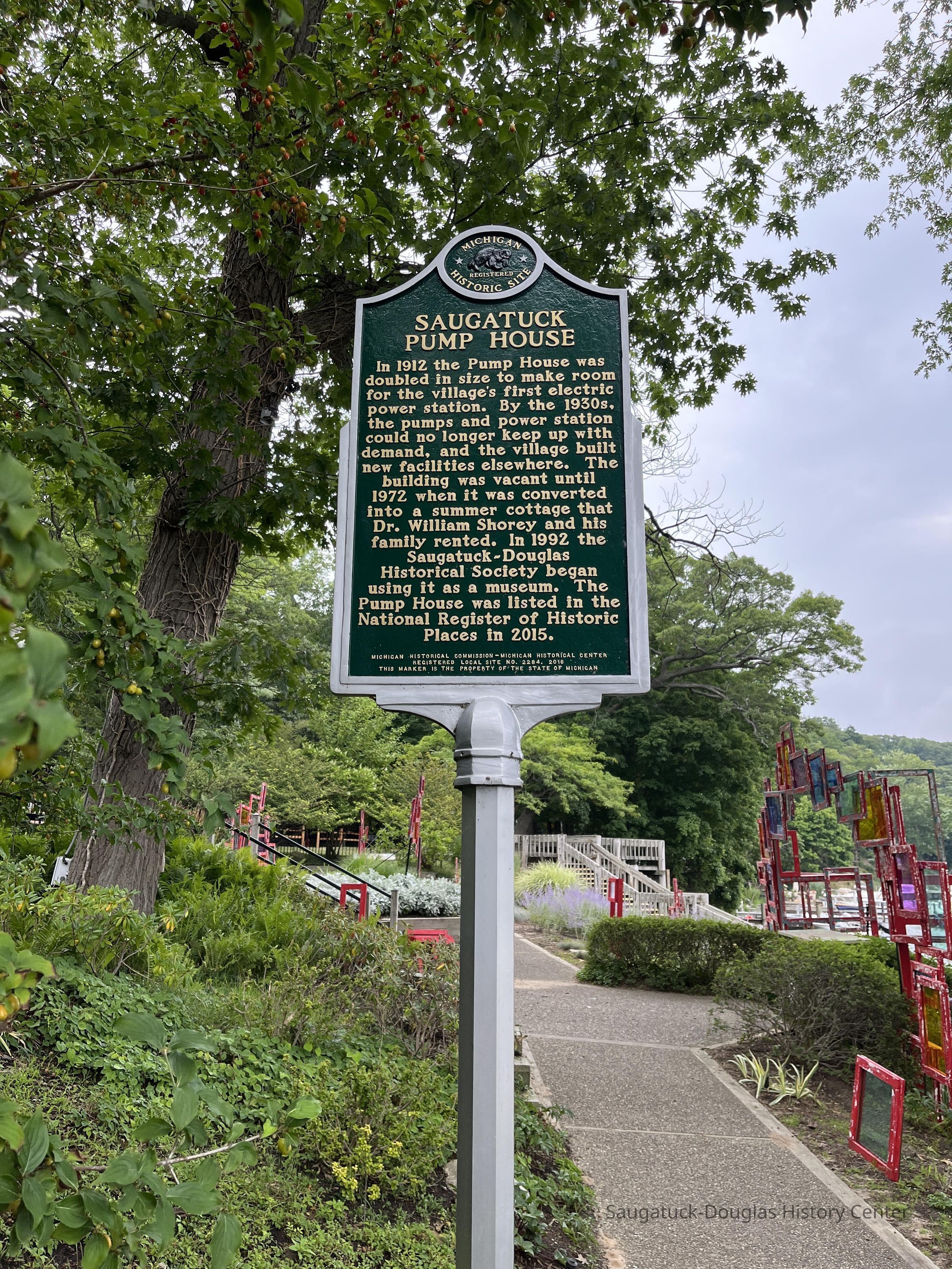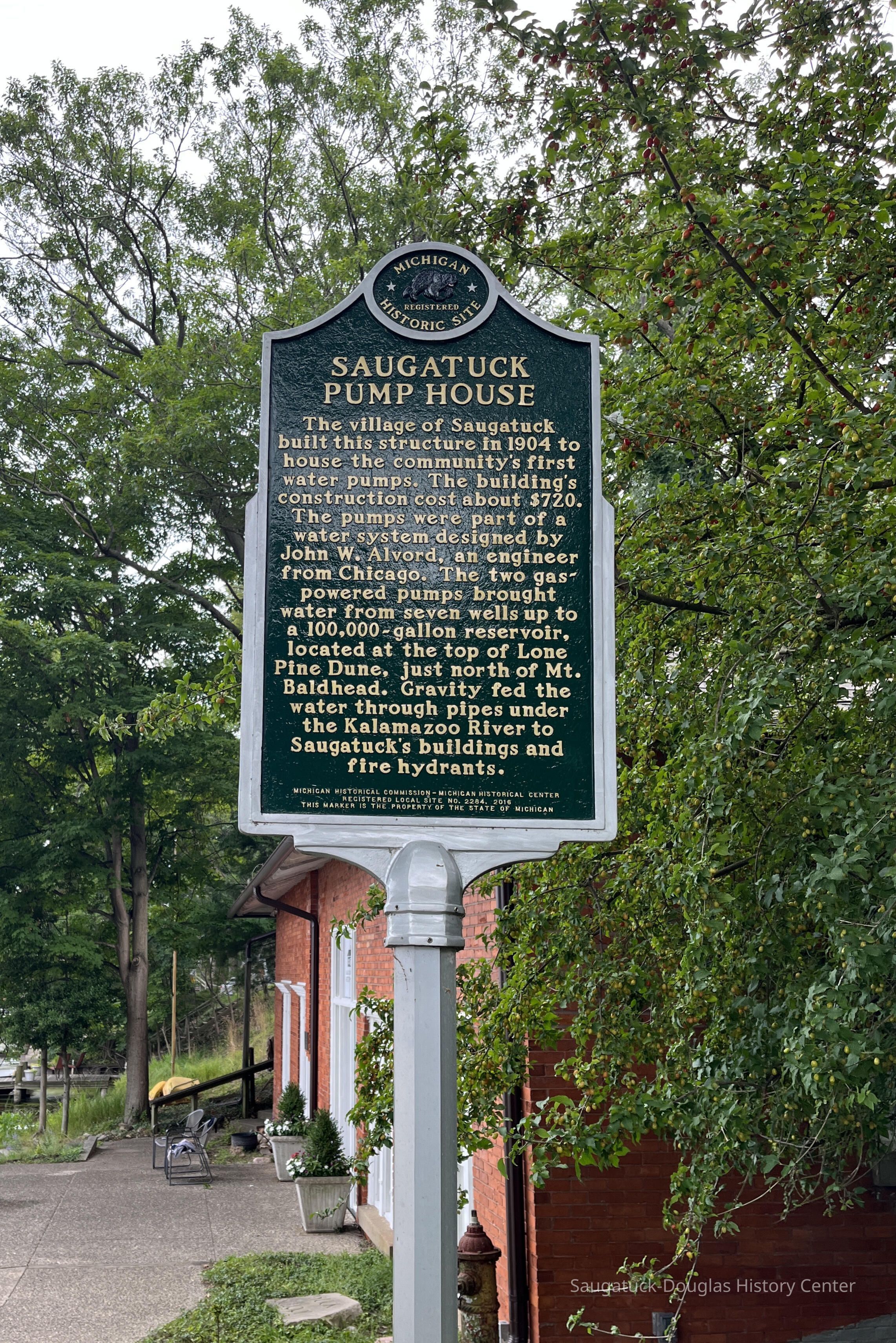 Marker text: Saugatuck Pump House: The village of Saugatuck built this structure in 1904 to house the community’s first water pumps. The building’s construction cost about $720. The pumps were part of a water system designed by John W. Alvord, an engineer from Chicago. The two gas-powered pumps brought water from seven wells up to a 100,000-gallon reservoir, located at the top of Lone Pine Dune, just north of Mt. Baldhead. Gravity fed the water through pipes under the Kalamazoo River to Saugatuck’s buildings and fire hydrants. Saugatuck Pump House: In 1912 the Pump House was doubled in size to make room for the village’s first electric power station. By the 1930s, the pumps and power station could no longer keep up with demand, and the village built new facilities elsewhere. The building was vacant until 1972 when it was converted into a summer cottage that Dr. William Shorey and his family rented. In 1992 the Saugatuck-Douglas Historical Society began using it as a museum. The Pump House was listed in the National Register of Historic Places in 2015.