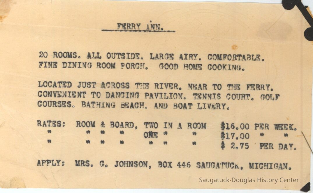 This building, on the northwest corner of Perryman and Park Streets in Saugatuck is the Beachway Inn today. It was built around 1905. At that time, the address for the property was 111 Lincoln Road. Today the address is 106 Perryman.